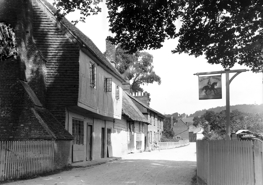 Aldbury Valiant Trooper. A village street lined with buildings, some of the shutters are open. The public house sign on the right hand side of the frame is behind a picket fence. An old fashioned style vehicle can be seen in the distance behind the pub sign with the name 'Lawson' on the side.