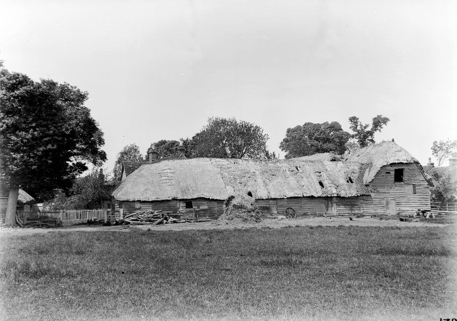- Title: From Vol 8 Slide 1791 Marsworth: Old Farm from field. A view of a large dilapidated farm building with wooden walls and thatched roof that has a few holes in it. It is in a field and you can clearly see a log pile, wheel and a haystack.