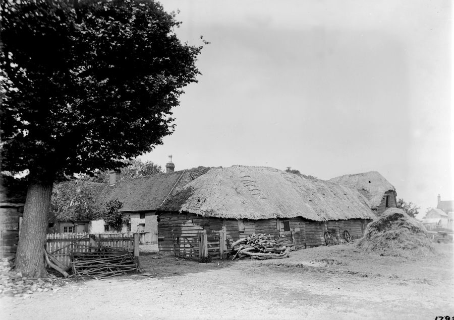 - Title: From Vol 8 Slide 1792 Marsworth: Old Farm. A corner view of a large farm building with one part having wooden walls and thatched roof, and other parts being constructed from whitewashed stone and slate. You can clearly see a log pile, two wheels laid against the walls and a haystack. A large tree frames the image on the left hand side.