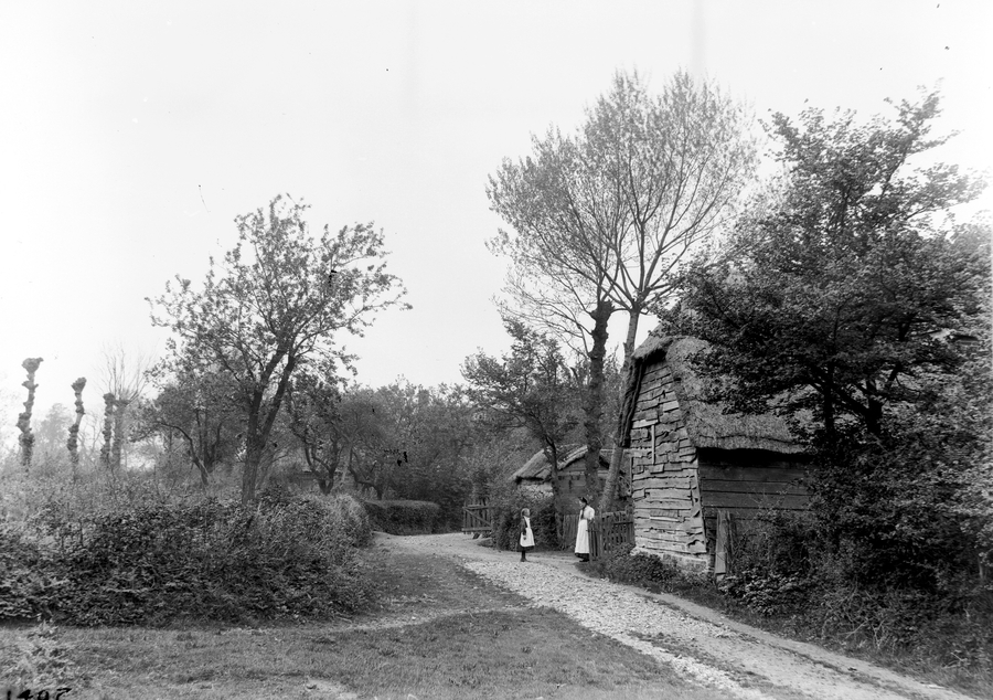 - Title: From Vol 6 Slide 1407 Milstone, Bucks (sic): Old Cottage. The cottage is to the right of the frame with thatched roof and wooden walls, lying next to the road. There are two female figures (probably children) outside it with white aprons over their dresses facing each other.Opposite there is a curved hedge and trees.