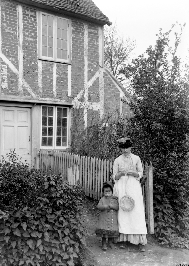 From Box labelled Exhibition 1 Vol 6 Slide 1409 Milstone, Straw Plait. A woman and young girl are posing in front of a brick house. White lines are clearly visible in the brick construction (possibly where wooden frames used to be?) The woman is wearing a white apron and plaiting straw. The child is in darker clothing.