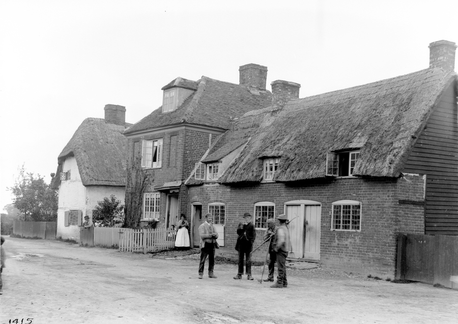 From Vol 6 Slide 1415 Milstone, Cottages. A collection of cottage dwellings, both white and brick coloured, with a combination of thatched and slate roofing laying adjacent to the road. Eight figures in total are visible. A group of four men (presumably farmers) are congregating in the road. Two of the group are holding tools. Behind them a woman is standing in a doorway next to a picket fence.