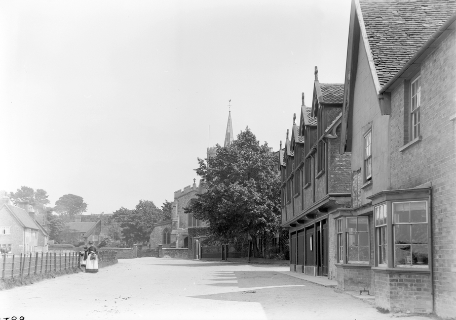 - Title: From Vol 8 Slide 1789 Ivinghoe Vicarage and cottages. A wide road has buildings on the right hand side and a low wooden fence on the left. A church spire is visible above the tree in the centre of the image. A woman and child are seen to the left of the frame standing by the fence.