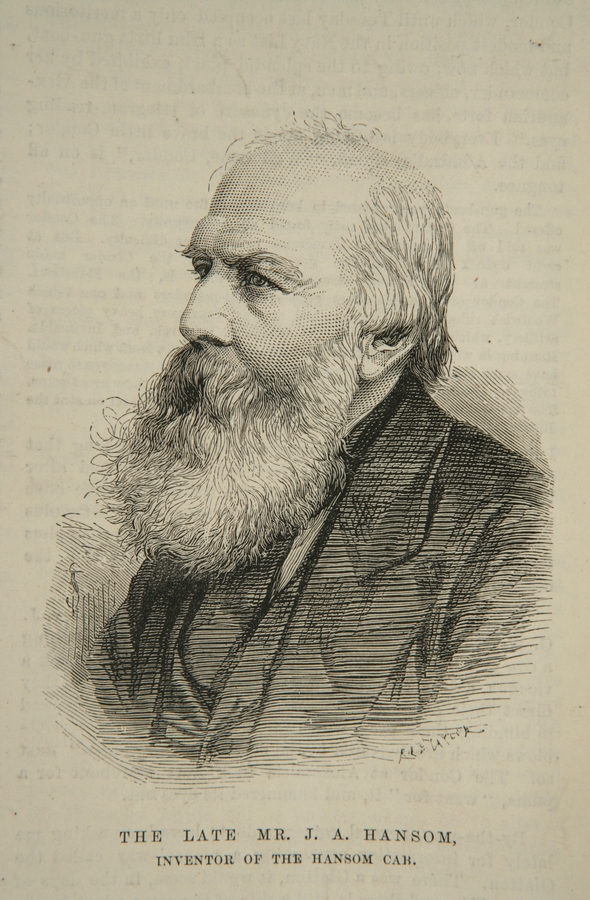 • Title: The image is captioned The Late Mr. J. A. Hansom, Inventor of the Hansom Car. It is a side-face portrait.