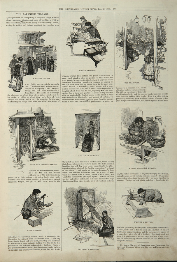 The title: The Japanese Village appears at the top of a full page dedicated to the 'experiment' of transporting an authentic Japanese Village to London. The article describes Japanese arts, crafts and culture.