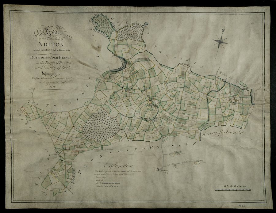- Title: Map of Notton showing field boundaries, including Royston and Cold Heenley, detailing Godfrey Wentworth's estate in the county of York