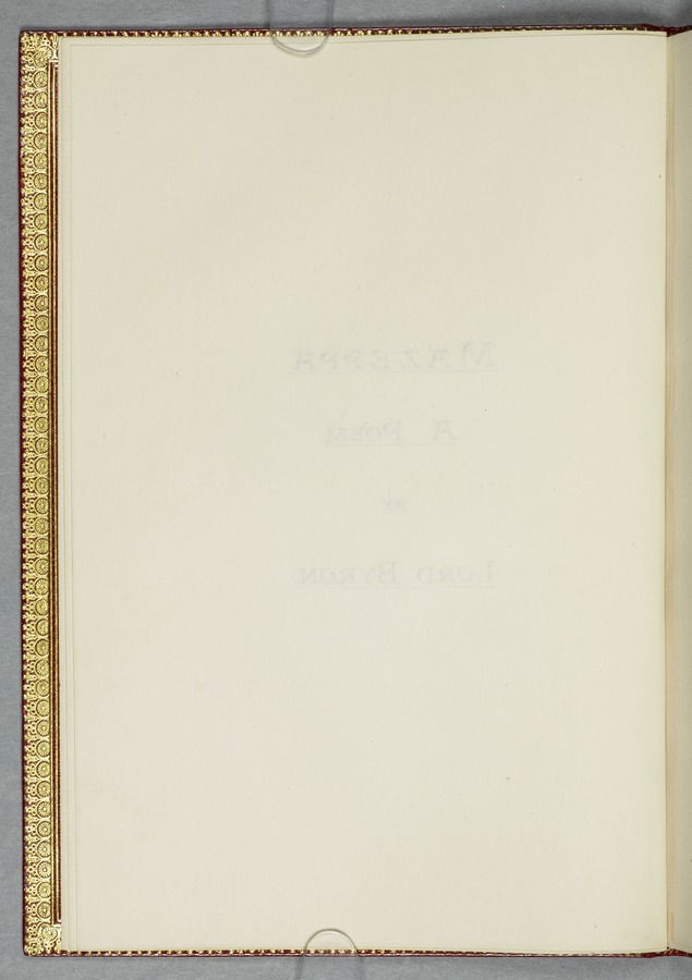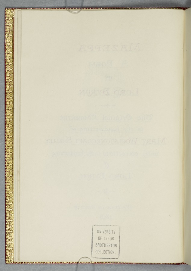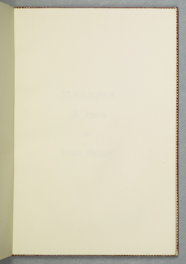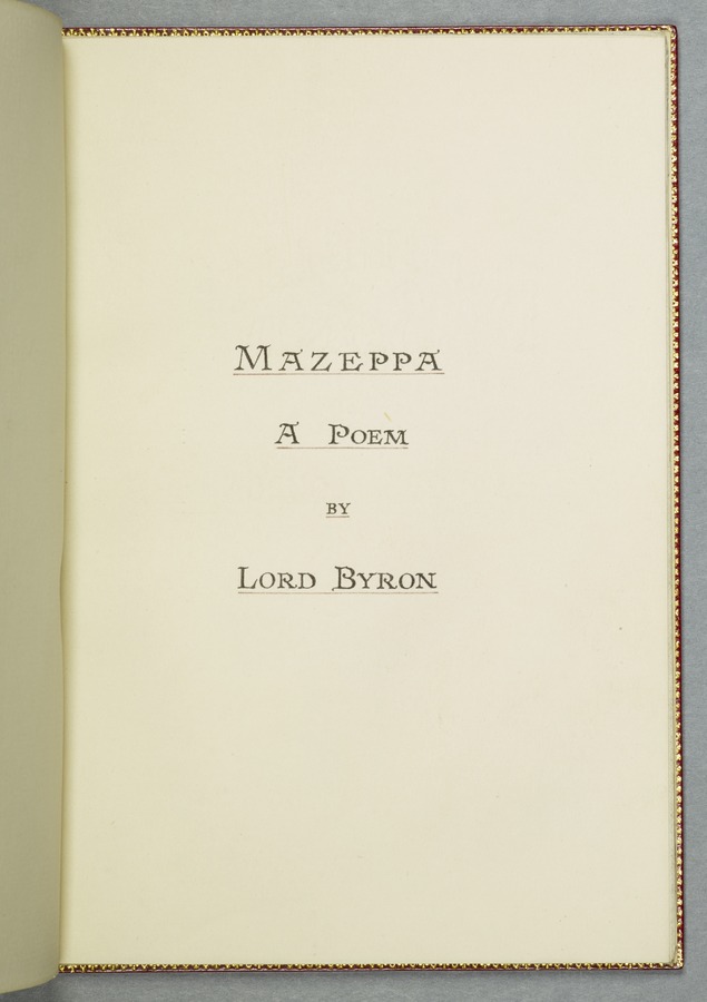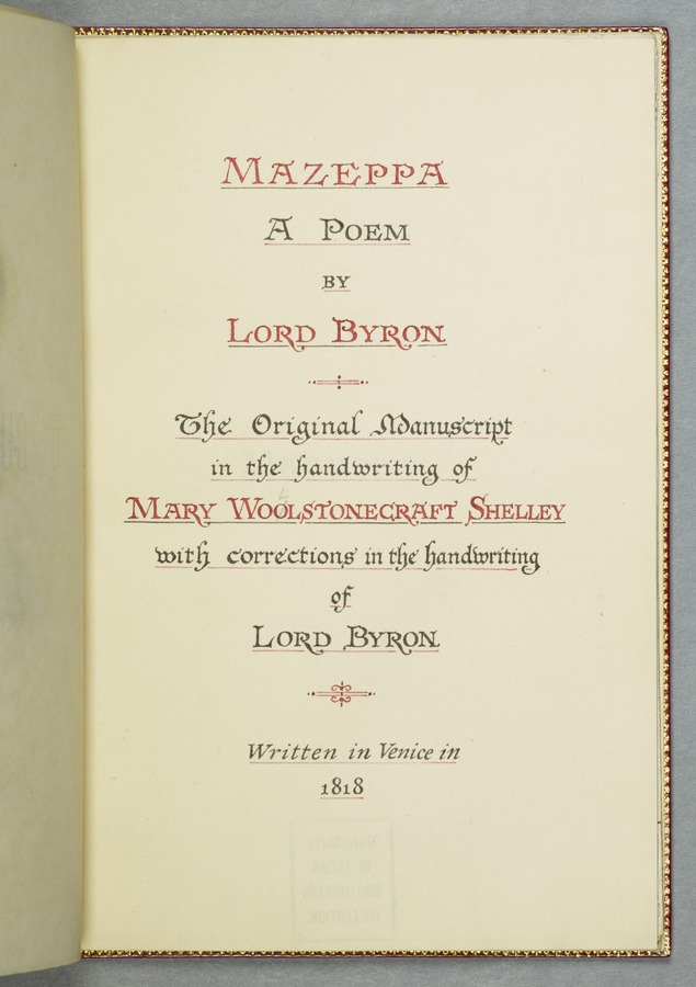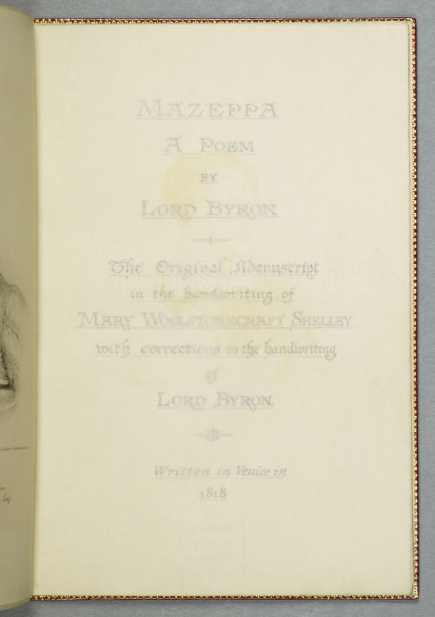 (19) Original manuscript of Byron’s story 'Mazeppa' in Mary Shelley's hand, written in Venice in 1818, with corrections in Byron's hand and a frontispiece portrait of him (54 pp); bound with a French introduction to 'Mazeppa' in Mary Shelley's hand also written in Venice in 1818, headed 'Advertisement to Mazeppa' in Byron's hand and annotated by him (3 pp); and an uncut copy of the second issue of the first printed edition of 'Mazeppa: a poem' (London: John Murray, 1819). 1 red custom-made case containing 2 red portfolios and a volume finely bound in bright red morocco gilt-tooled on all outside covers with decorations and with the spine lettering ‘Maz-/ eppa/ Lord/ Byron/ MS.’ On the spine of the case there are gilt-embossed the words ‘Mazeppa/ Lord/ Byron’. From the Library of Lord Brotherton.