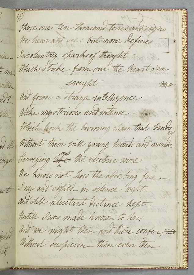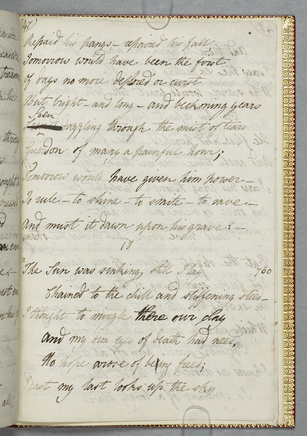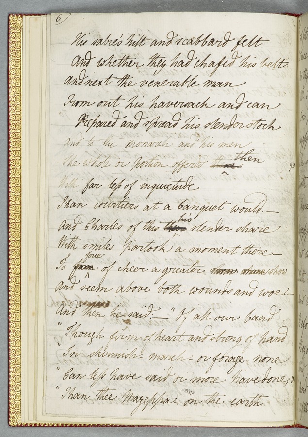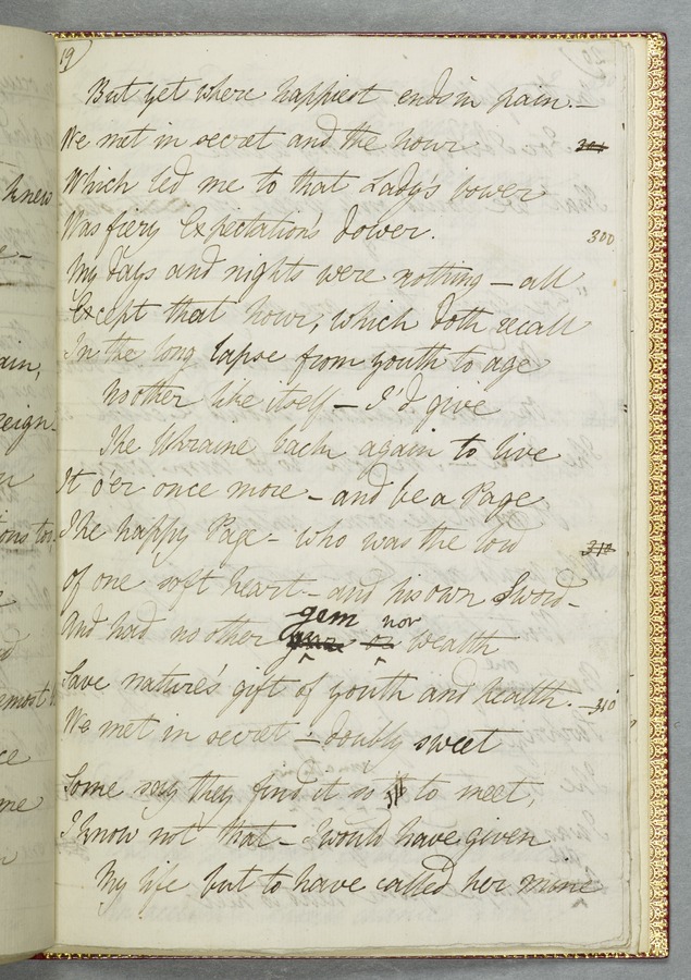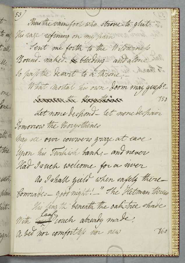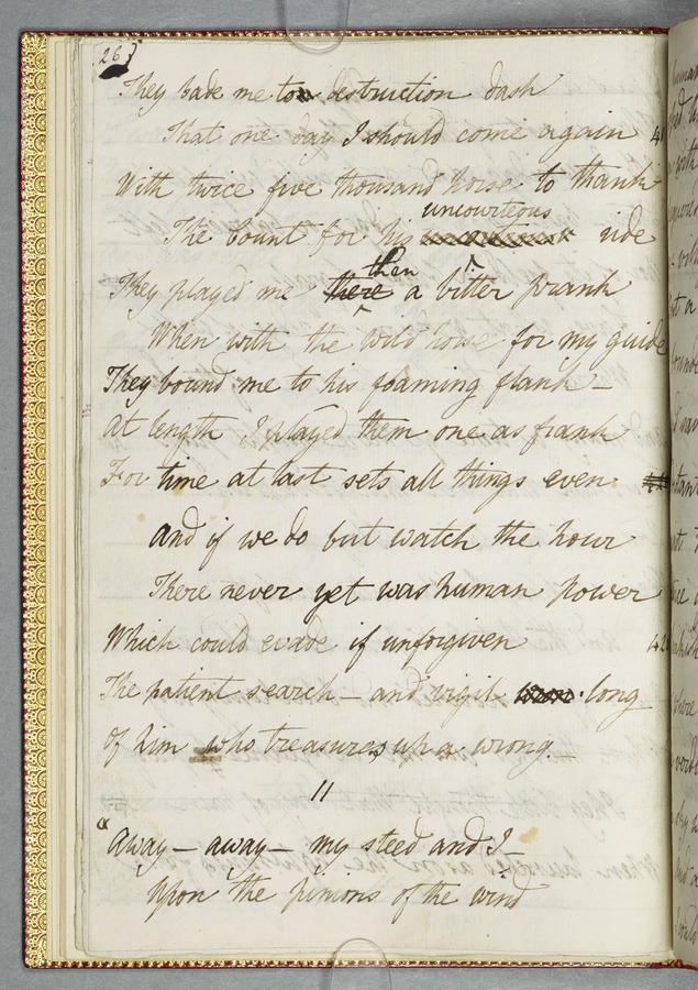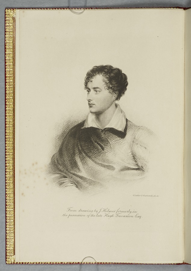 (19) Original manuscript of Byron’s story 'Mazeppa' in Mary Shelley's hand, written in Venice in 1818, with corrections in Byron's hand and a frontispiece portrait of him (54 pp); bound with a French introduction to 'Mazeppa' in Mary Shelley's hand also written in Venice in 1818, headed 'Advertisement to Mazeppa' in Byron's hand and annotated by him (3 pp); and an uncut copy of the second issue of the first printed edition of 'Mazeppa: a poem' (London: John Murray, 1819). 1 red custom-made case containing 2 red portfolios and a volume finely bound in bright red morocco gilt-tooled on all outside covers with decorations and with the spine lettering ‘Maz-/ eppa/ Lord/ Byron/ MS.’ On the spine of the case there are gilt-embossed the words ‘Mazeppa/ Lord/ Byron’. From the Library of Lord Brotherton.