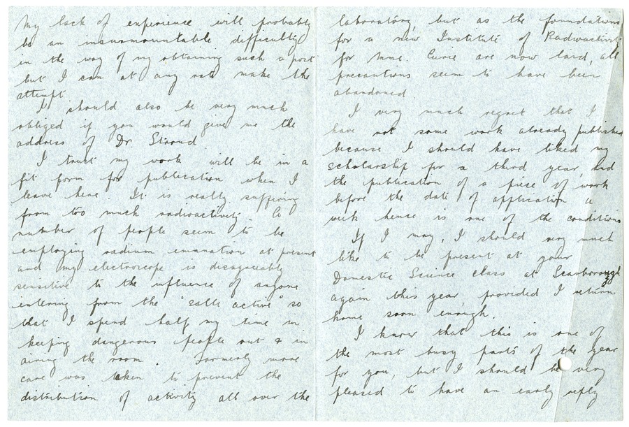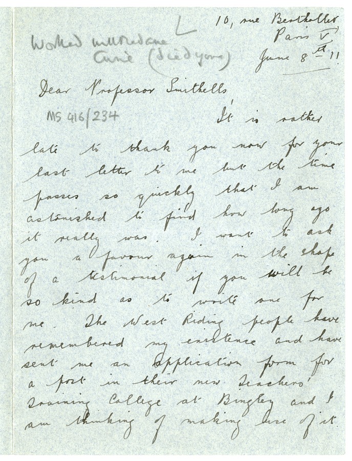 - Title: Letter to Arthur Smithells from: May Sybil Leslie; 10 rue Berthollet, Paris V 8th June 1911. Seeks a testimonial; lack of precautions against radio-active contamination in Mme. Curie's laboratories. MS. 2 ff.
