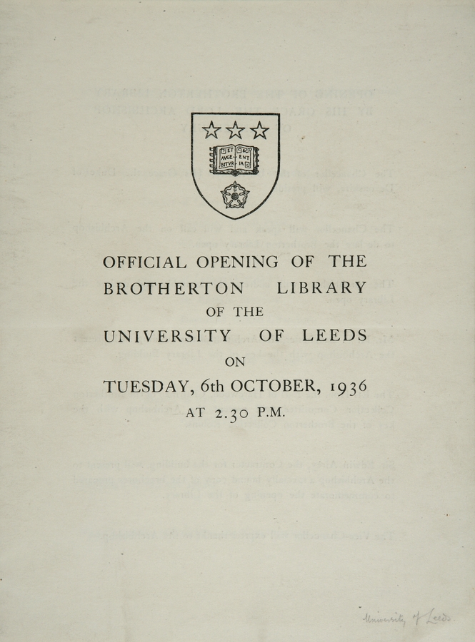 • Title: 'Official Opening of the Brotherton Library of the University of Leeds on Tuesday, 6th October, 1936 at 2.30pm' title page of programme
