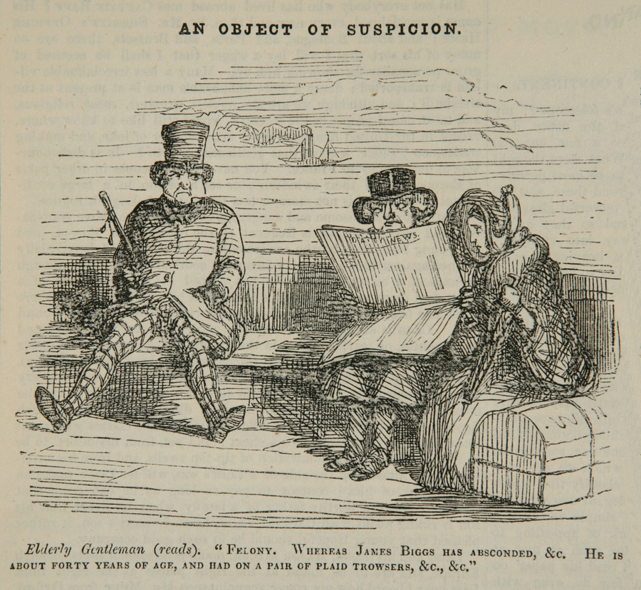 - Title: Victorian figures by sea or on boat. Travelling couple read newspaper and stare at gentleman. Caption reads 'An object of Suspicion. Elderly Gentleman (reads). Felony. Whereas James Biggs has absconded, &c. He is about forty years of age, and has on a pair of plaid trowsers, &c., &c.'