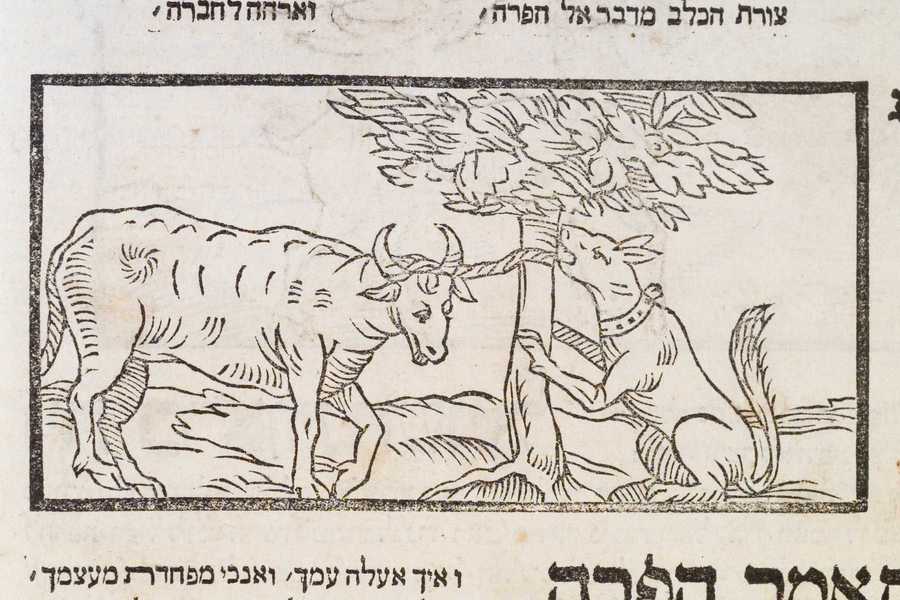 - Title: Woodcut shows a dog and a cow tied to a tree