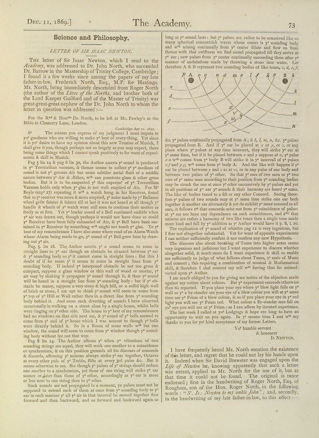 Page of text headed 'Science and Philosophy: Letter of Sir Isaac Newton', with illustration of function of sound waves