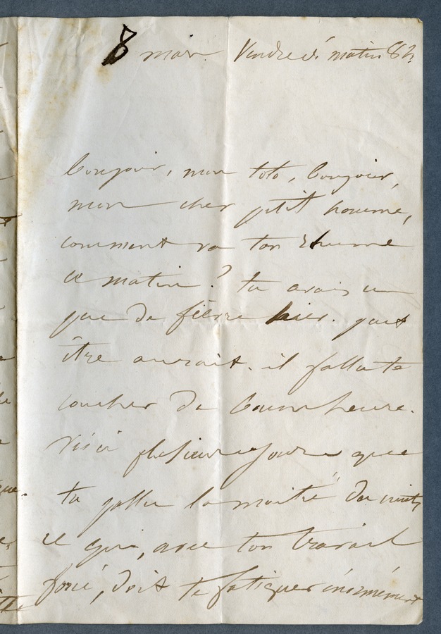She says that Hugo should not work so much. She also mentions that he was angry at the Academy the previous day. Dated Friday, 8am.