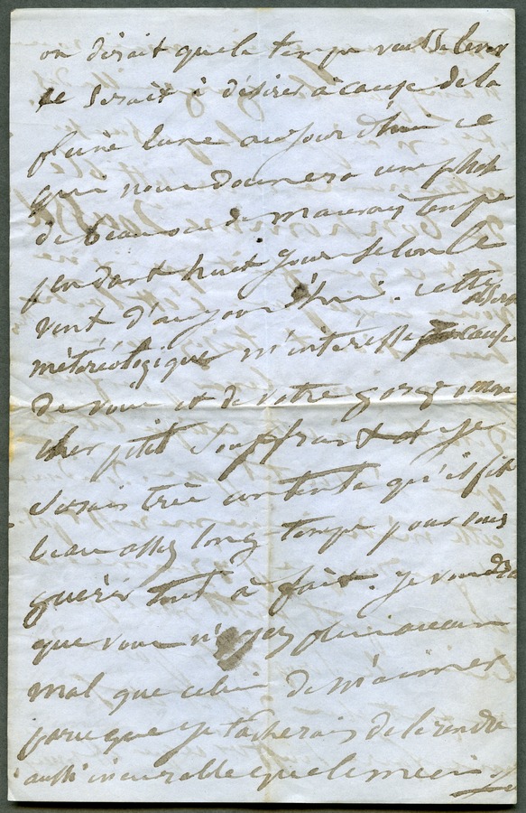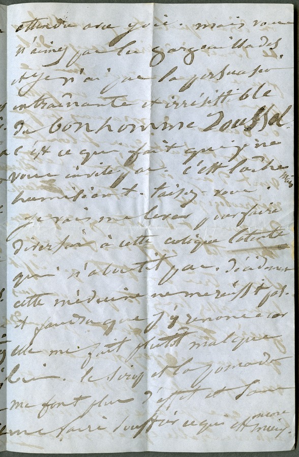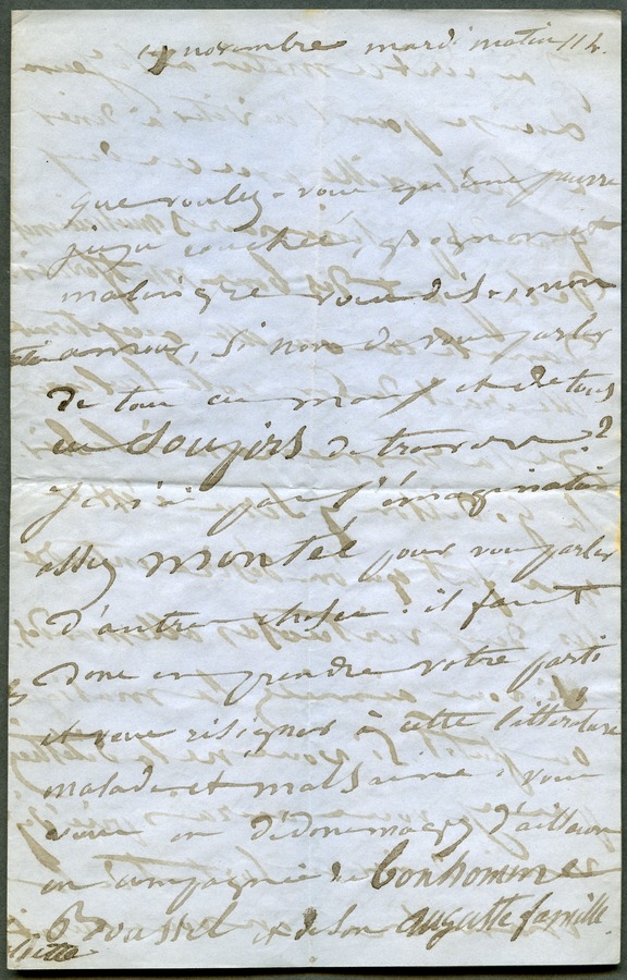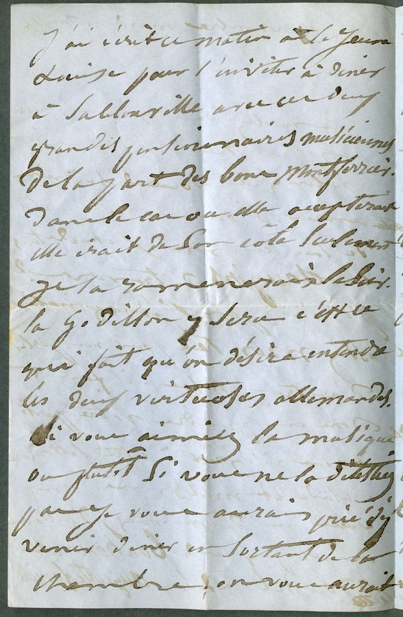 She complains again about the drugs she is taking. She adds that she would have liked to invite Hugo to the Monferriers' house in Sablonville to attend a private concert given by two German musicians, but he unfortunately hates music. Dated Tuesday, 11am.