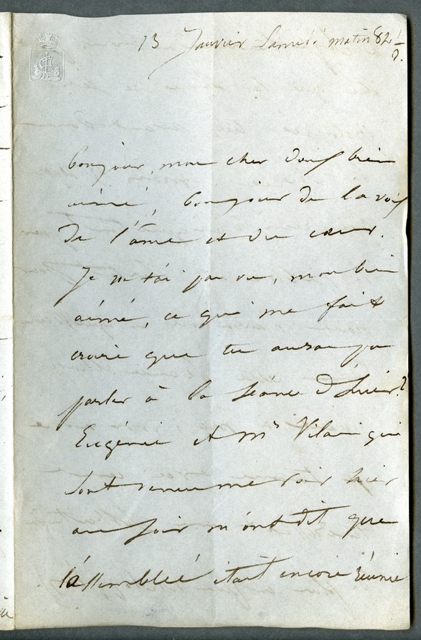 She said that as Hugo did not call on her the previous day, he must have been able to speak at the Assembly. Eugénie and Mr Vilain told her that the debates were still running at 7pm. Dated Saturday, 8:30am.