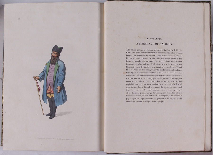 Two pages from volume: illustration of a merchant from Kalouga and accompanying text