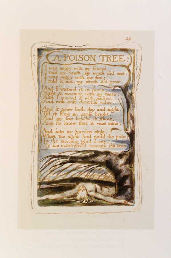- Title: A poem entitled A Poison Tree with an illustration at the bottom of a figure lying prone underneath the boughs of a tree.