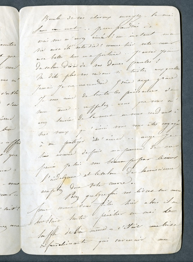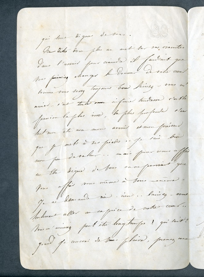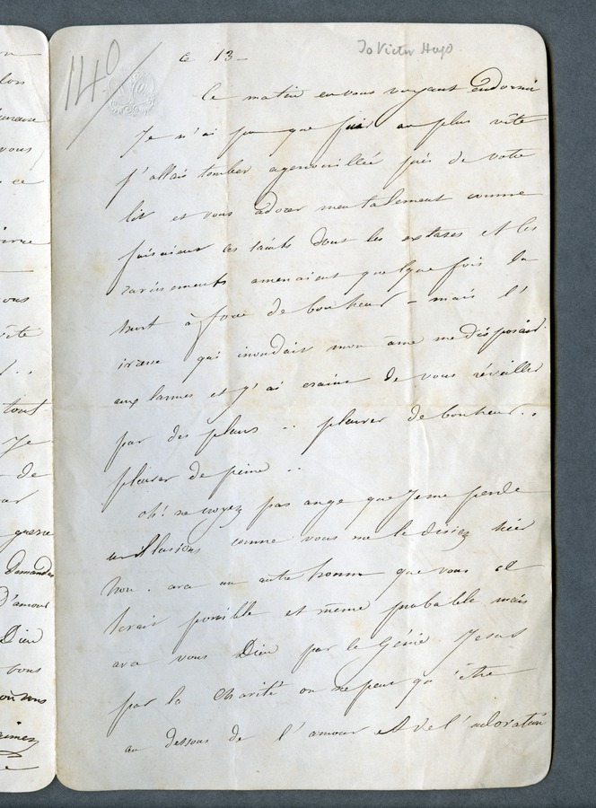 Love letter in which the writer describes tells her admiration for Hugo and implies that they slept together in the previous night. She adds that she goes to Colombes and tells Hugo that they can meet again there on Friday. N.b. presumably different correspondent from BC MS Misc. Letters 1 Hugo/13.