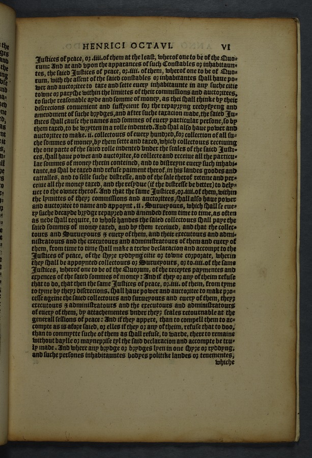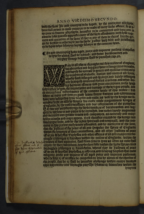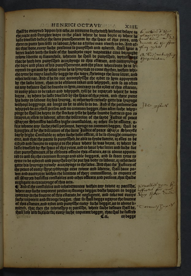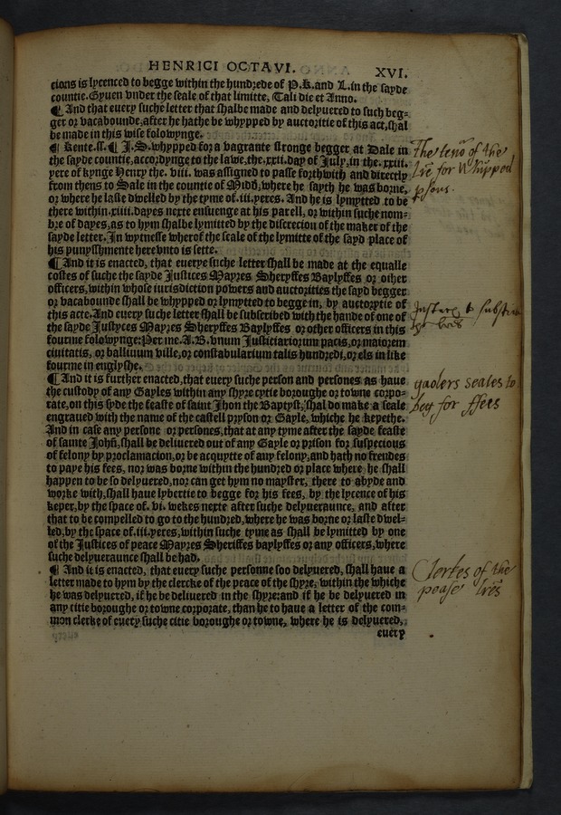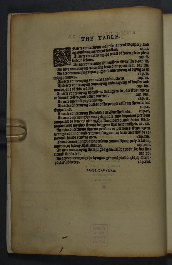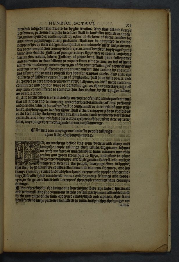 Printed copy of a collection of 16 acts, including "An acte concernyng outlandishe people cllyng them selfes Egiptians" [Gypsies/Travellers] (cap. 10) and "An acte concerning how aged, poore, and impotent persons compelled to lyve by almes, shall be ordered, and how vacabondes [sic] and myghty beggars shal be punished" (cap. 12).