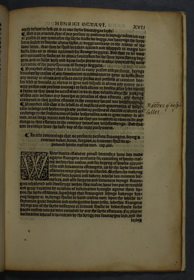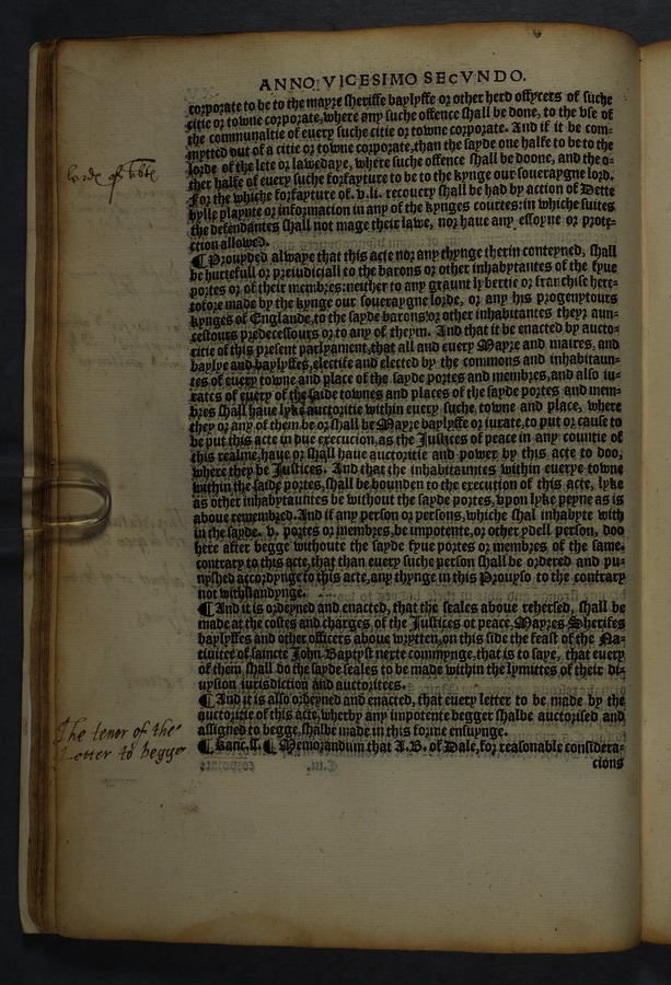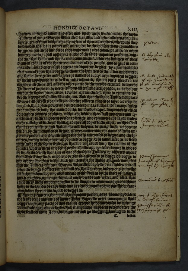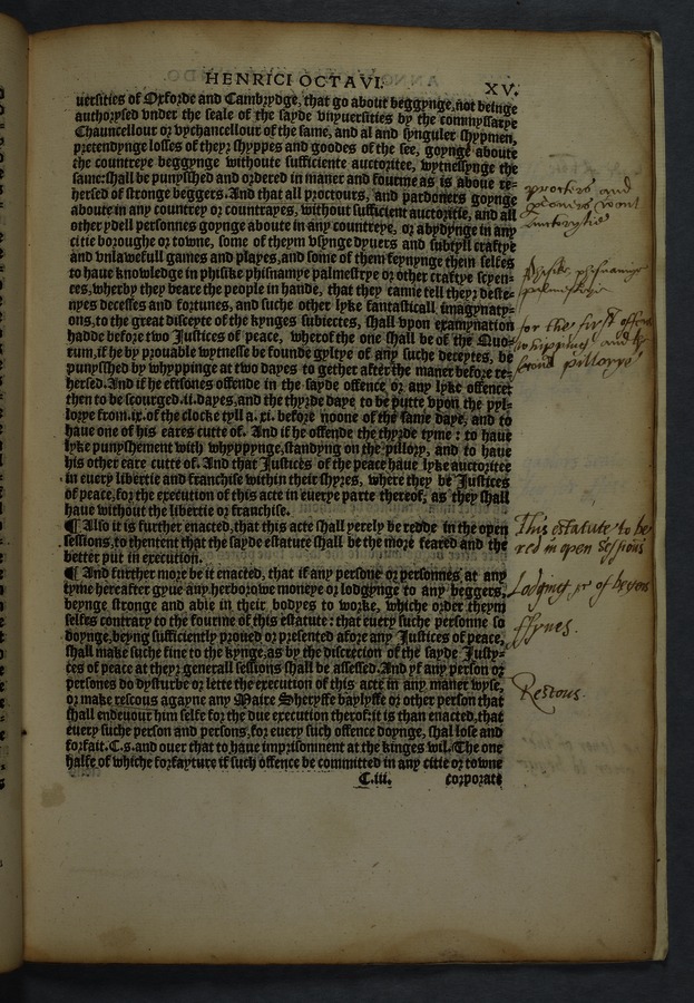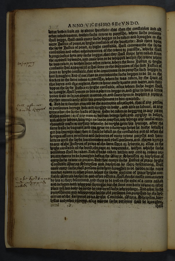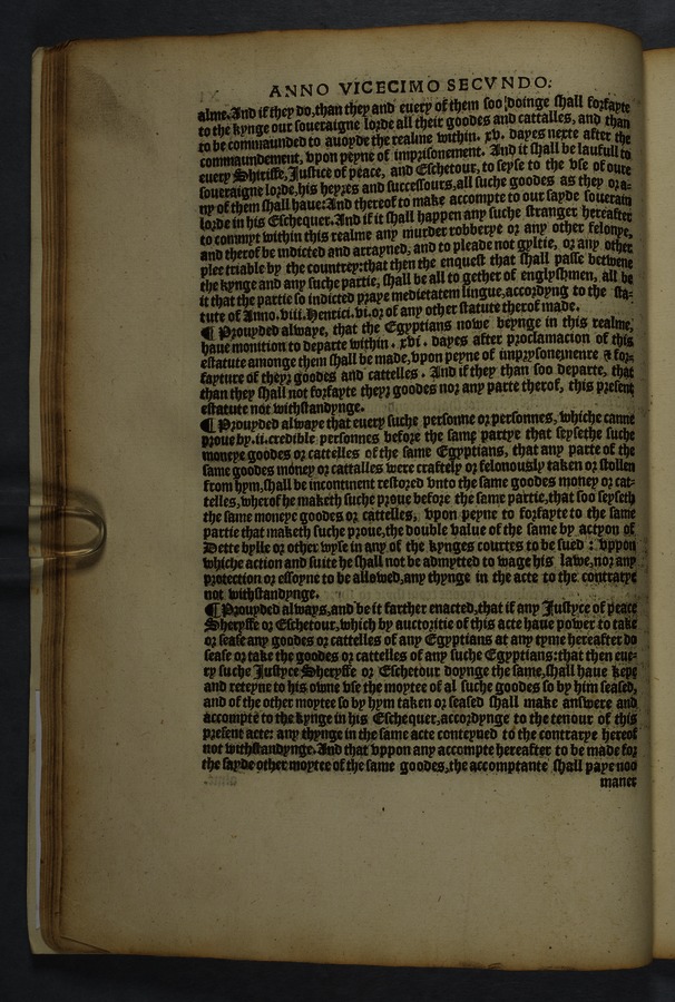 Printed copy of a collection of 16 acts, including "An acte concernyng outlandishe people cllyng them selfes Egiptians" [Gypsies/Travellers] (cap. 10) and "An acte concerning how aged, poore, and impotent persons compelled to lyve by almes, shall be ordered, and how vacabondes [sic] and myghty beggars shal be punished" (cap. 12).
