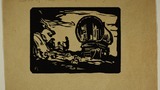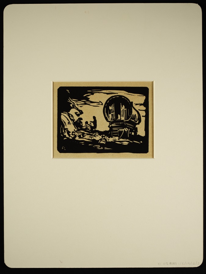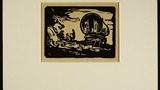 Mounted wood cut image of Gypsy Traveller wagon and silhouette of people to the left.Undated.