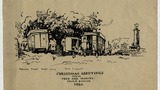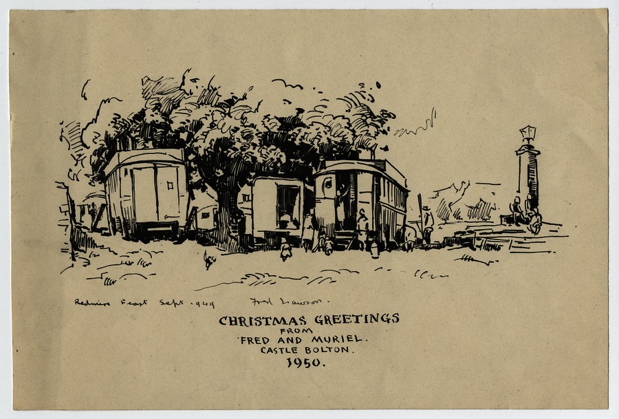Pen and ink drawing of Gypsy Traveller wagons possibly used as a proof for a family christmas card as it includes text, "Christmas Greetings from Fred[Lawson] and Muriel [Metcalfe].Castle Bolton, 1950."