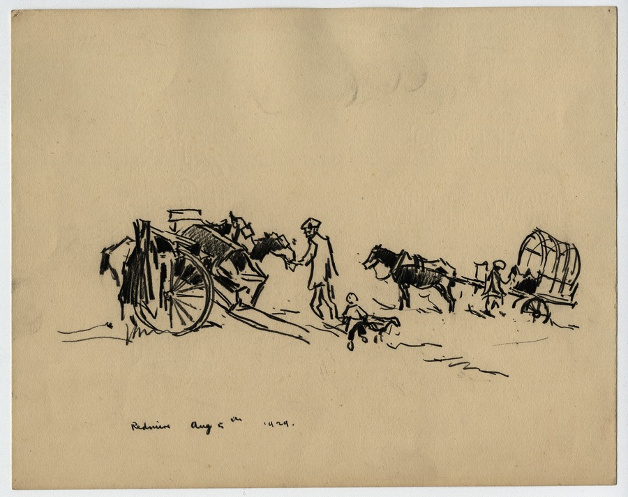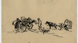 Charcoal drawing of people with horse and carts.