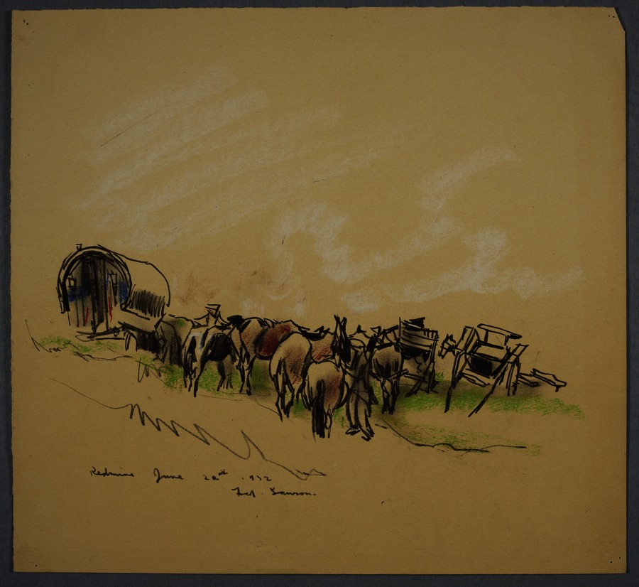 Crayon drawing of horses grazing and carts and a Gypsy Traveller wagon in the background.