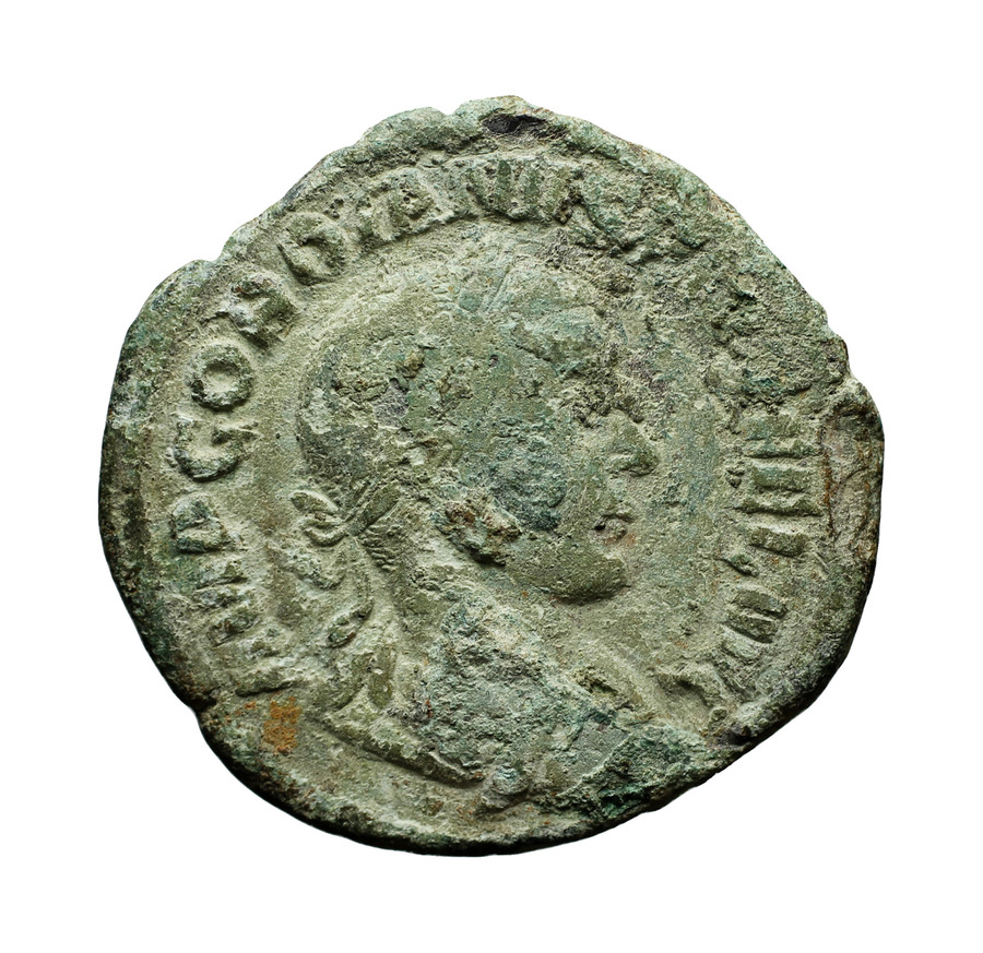 IMP GORDIANVS PIVS FEL AVG: Bust of Gordian III, laureate, draped, cuirassed, right