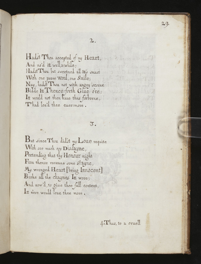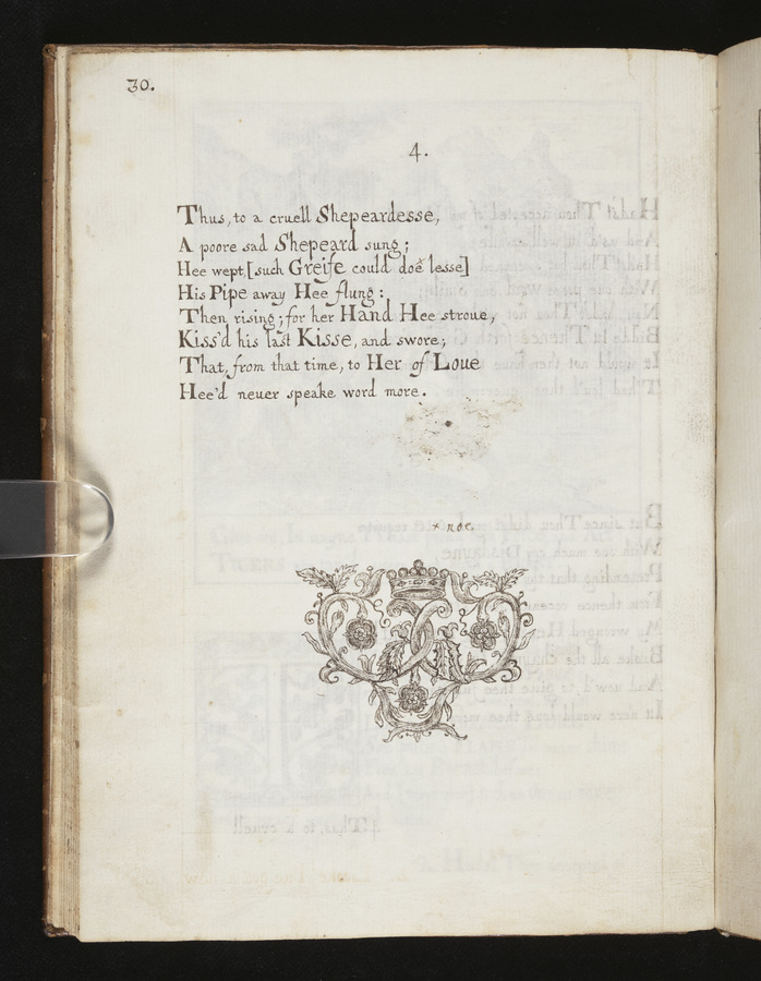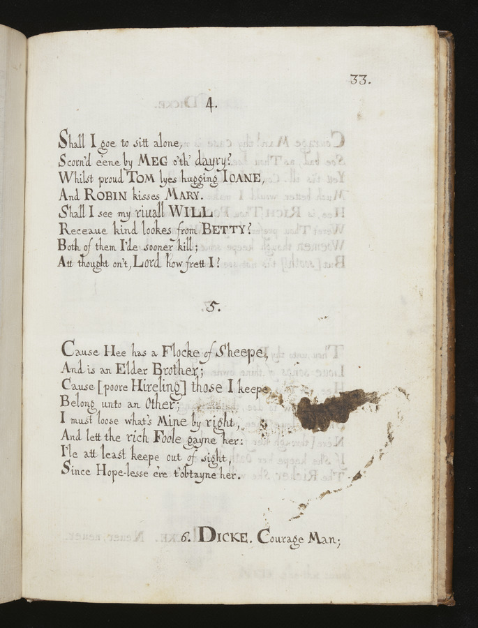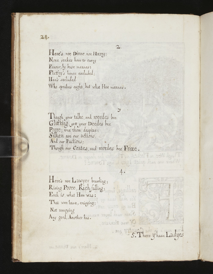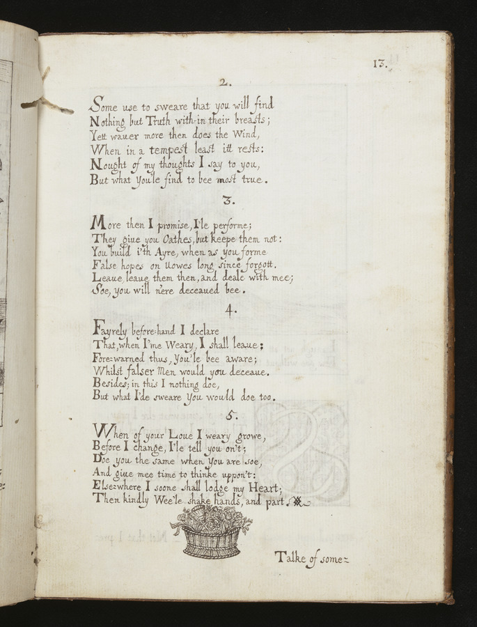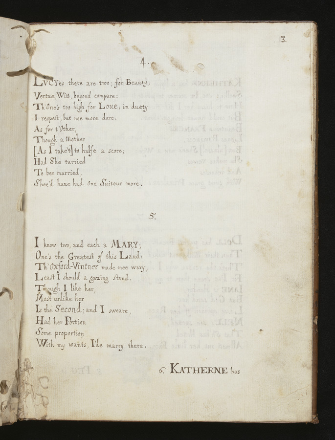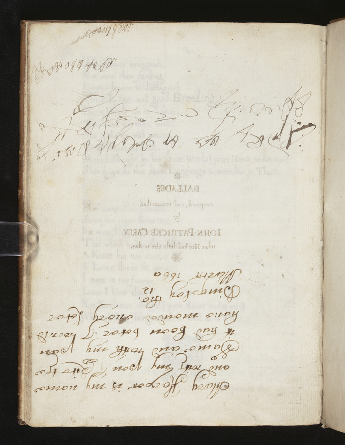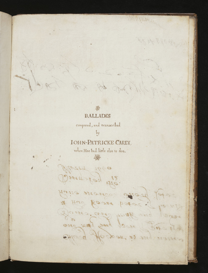 F.3r: title-page; ff.4r-23v: thirteen "ballades" on pages numbered 1-40; f.24r: colophon, "Ballades composed, and transcribed by Iohn Patricke Carey, when Hee had little else to doe."; f.24v (inverted): pen trials and doggerel by Mary Harper, Dingeley, 12 March 1660.