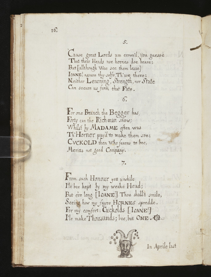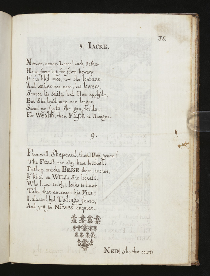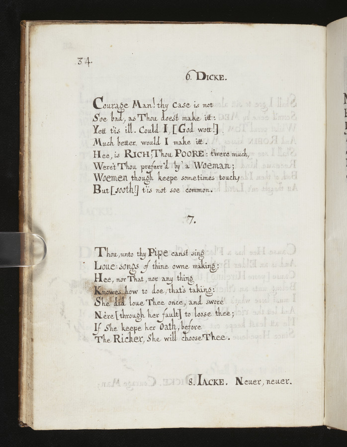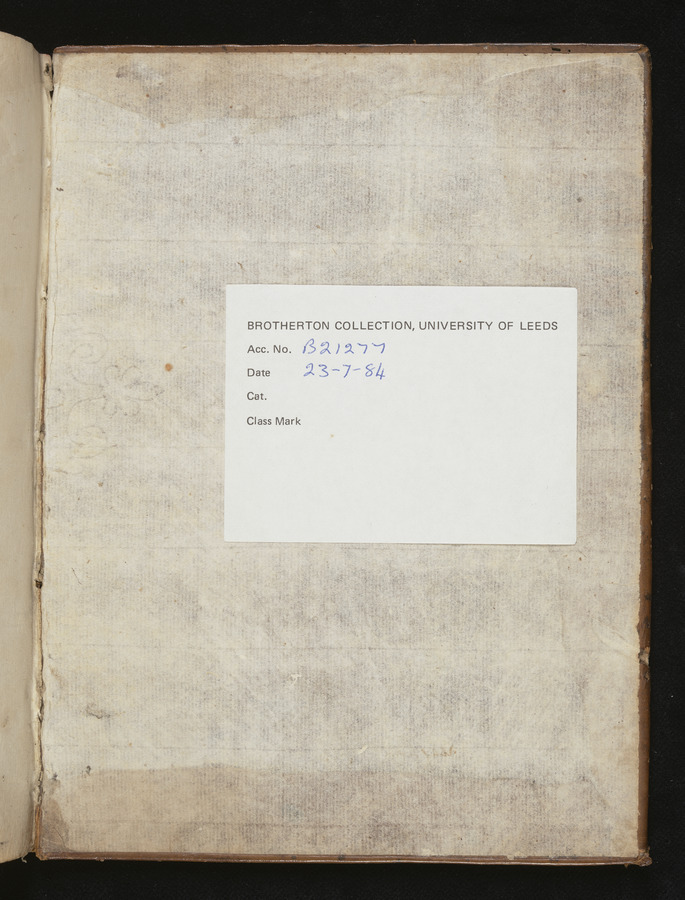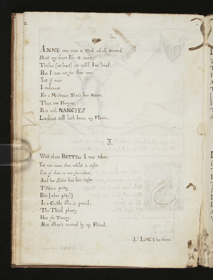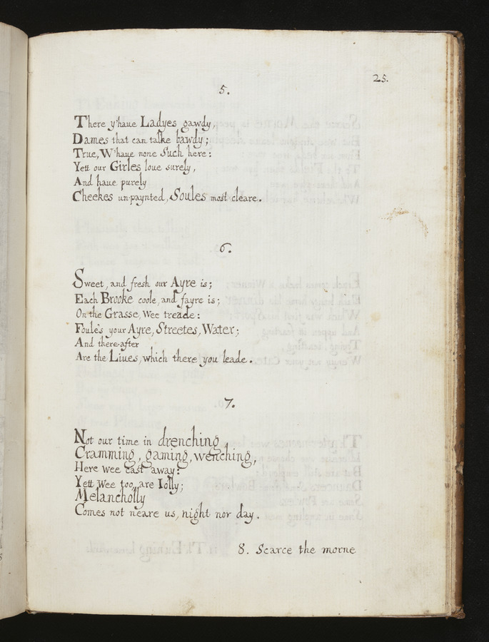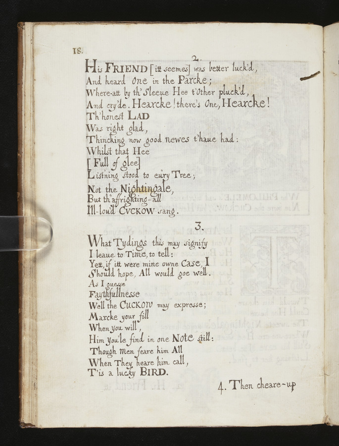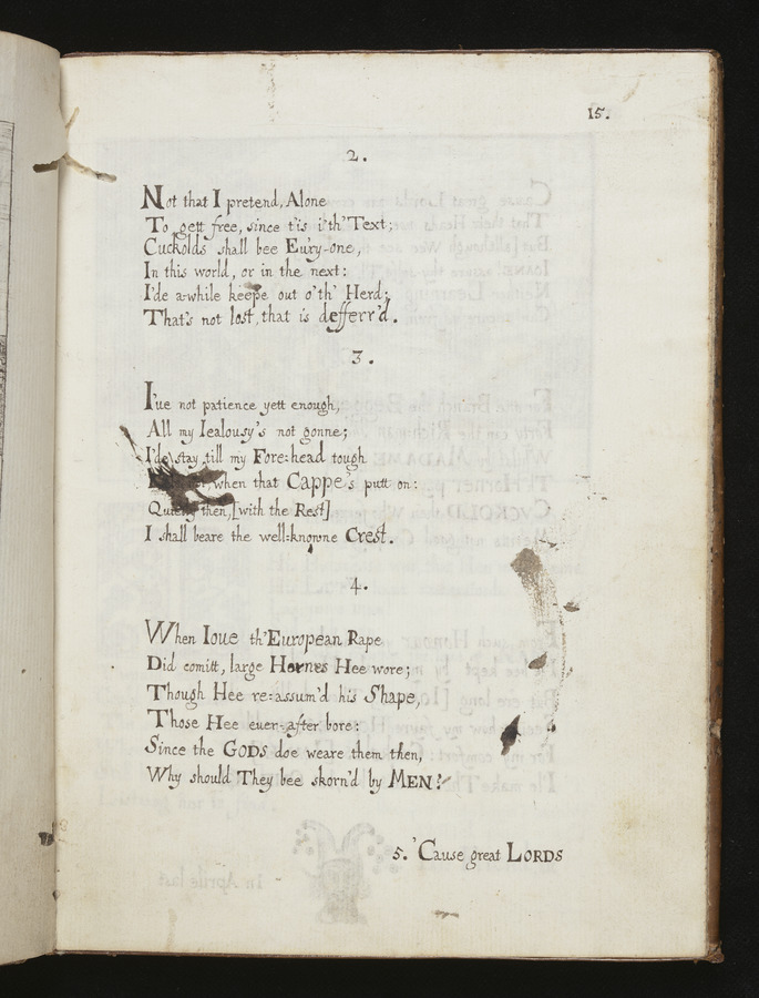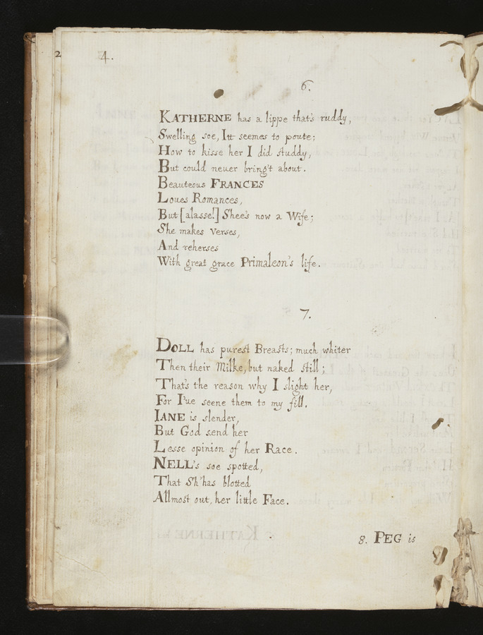 F.3r: title-page; ff.4r-23v: thirteen "ballades" on pages numbered 1-40; f.24r: colophon, "Ballades composed, and transcribed by Iohn Patricke Carey, when Hee had little else to doe."; f.24v (inverted): pen trials and doggerel by Mary Harper, Dingeley, 12 March 1660.