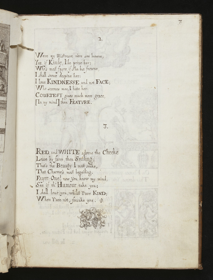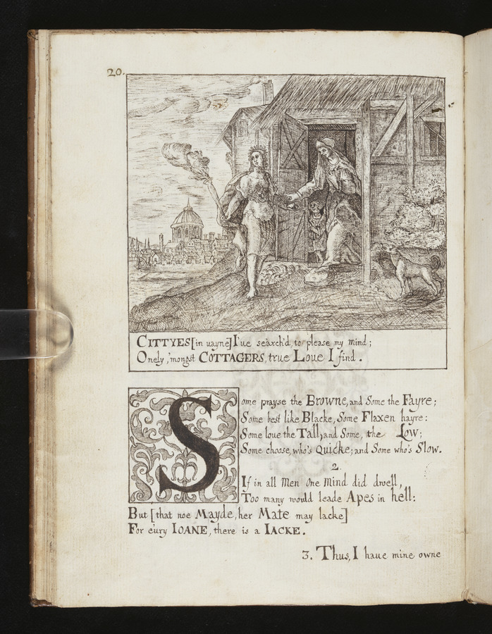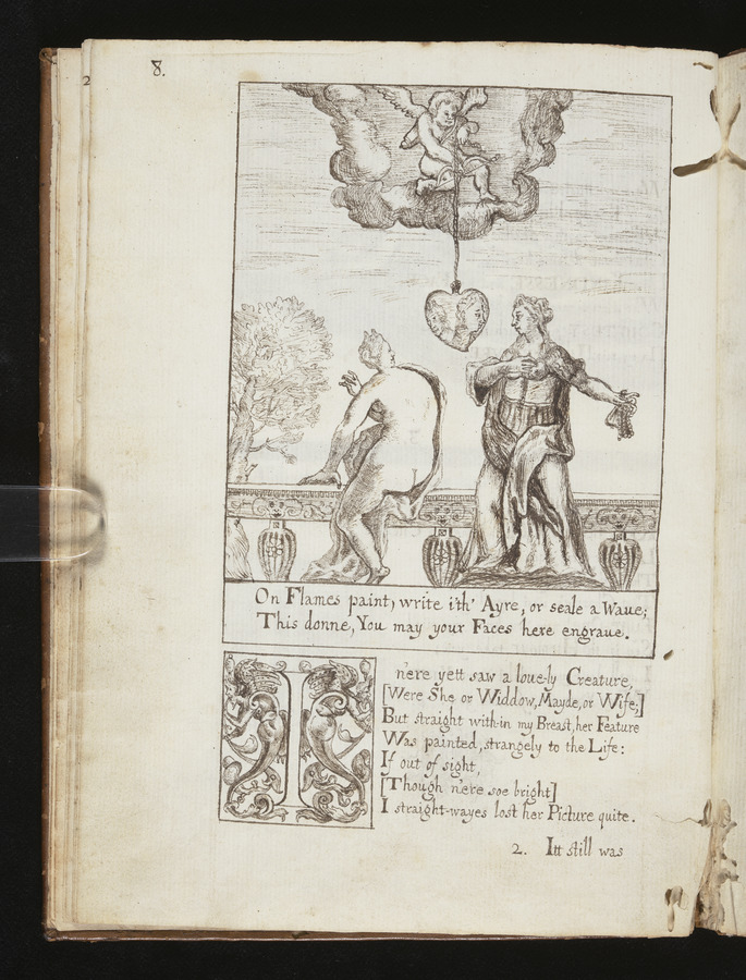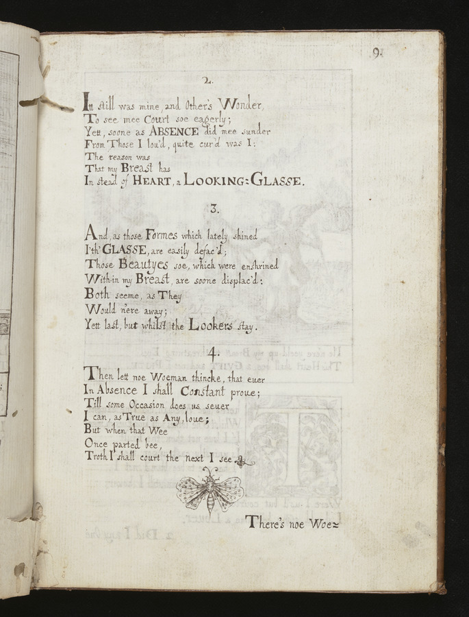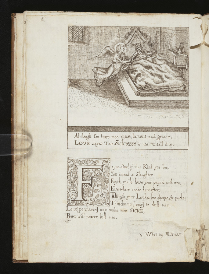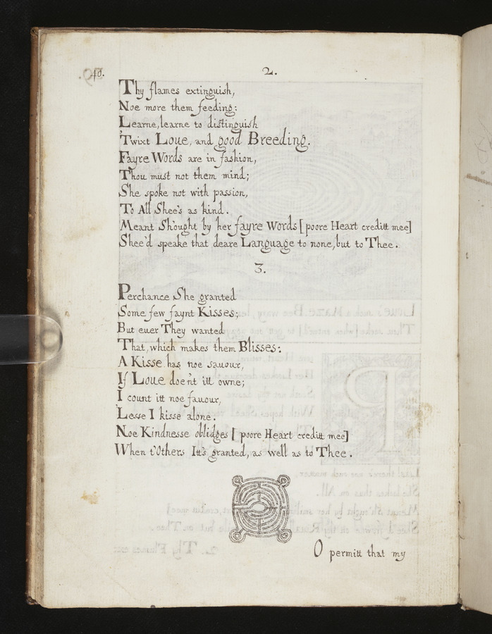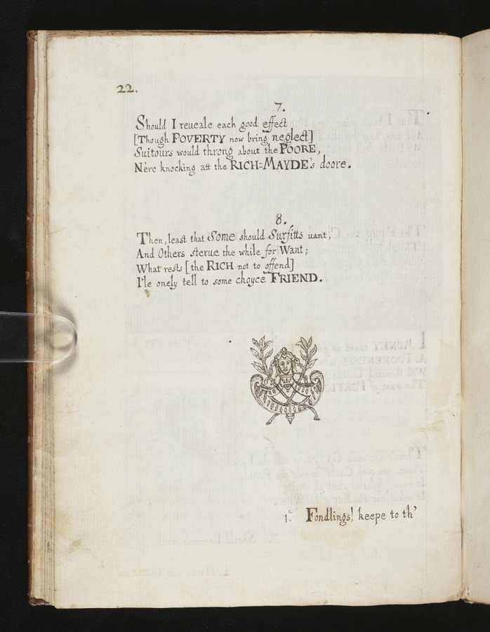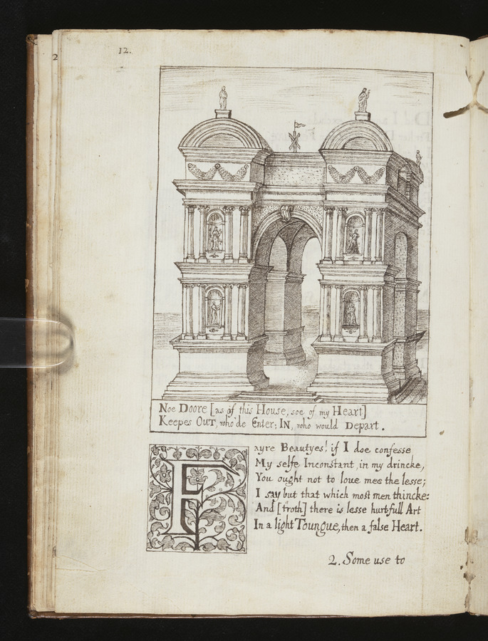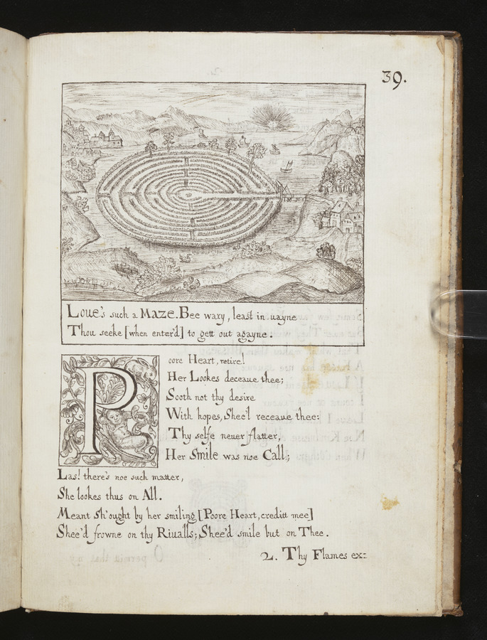Blank leaves: front and rear endpapers, ff.1-2, f.3v, ff.25-26. Title-page illustrated with elaborate architectural border, with many coats of arms, including that of Harry Vi:count of Falkland and Carey's own device, and the note London. Dublin. Tew. Wickham. (1652) writt All by the Authour's owne hand, an (1653) [i.e. 1652/3]. Each poem illustrated by a preceding emblematic drawing, with a couplet caption, and a following vignette. Bound in late-seventeenth-century calf; inner margins from front endpapers to f.13 worm-holed without loss to text. Catch words on p.40 not taken up and indicate an additional poem or poems in the MS originally, but remaining text is as when bound.