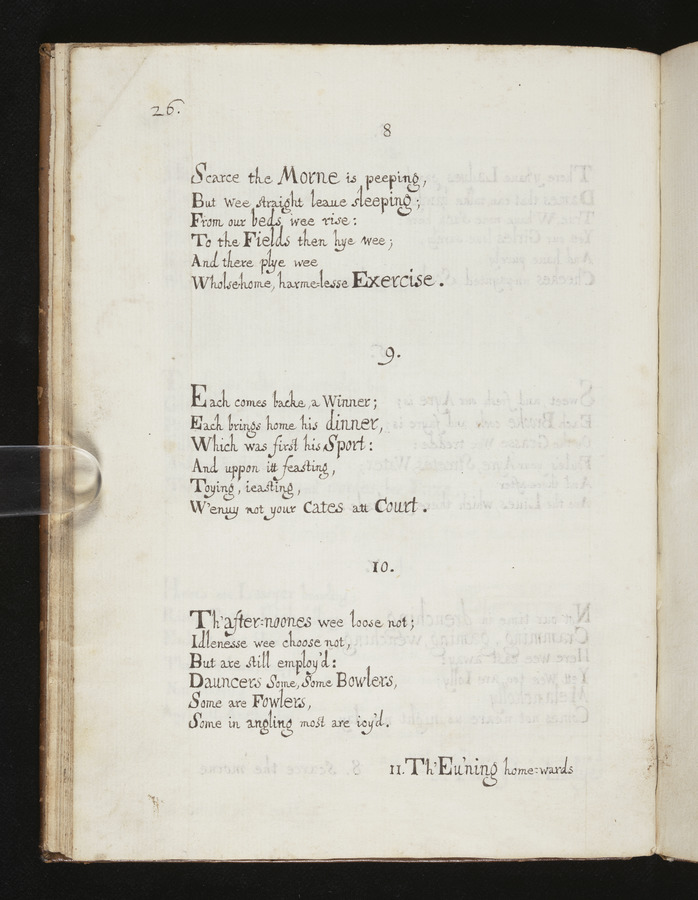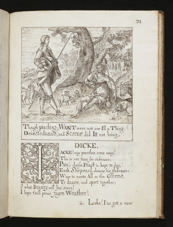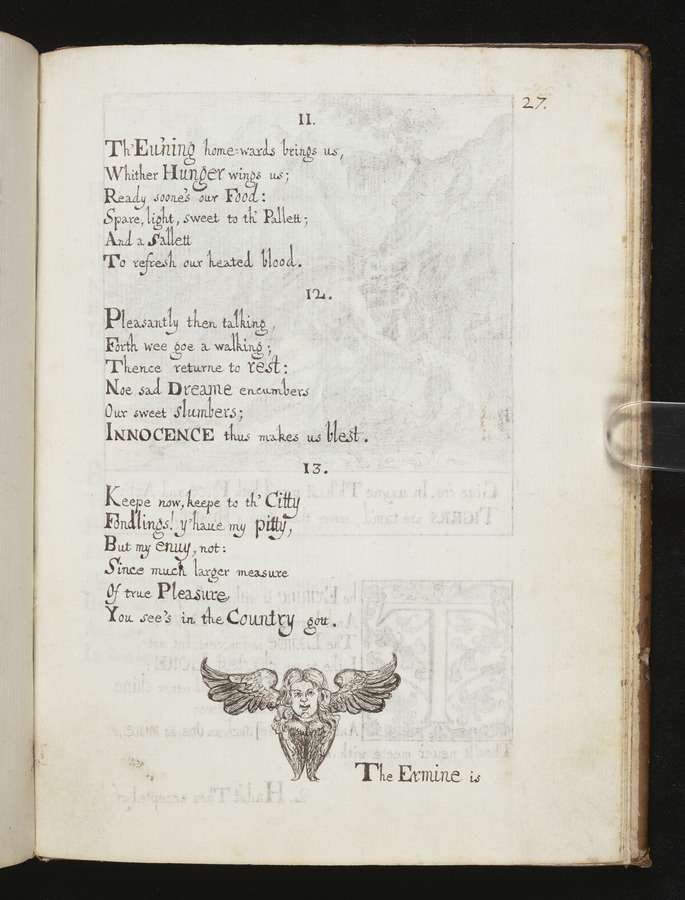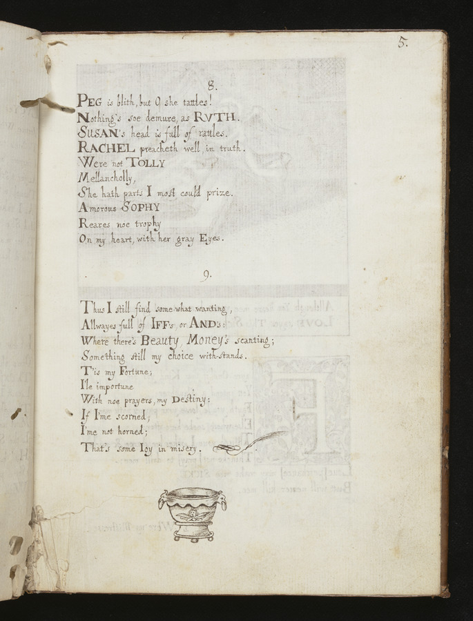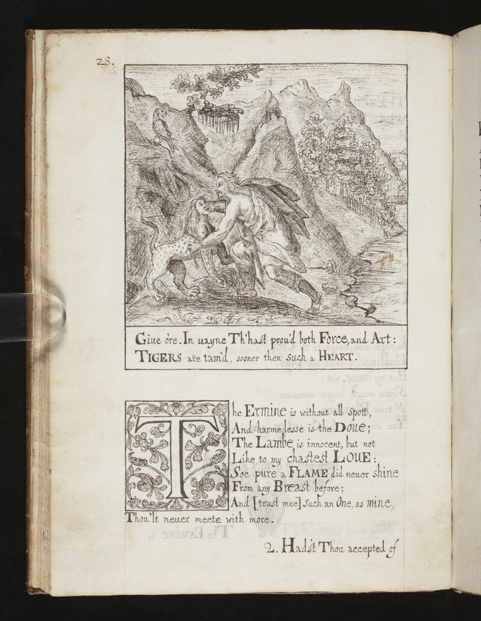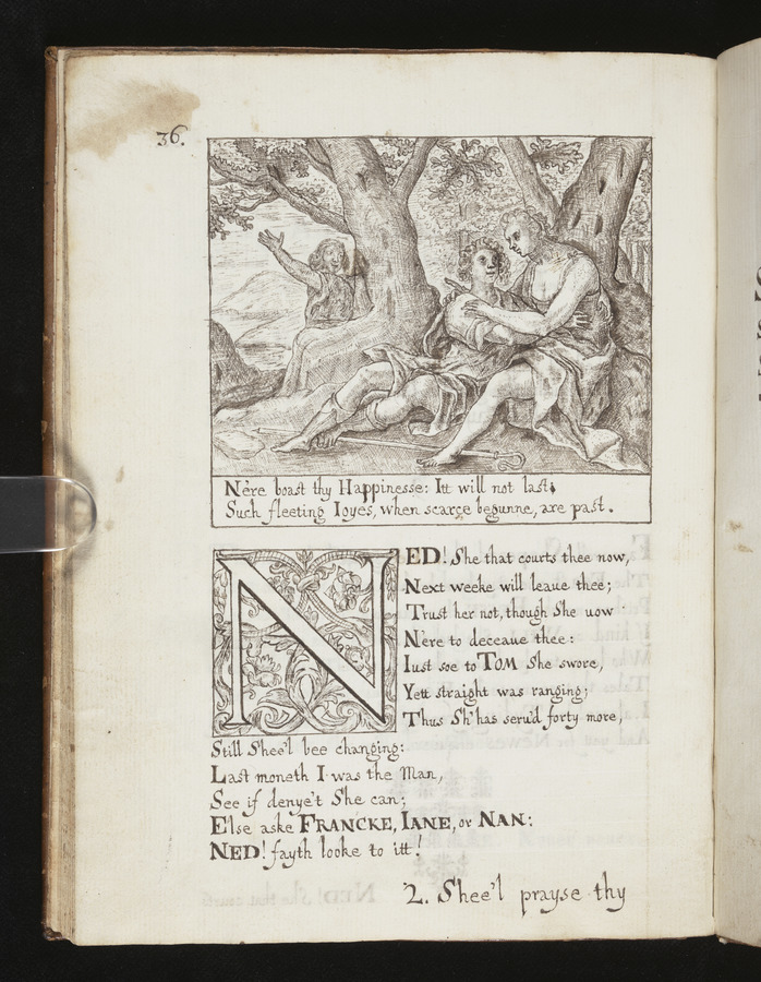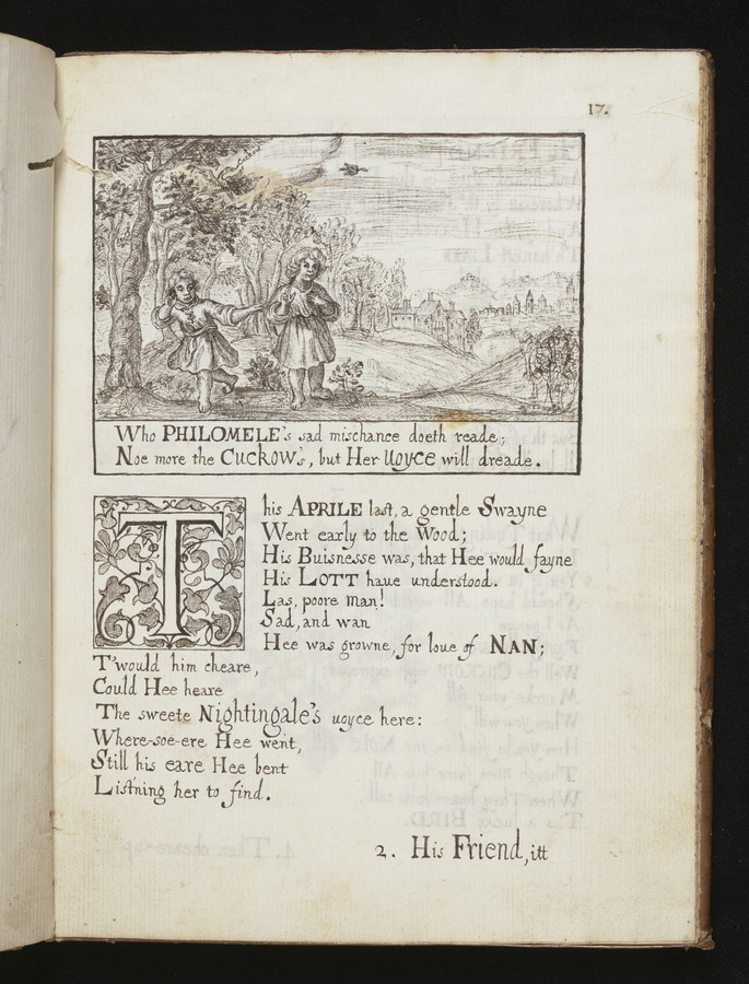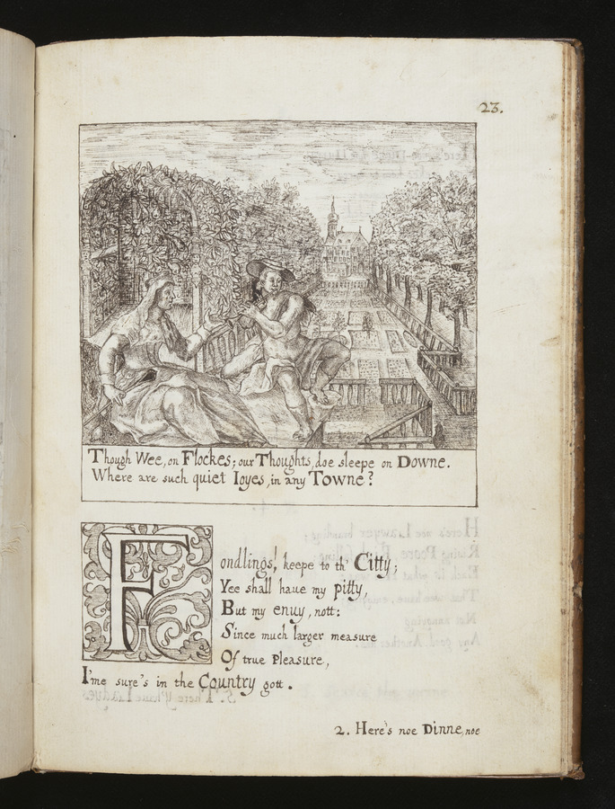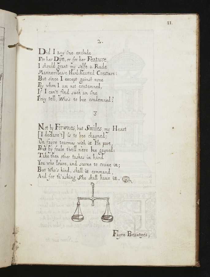 Blank leaves: front and rear endpapers, ff.1-2, f.3v, ff.25-26. Title-page illustrated with elaborate architectural border, with many coats of arms, including that of Harry Vi:count of Falkland and Carey's own device, and the note London. Dublin. Tew. Wickham. (1652) writt All by the Authour's owne hand, an (1653) [i.e. 1652/3]. Each poem illustrated by a preceding emblematic drawing, with a couplet caption, and a following vignette. Bound in late-seventeenth-century calf; inner margins from front endpapers to f.13 worm-holed without loss to text. Catch words on p.40 not taken up and indicate an additional poem or poems in the MS originally, but remaining text is as when bound.