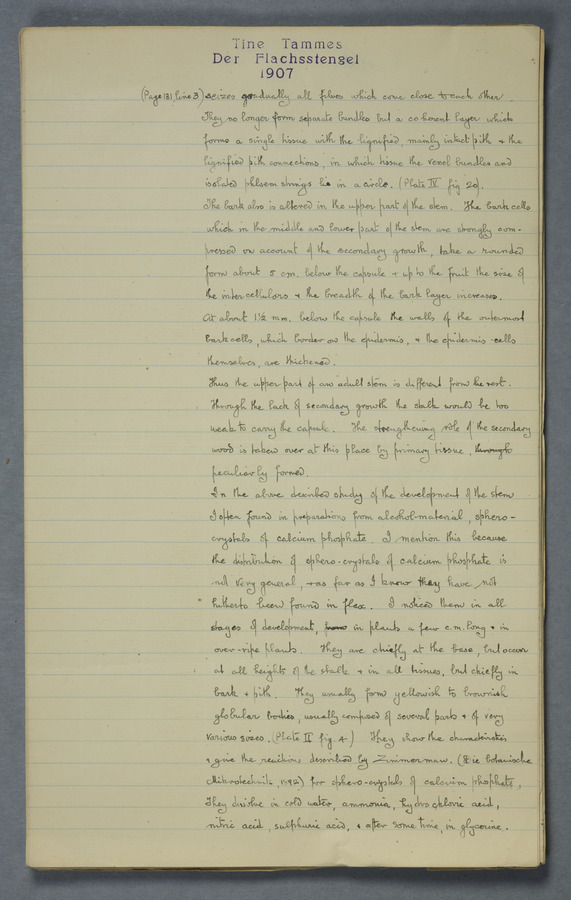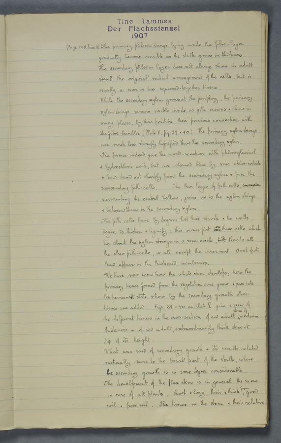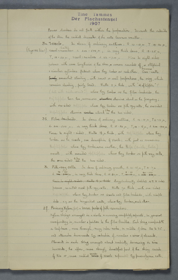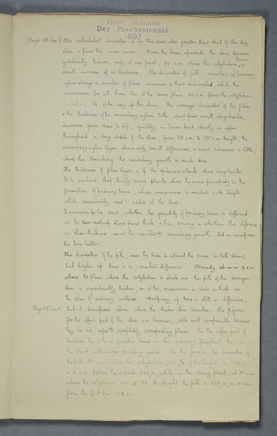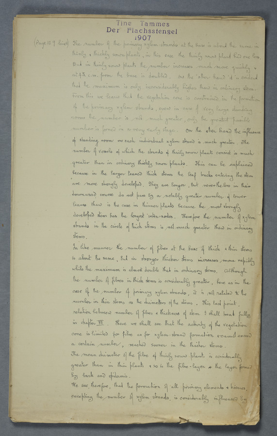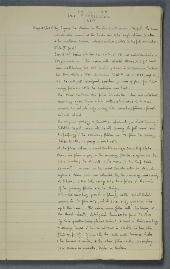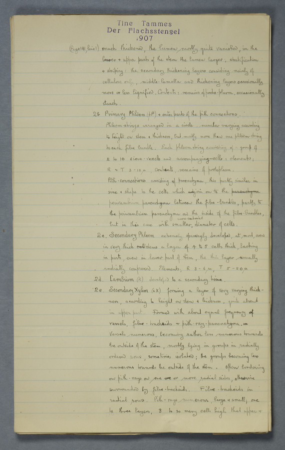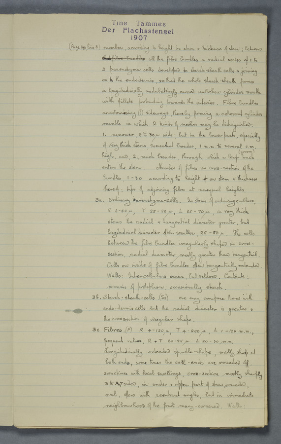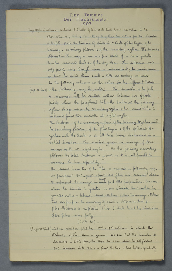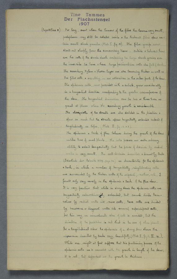 Notes from Tine Tammes, Der Flachsstengel: eine statistisch-anatomische Monographie (Verhandeling v. d. Hollandsche Maatsch. d. Wetensch., 3 vi 4, 1908). No date. MS. 52 ff. Original paper dated 1907 by FKJ