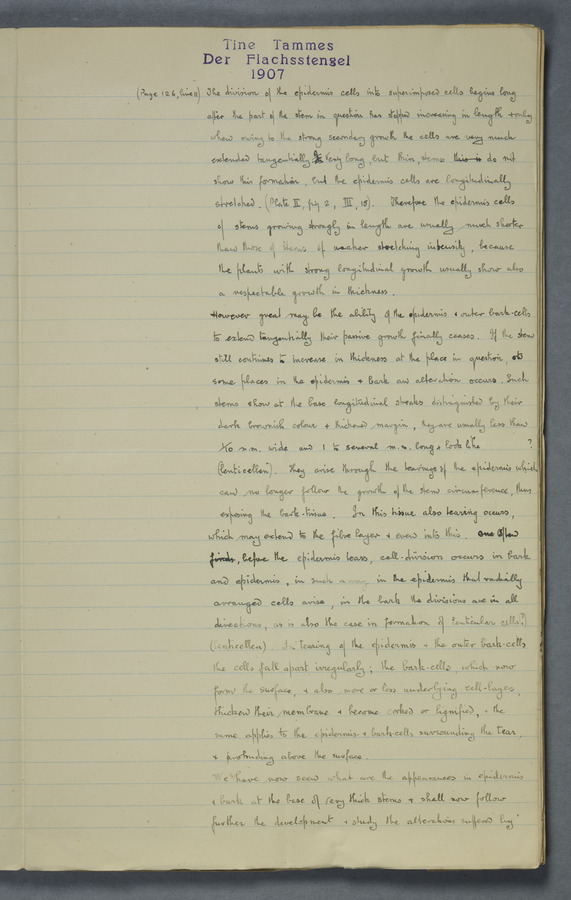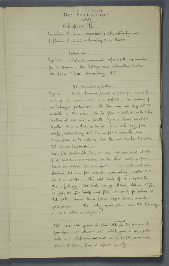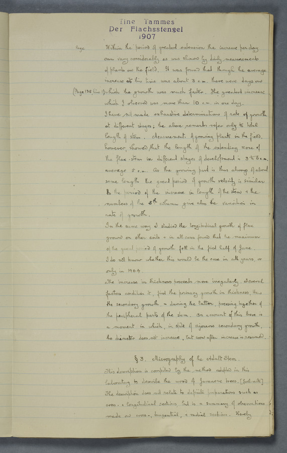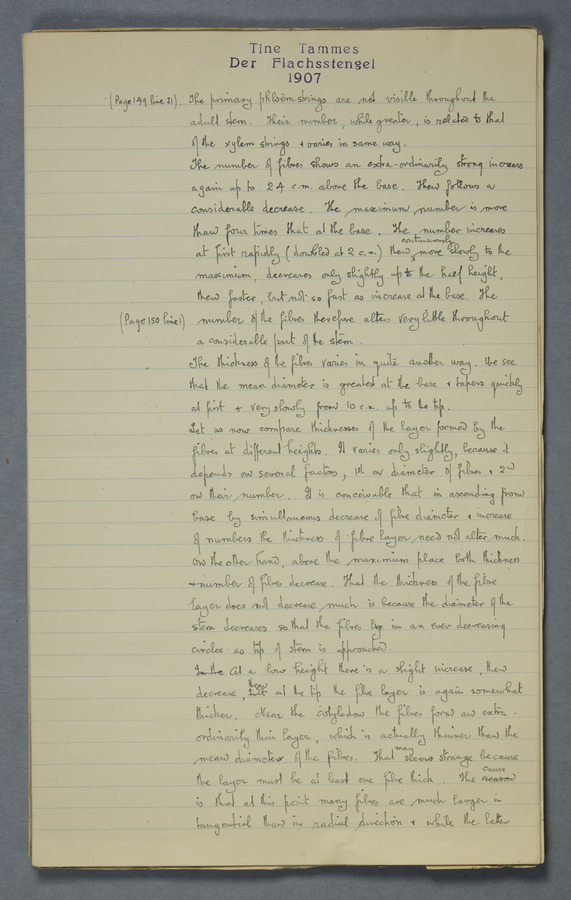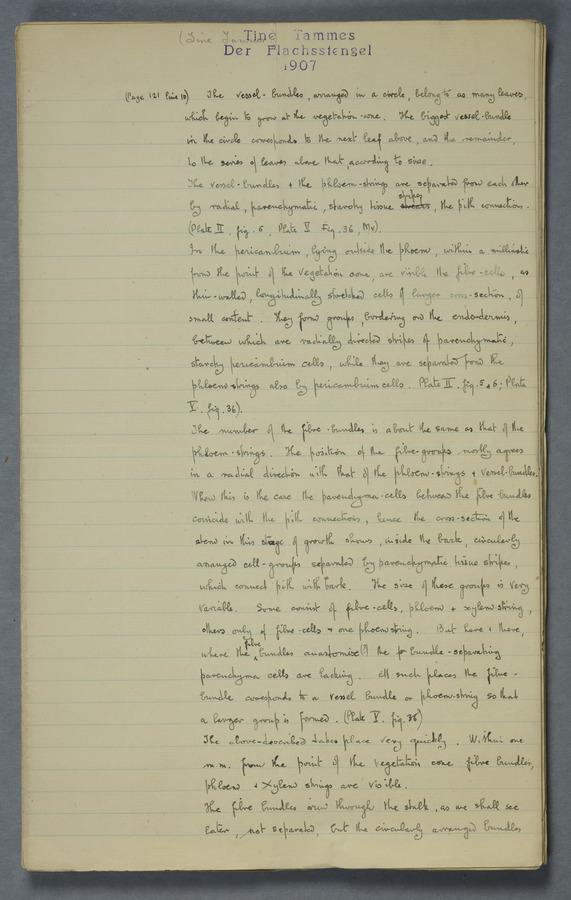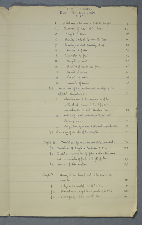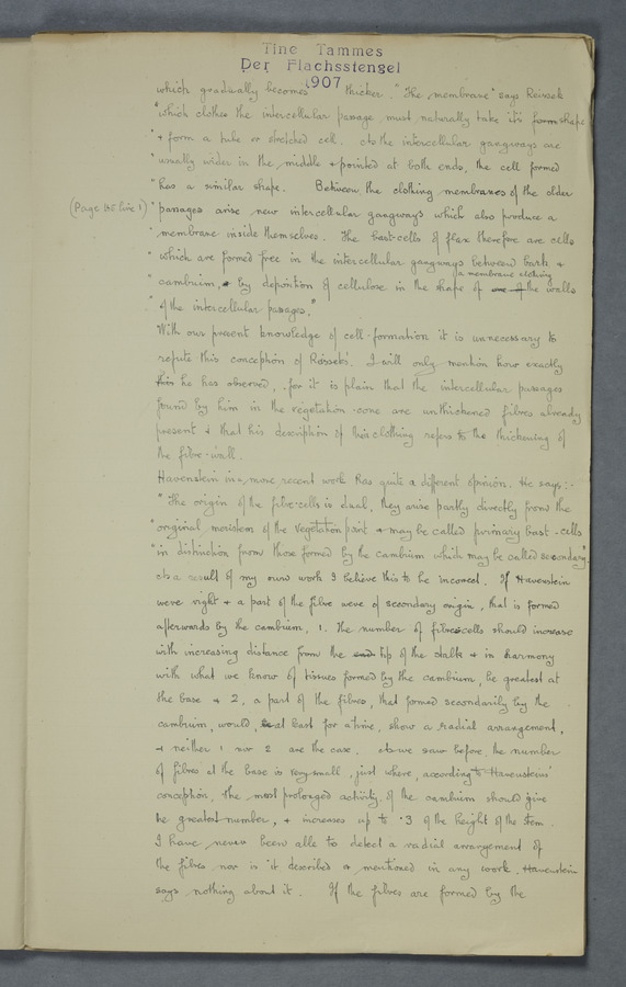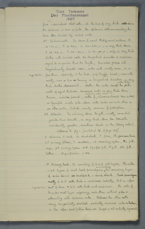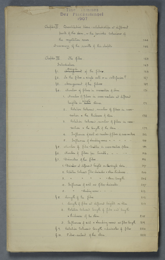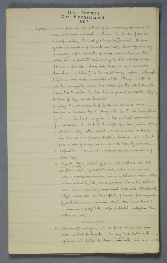 Notes from Tine Tammes, Der Flachsstengel: eine statistisch-anatomische Monographie (Verhandeling v. d. Hollandsche Maatsch. d. Wetensch., 3 vi 4, 1908). No date. MS. 52 ff. Original paper dated 1907 by FKJ
