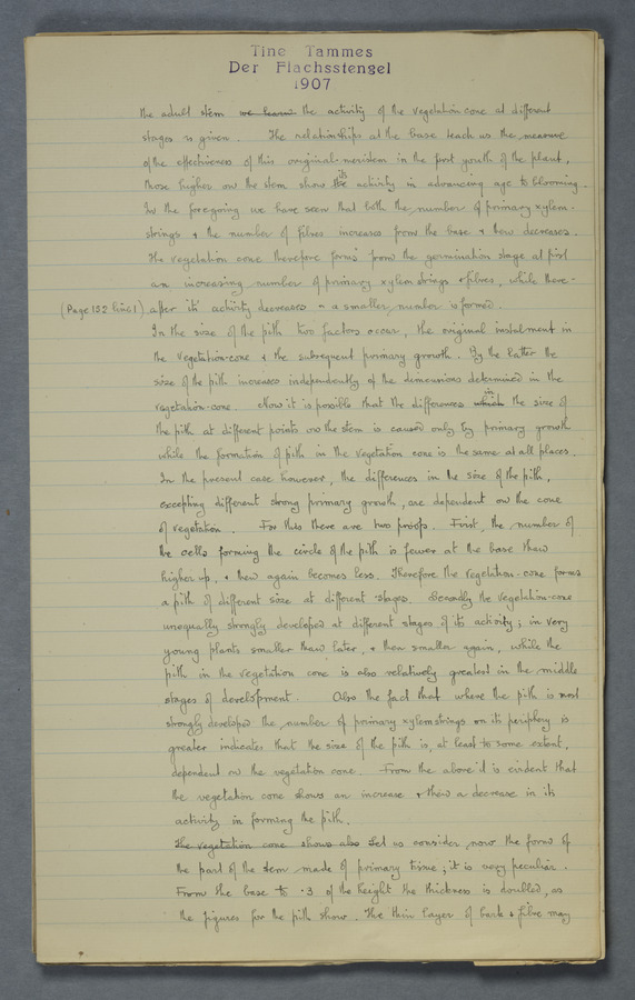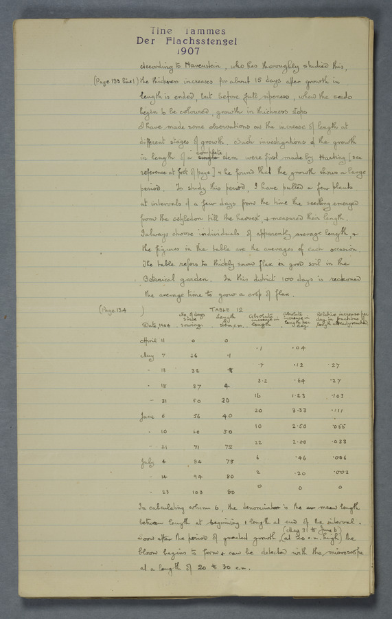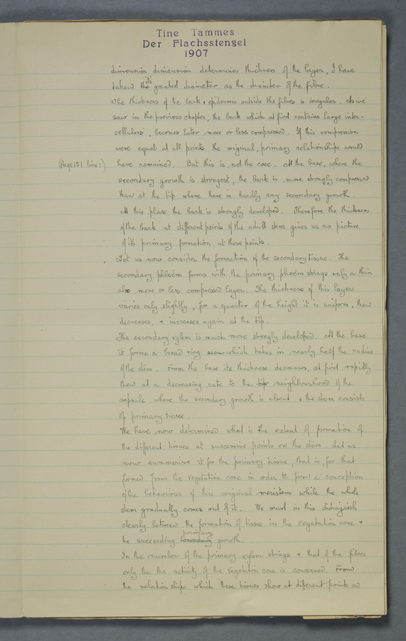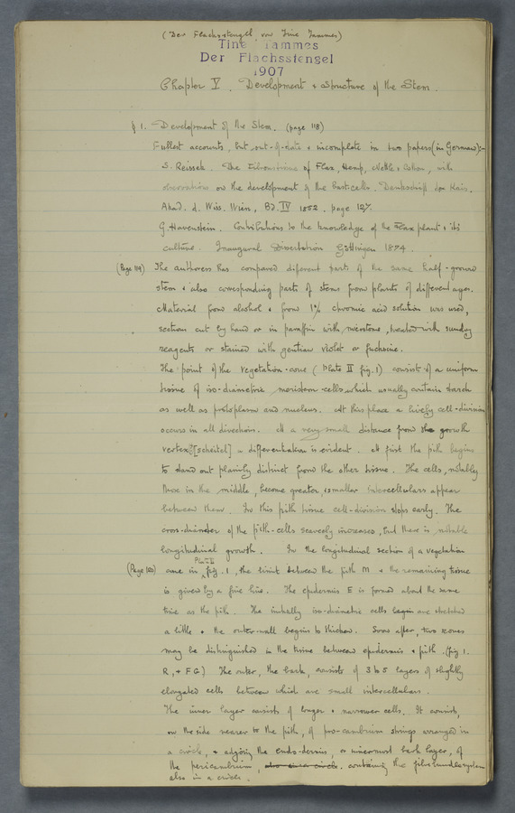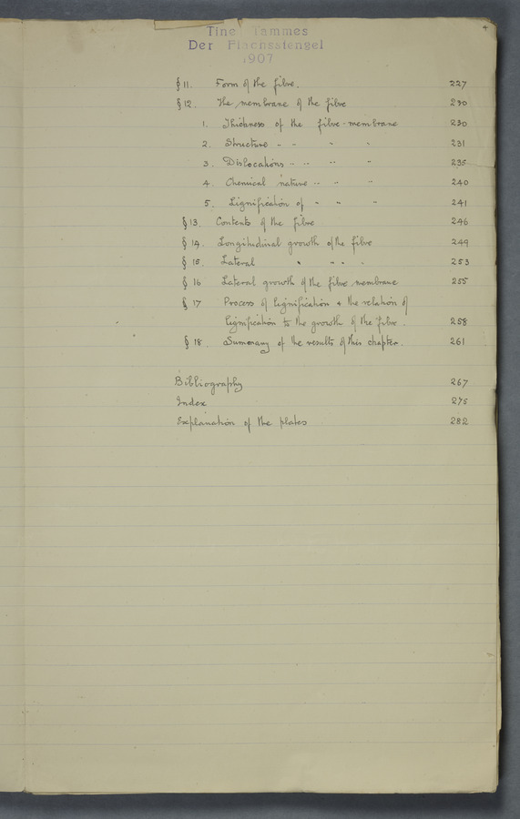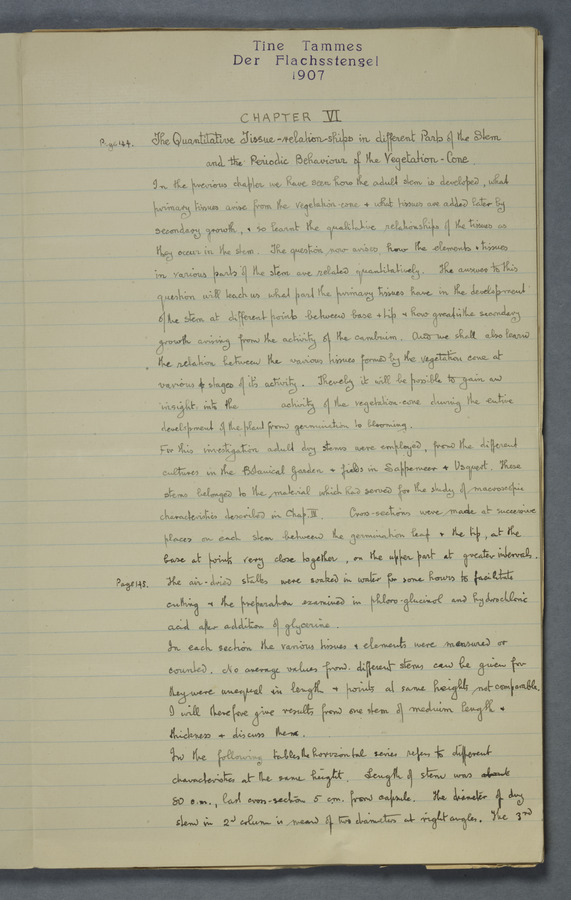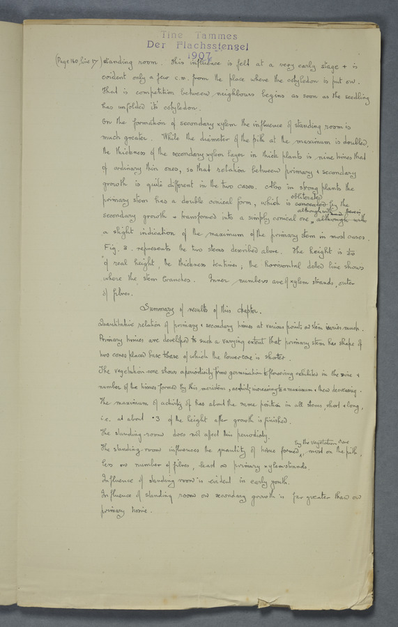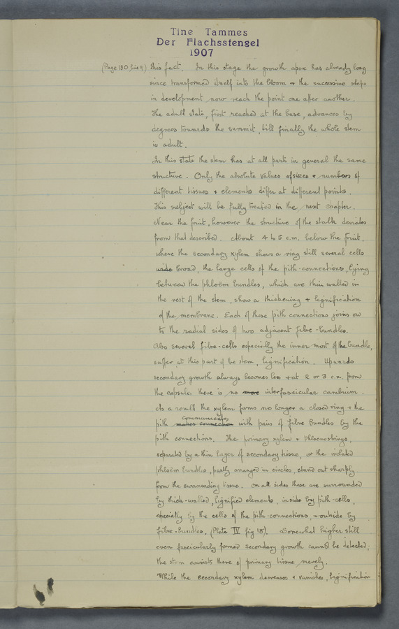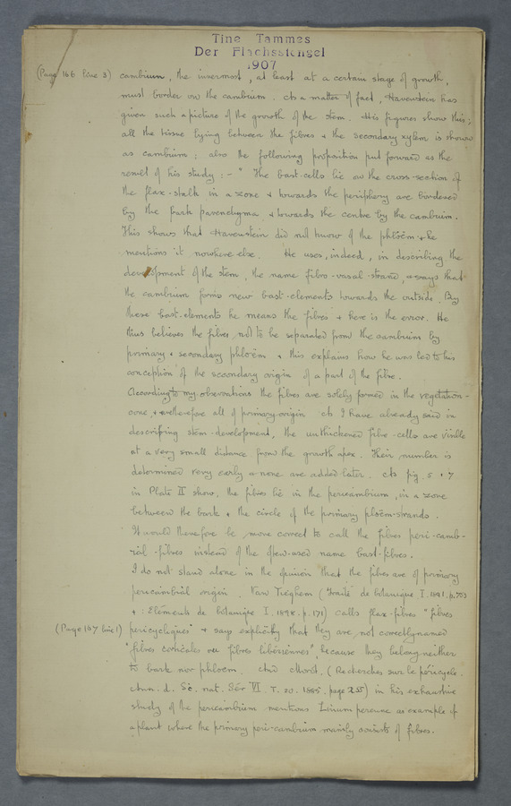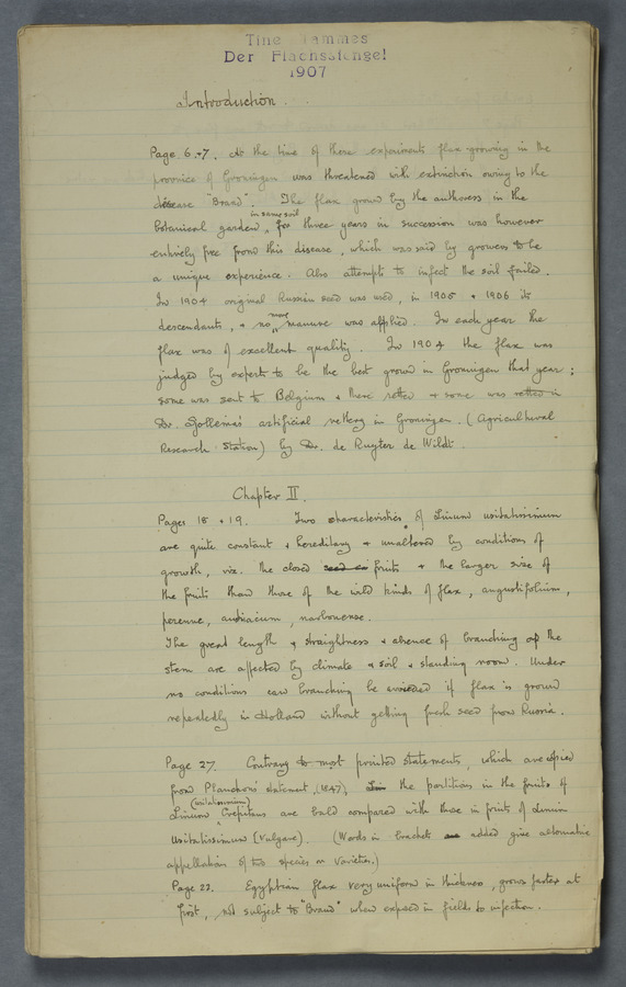 Notes from Tine Tammes, Der Flachsstengel: eine statistisch-anatomische Monographie (Verhandeling v. d. Hollandsche Maatsch. d. Wetensch., 3 vi 4, 1908). No date. MS. 52 ff. Original paper dated 1907 by FKJ