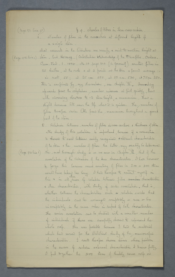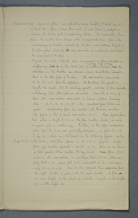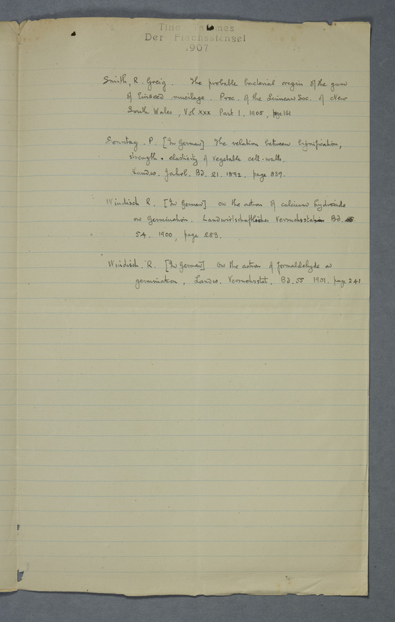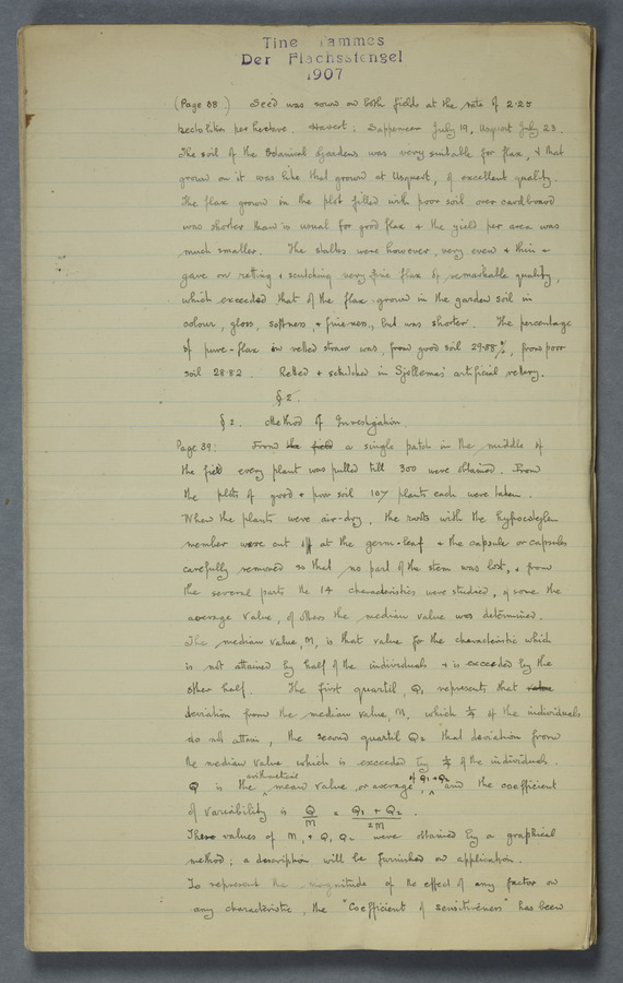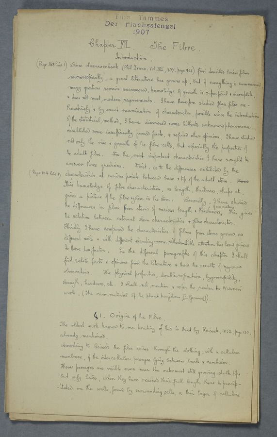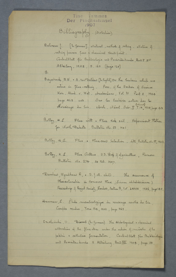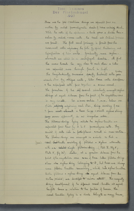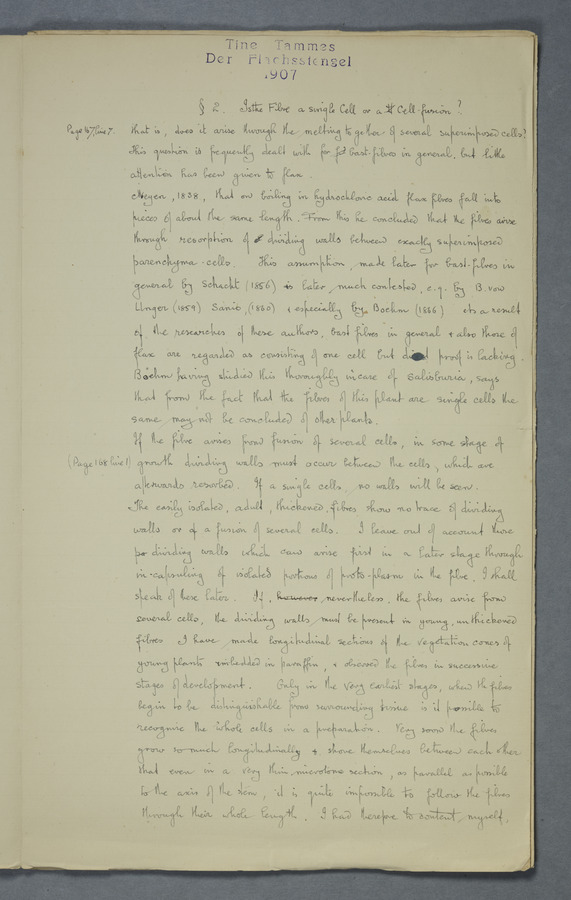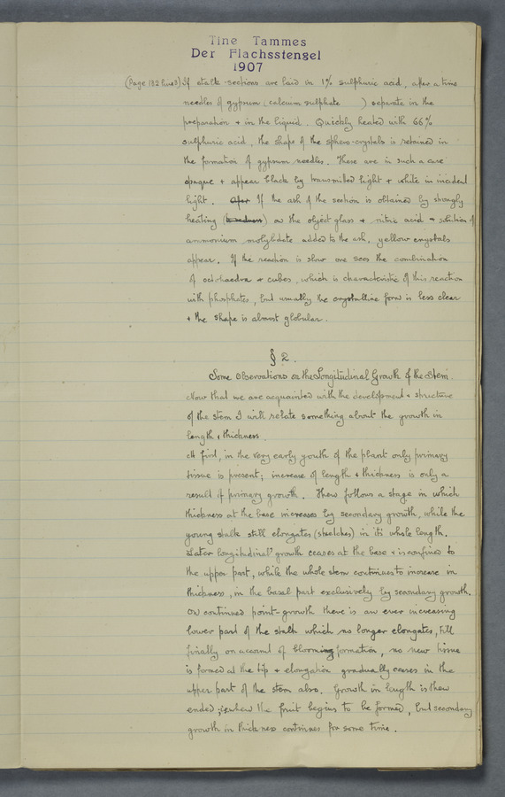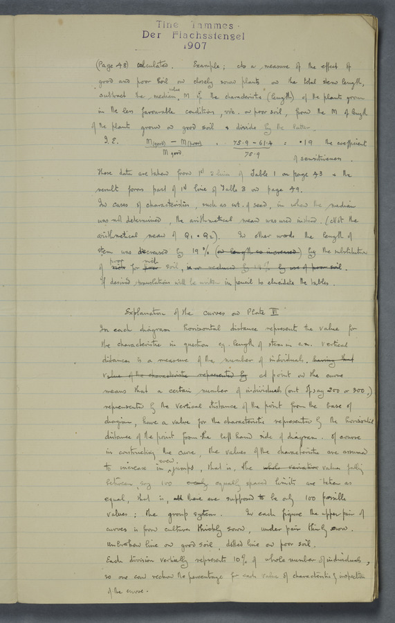 Notes from Tine Tammes, Der Flachsstengel: eine statistisch-anatomische Monographie (Verhandeling v. d. Hollandsche Maatsch. d. Wetensch., 3 vi 4, 1908). No date. MS. 52 ff. Original paper dated 1907 by FKJ