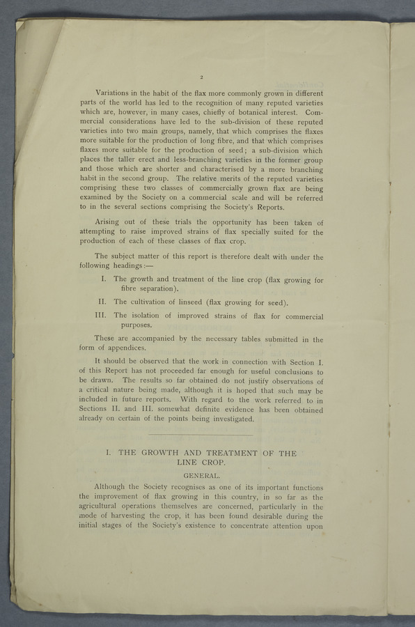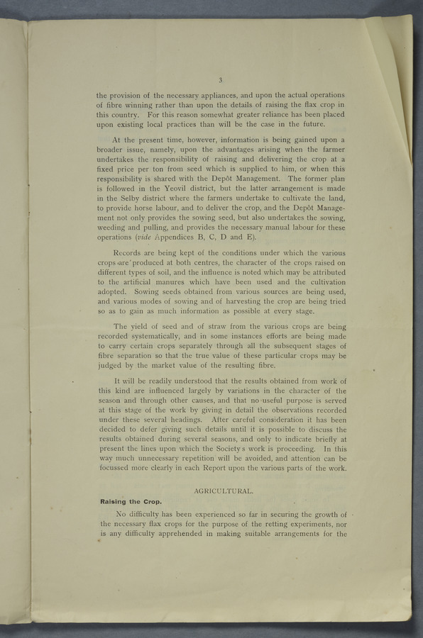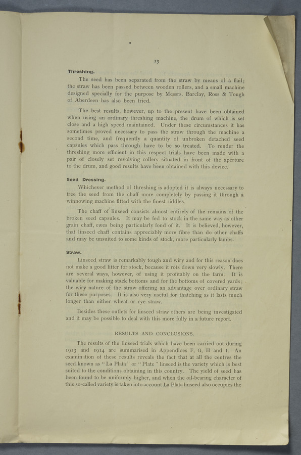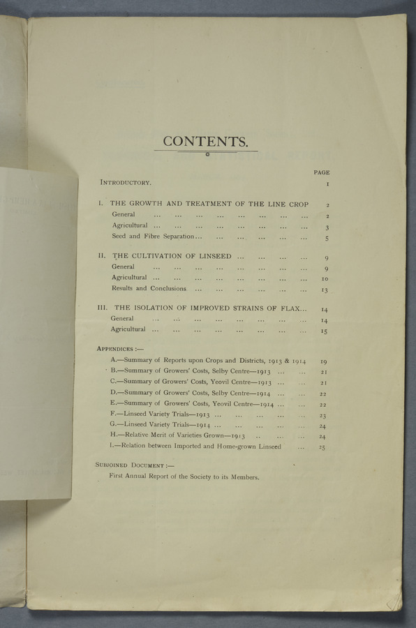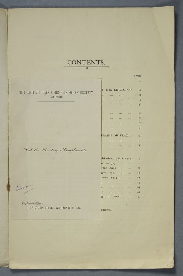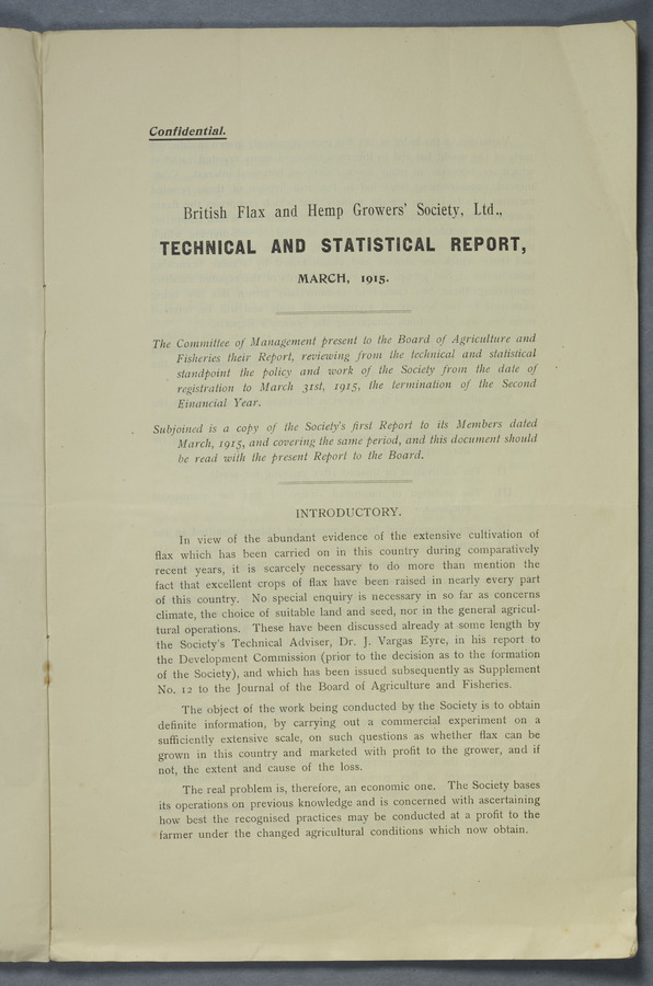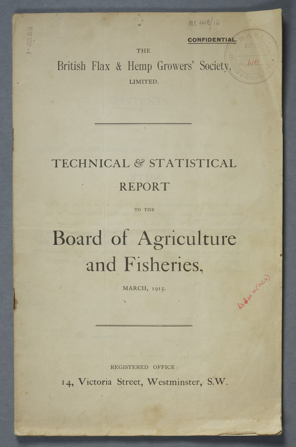 British Flax and Hemp Growers' Society. Technical & statistical report to the Board of Agriculture and Fisheries, March 1915. London, [(?)1916]. Rubber stamp of DATI, Statistics & Intelligence Branch, Library on t.p., together with date '1 Jun. 1916'.