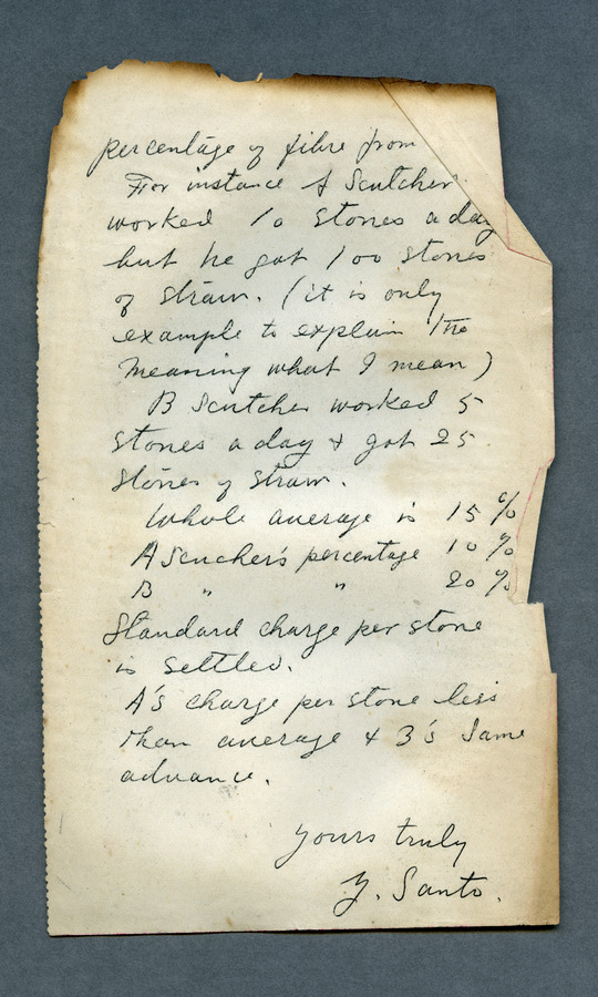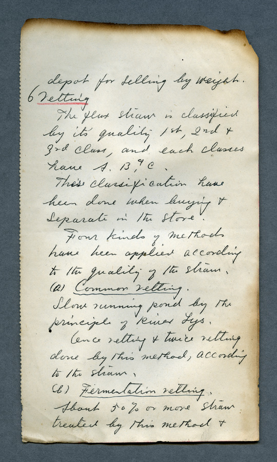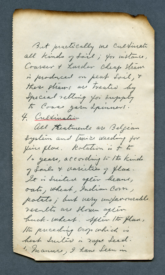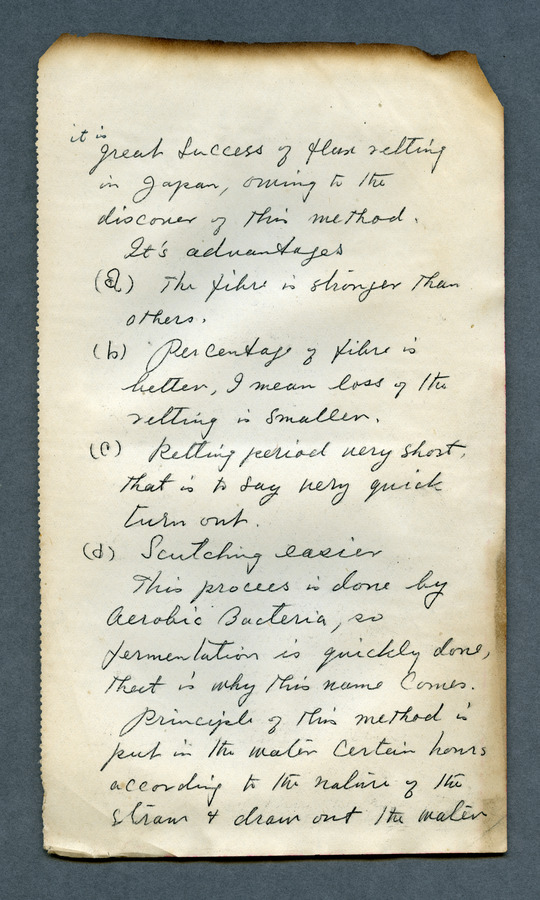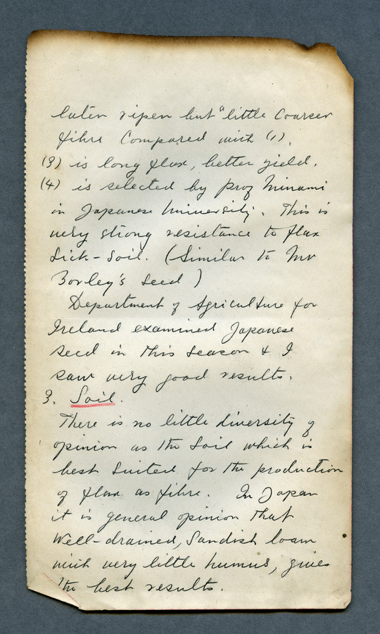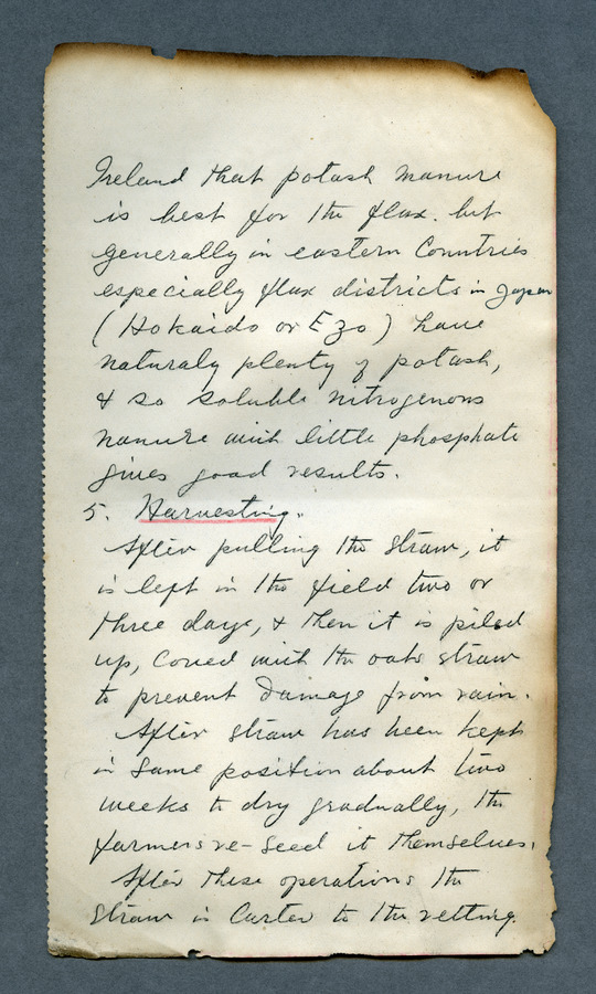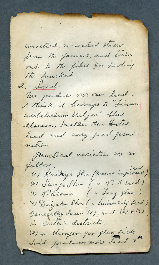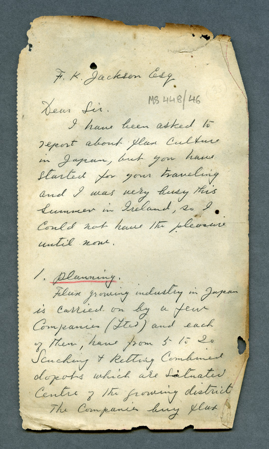 Letter from Y Santo, no address or date, to FKJ, about flax growing in Japan. MS. 10 ff. In English, and presumably a translation of the original letter.