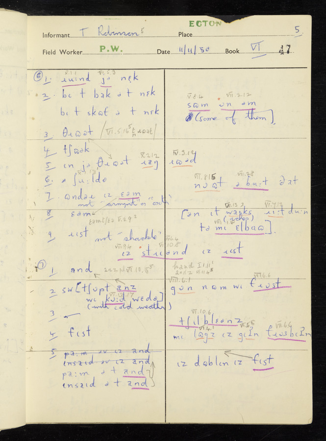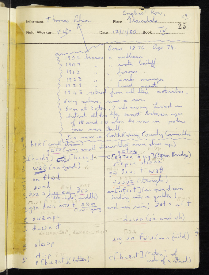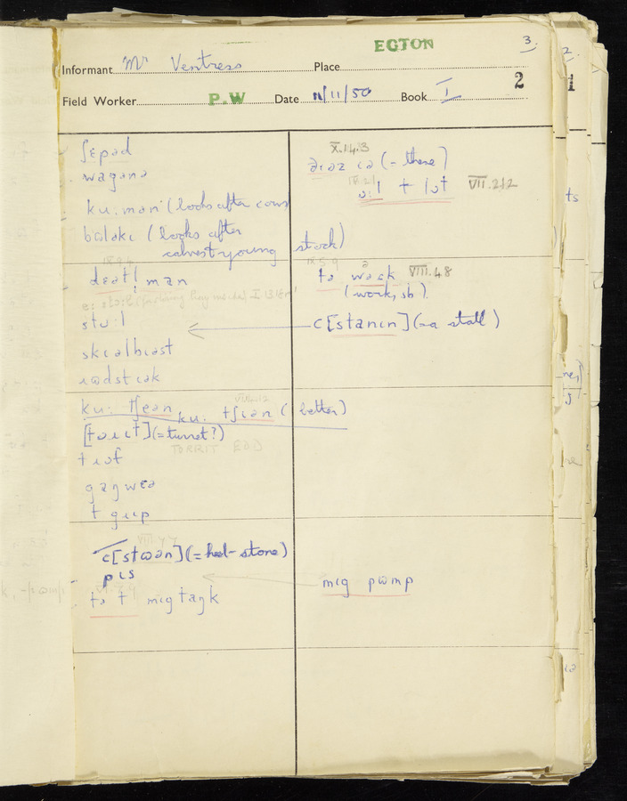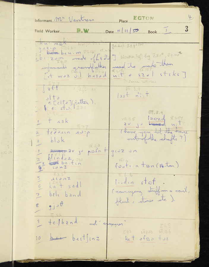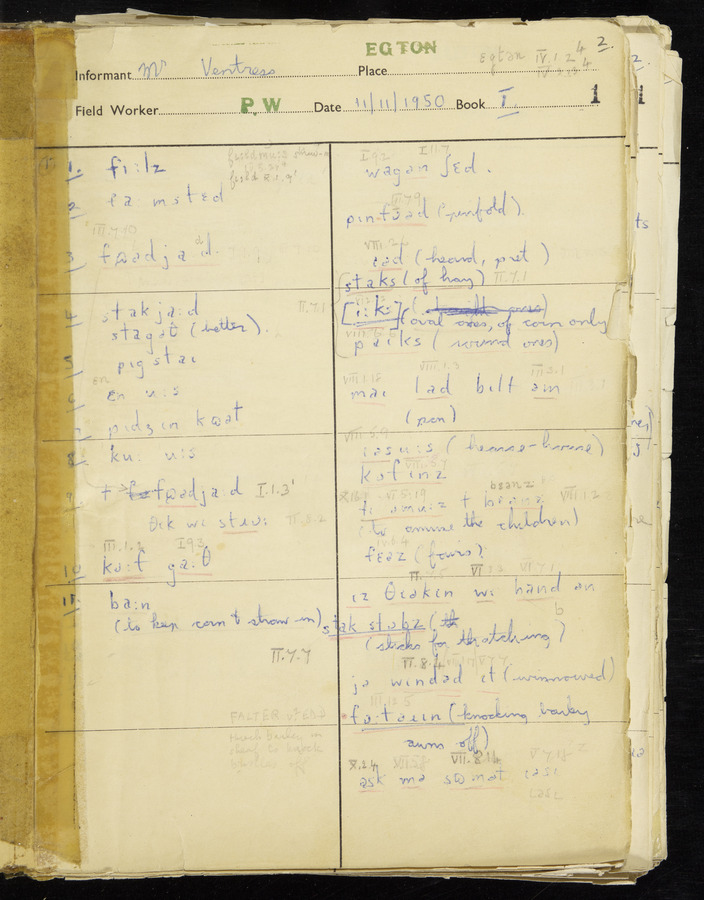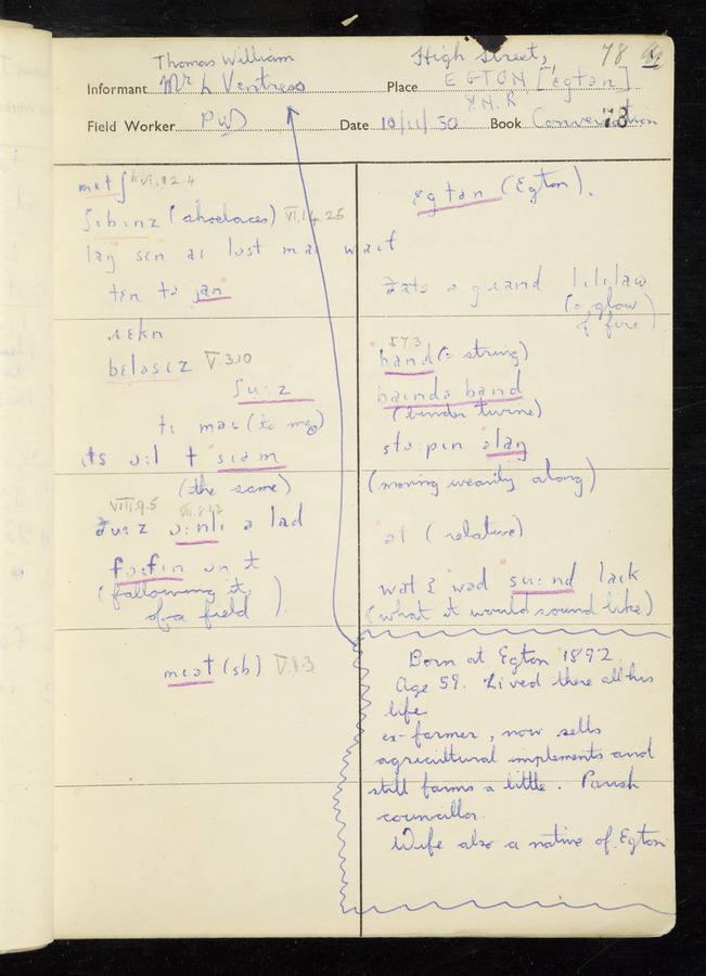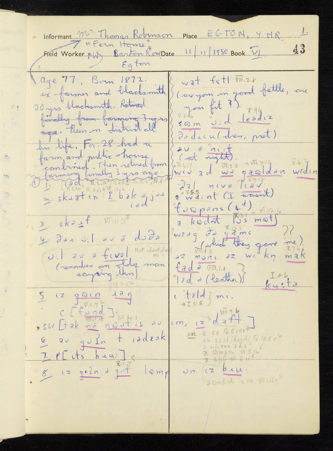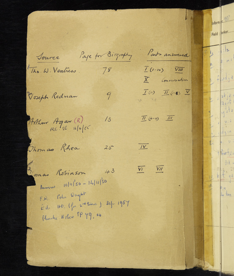 Interviews have been carried out by fieldworker Peter Wright. There are five informants for this response book - Thomas William Ventress, Joseph Redman, Arthur Agar, Thomas Rhea, and Thomas Robinson. Their responses can be found in the following books: Thomas W. Ventress - I, VIII Joseph Redman - I, II, V Arthur Agar - II, III Thomas Rhea - IV Thomas Robinson - VI, VII
