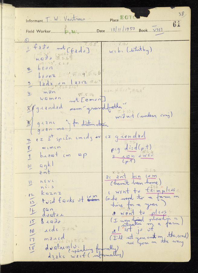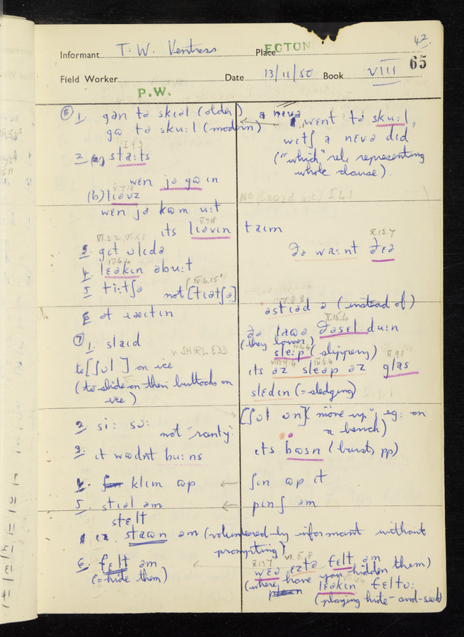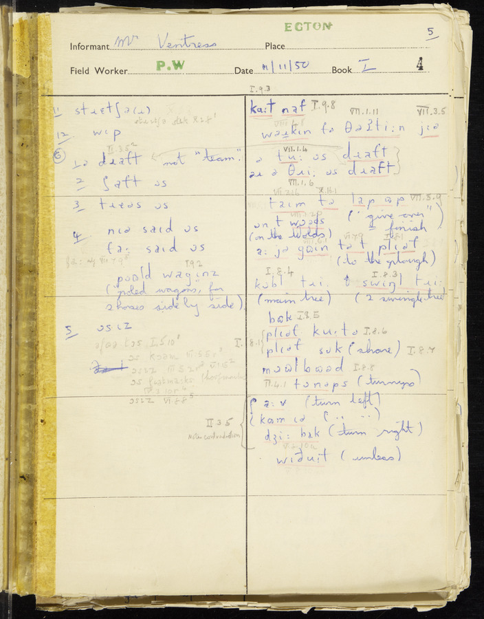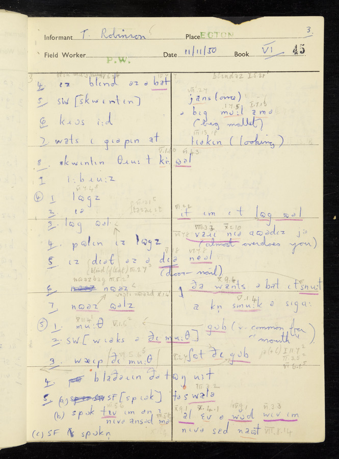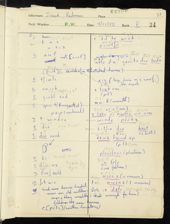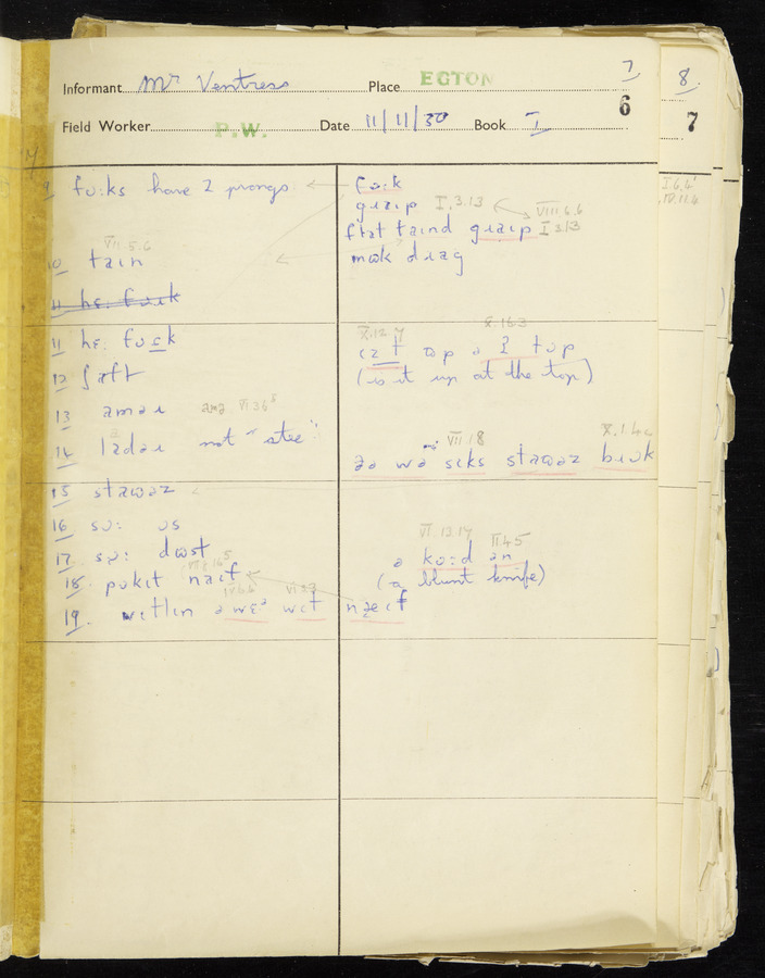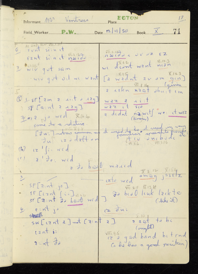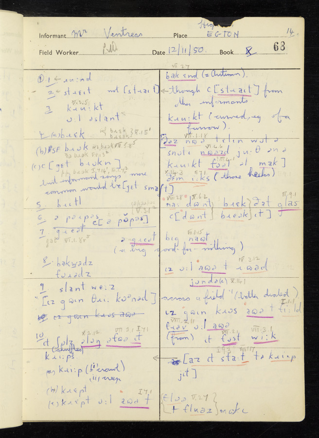 Interviews have been carried out by fieldworker Peter Wright. There are five informants for this response book - Thomas William Ventress, Joseph Redman, Arthur Agar, Thomas Rhea, and Thomas Robinson. Their responses can be found in the following books: Thomas W. Ventress - I, VIII Joseph Redman - I, II, V Arthur Agar - II, III Thomas Rhea - IV Thomas Robinson - VI, VII