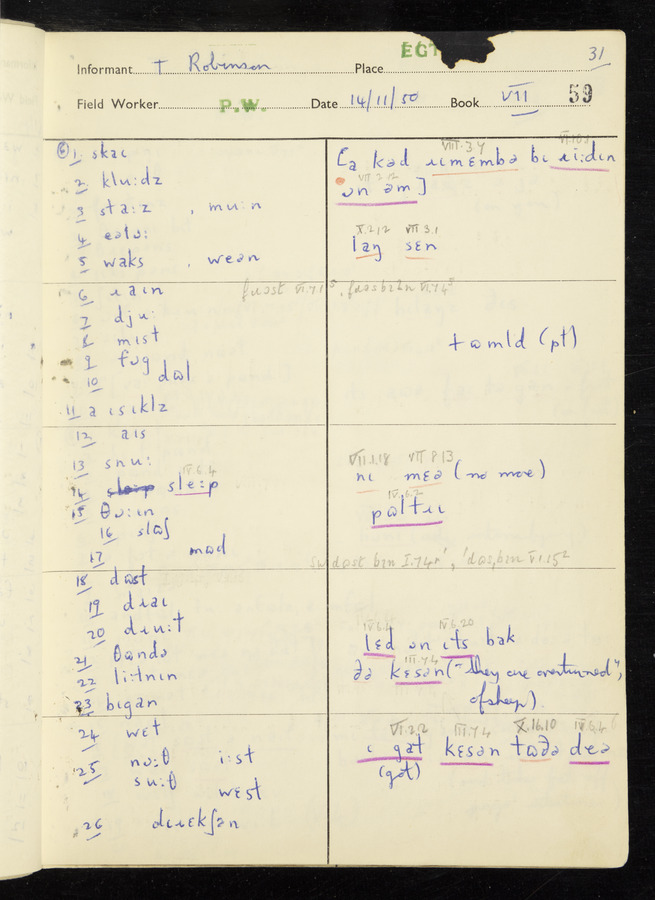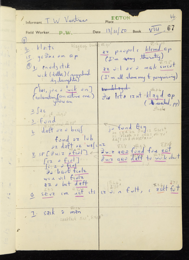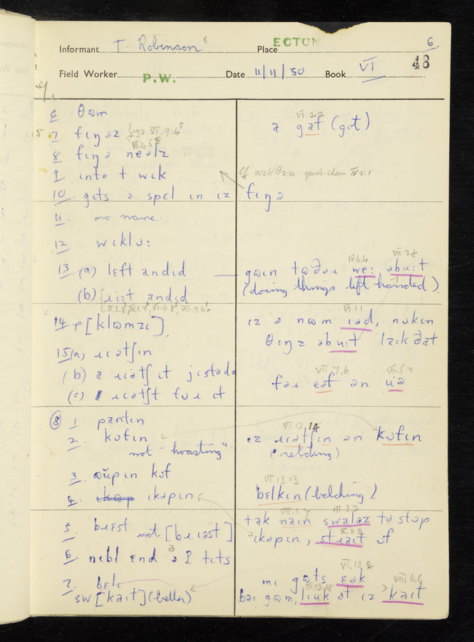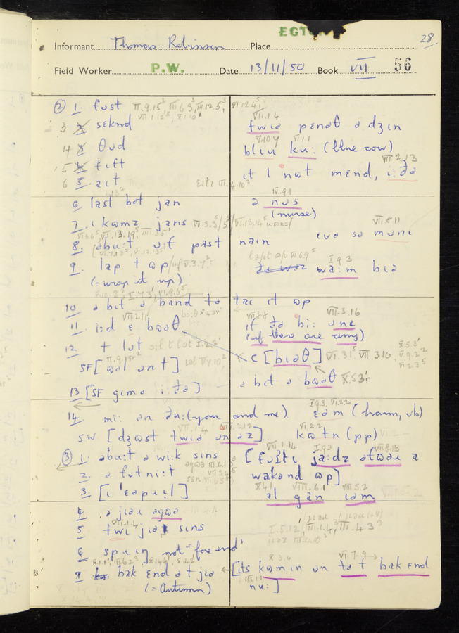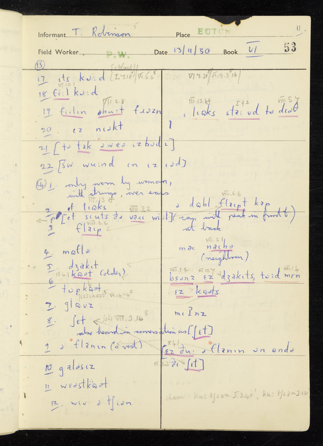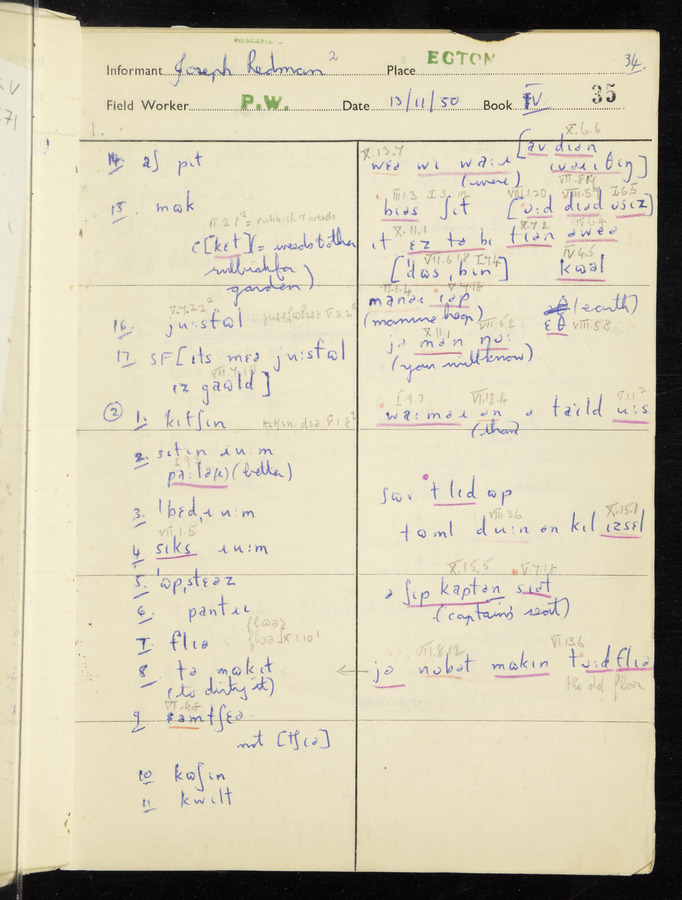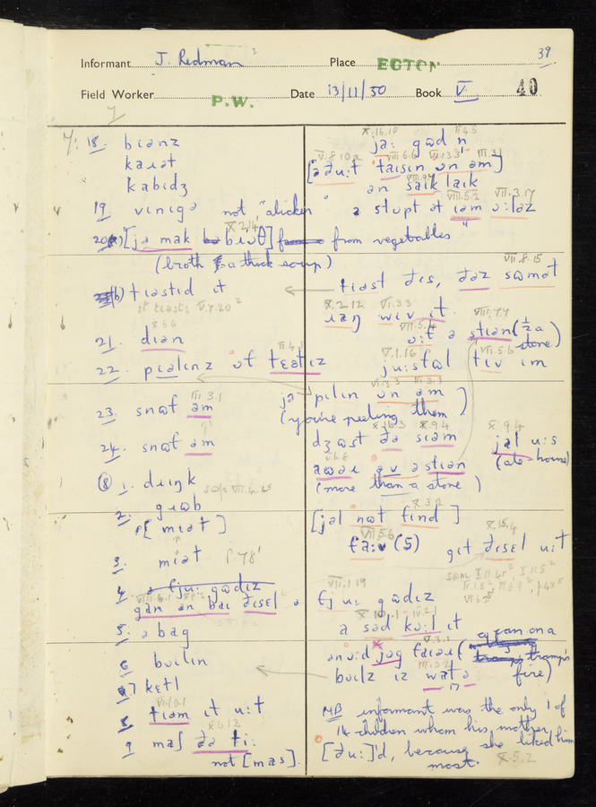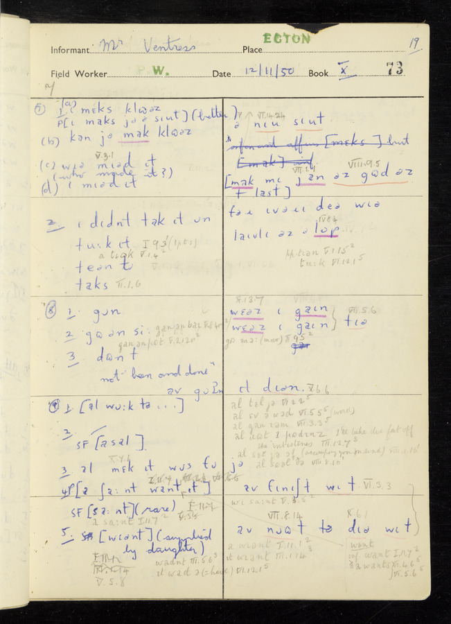 Interviews have been carried out by fieldworker Peter Wright. There are five informants for this response book - Thomas William Ventress, Joseph Redman, Arthur Agar, Thomas Rhea, and Thomas Robinson. Their responses can be found in the following books: Thomas W. Ventress - I, VIII Joseph Redman - I, II, V Arthur Agar - II, III Thomas Rhea - IV Thomas Robinson - VI, VII