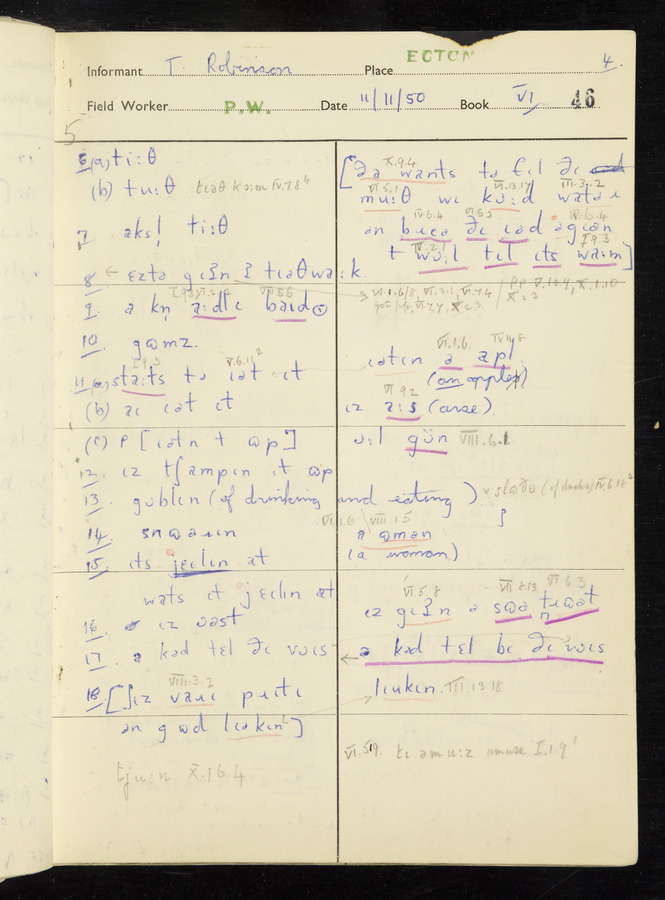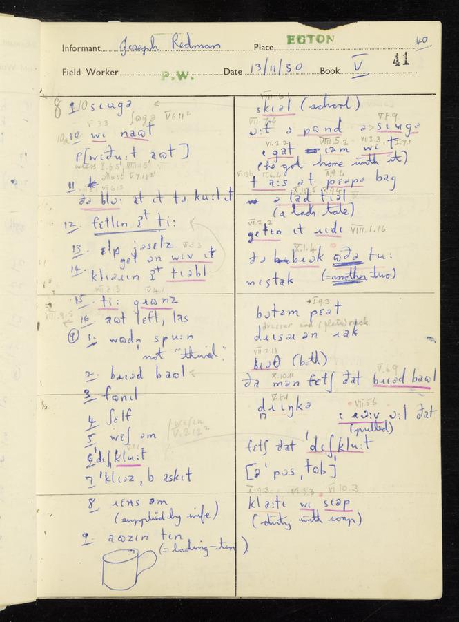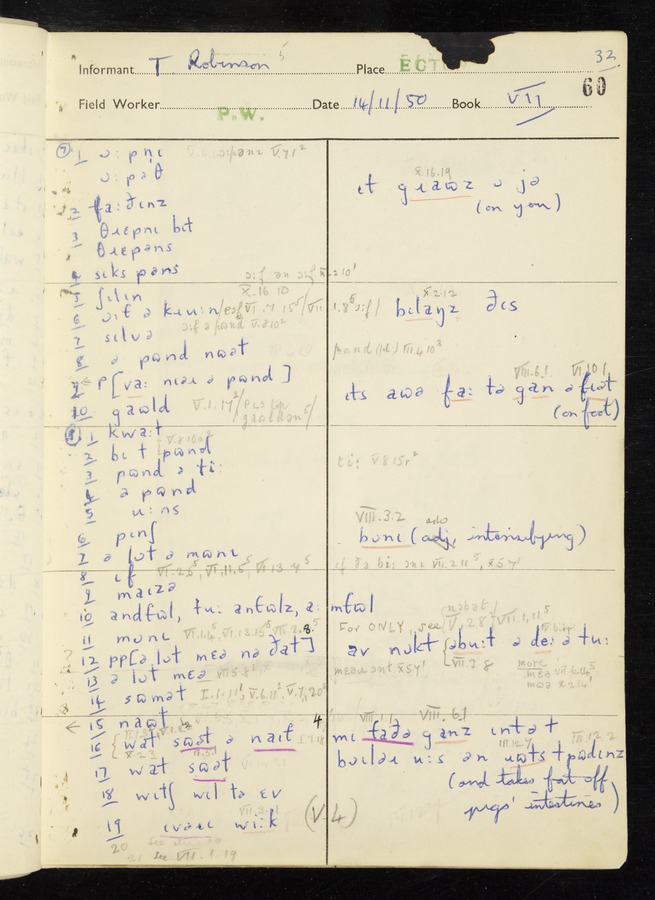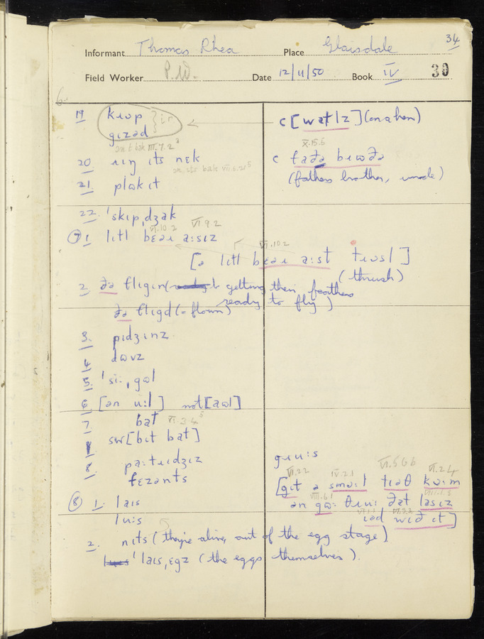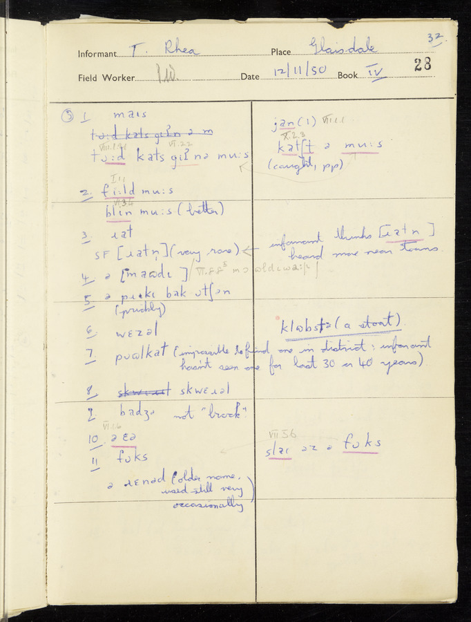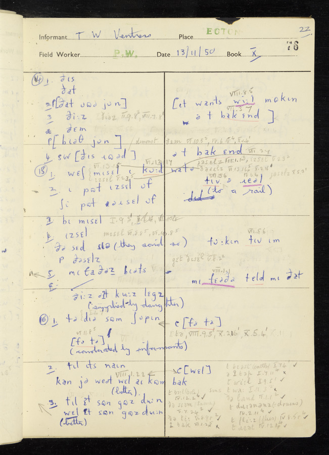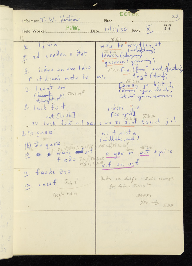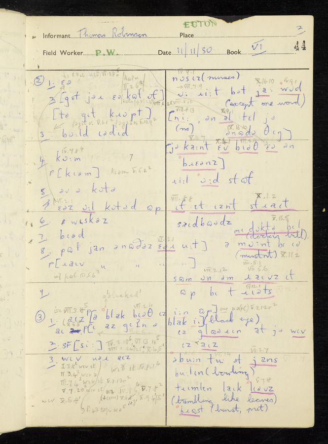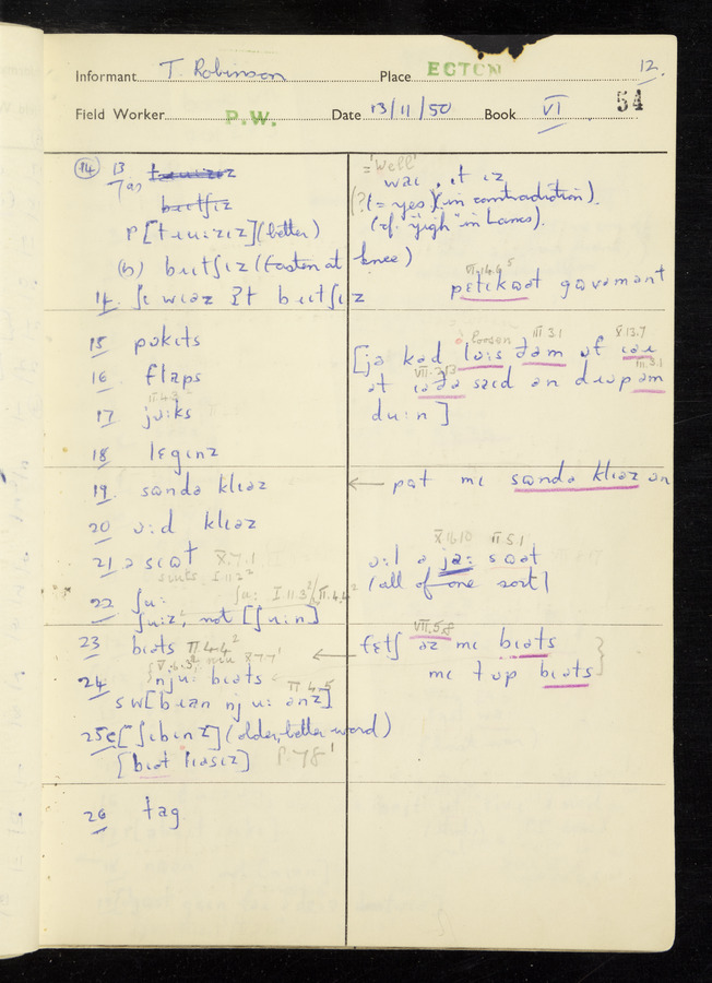 Interviews have been carried out by fieldworker Peter Wright. There are five informants for this response book - Thomas William Ventress, Joseph Redman, Arthur Agar, Thomas Rhea, and Thomas Robinson. Their responses can be found in the following books: Thomas W. Ventress - I, VIII Joseph Redman - I, II, V Arthur Agar - II, III Thomas Rhea - IV Thomas Robinson - VI, VII