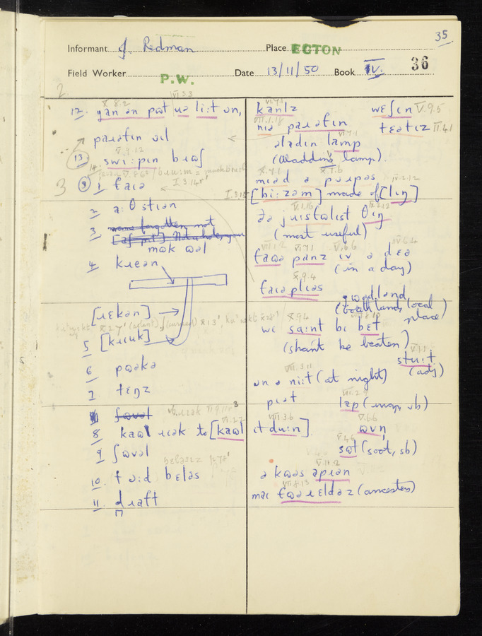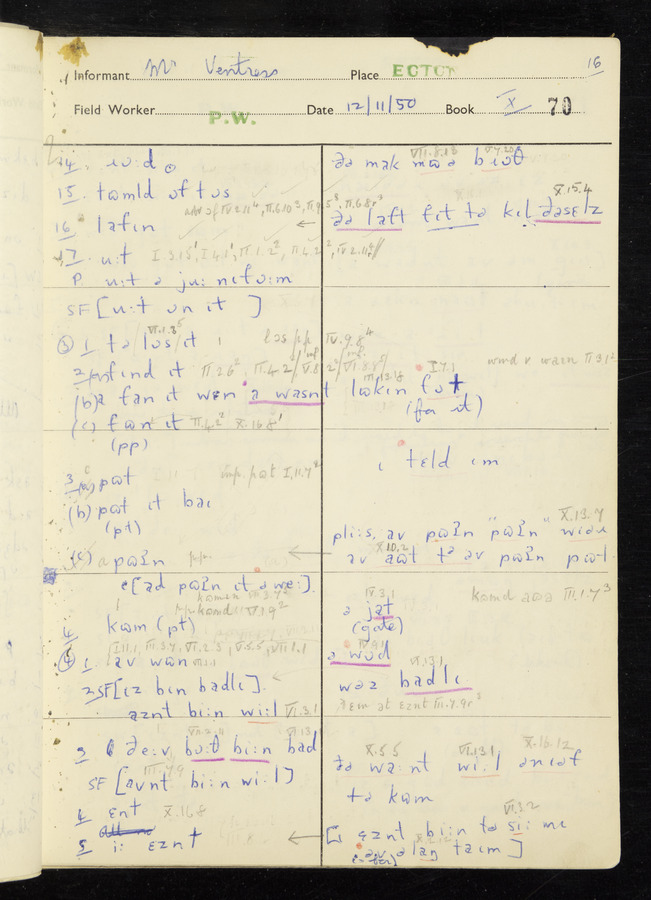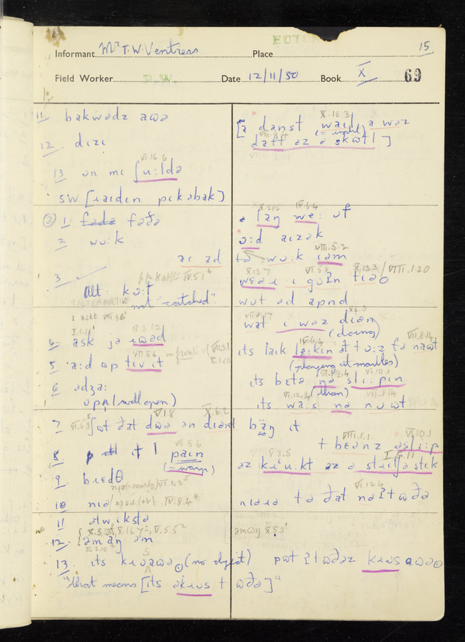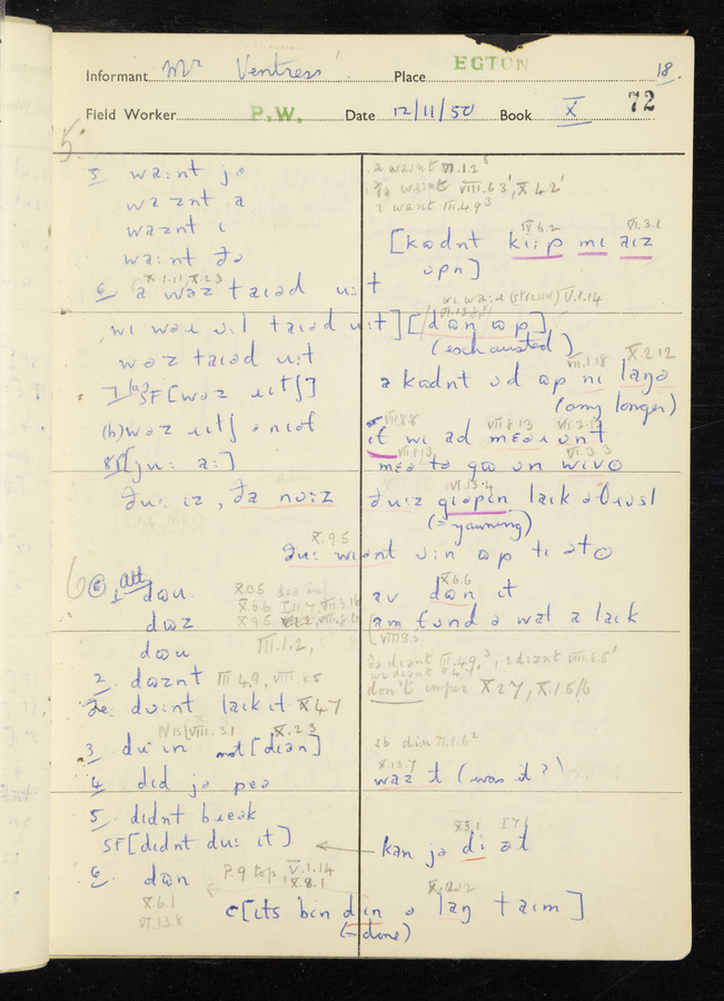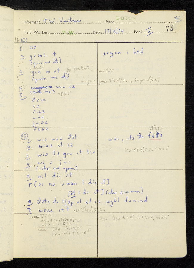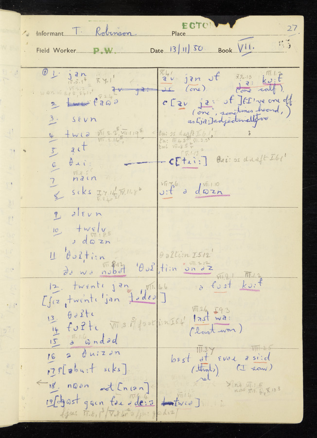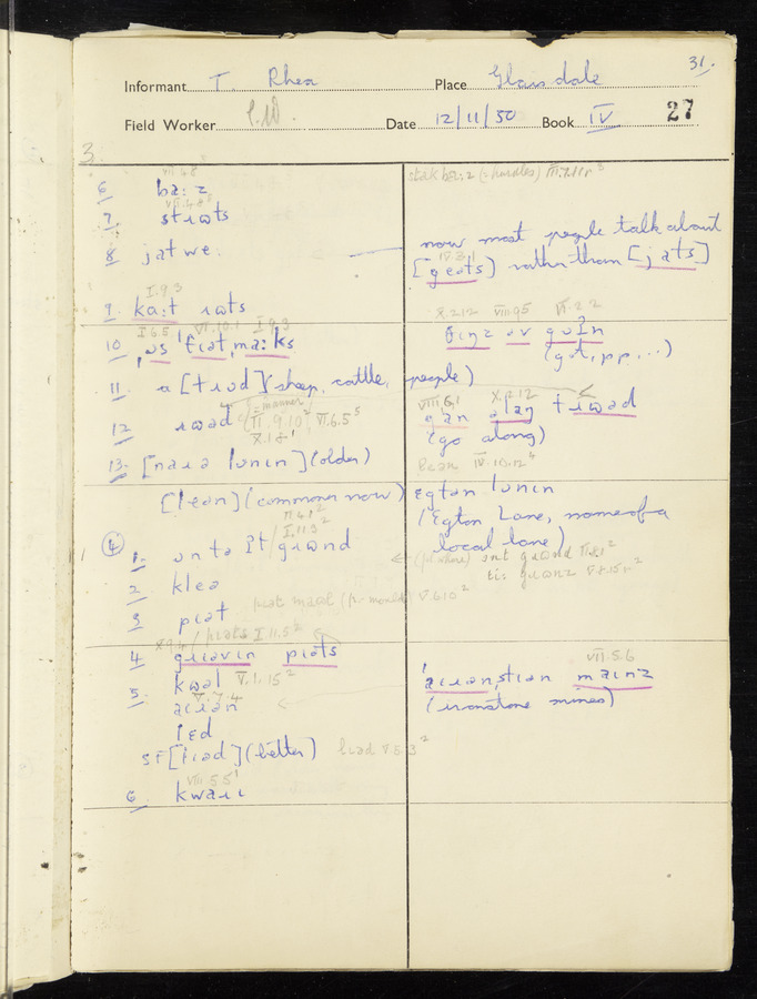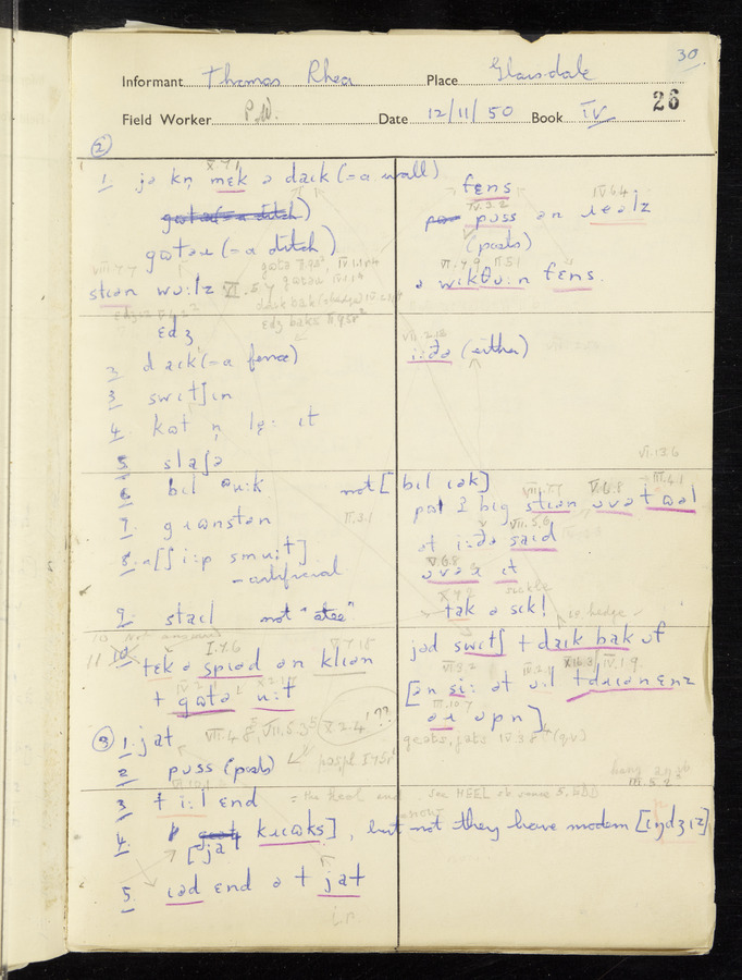 Interviews have been carried out by fieldworker Peter Wright. There are five informants for this response book - Thomas William Ventress, Joseph Redman, Arthur Agar, Thomas Rhea, and Thomas Robinson. Their responses can be found in the following books: Thomas W. Ventress - I, VIII Joseph Redman - I, II, V Arthur Agar - II, III Thomas Rhea - IV Thomas Robinson - VI, VII