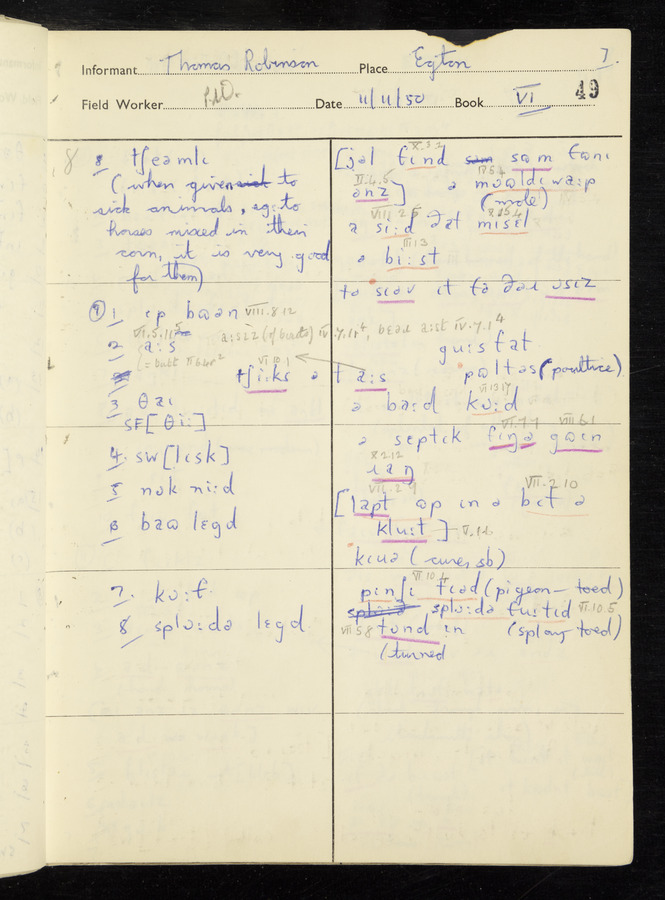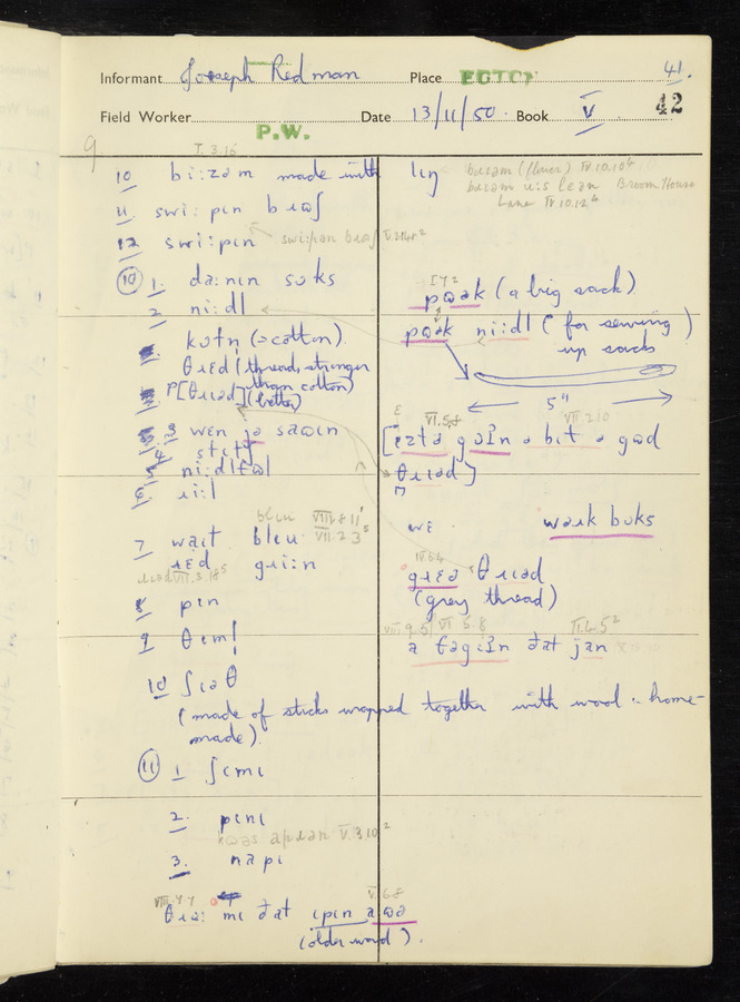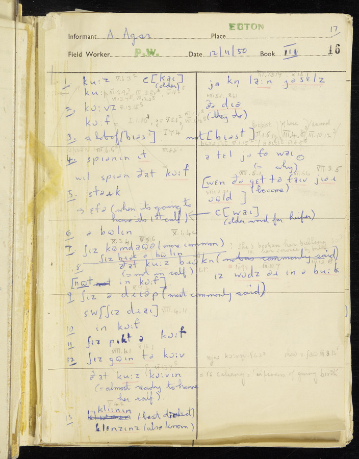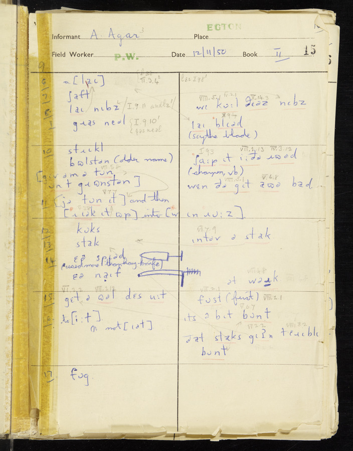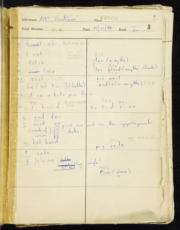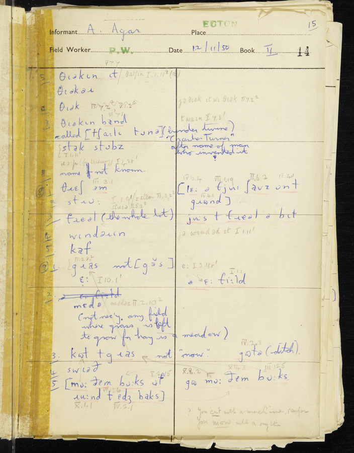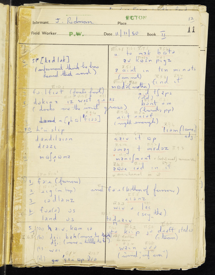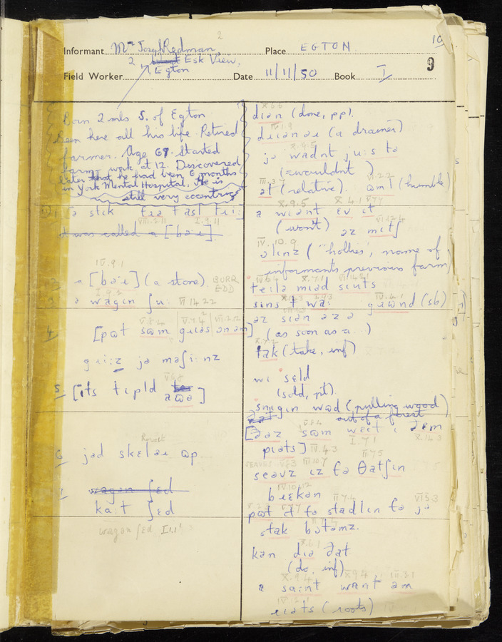 Response book recording the answers given by informants during the Survey of English Dialect. It includes 9 sections that cover a range of topics relating to work, domestic and social life. Answers are recorded in the International Phonetic Alphabet.