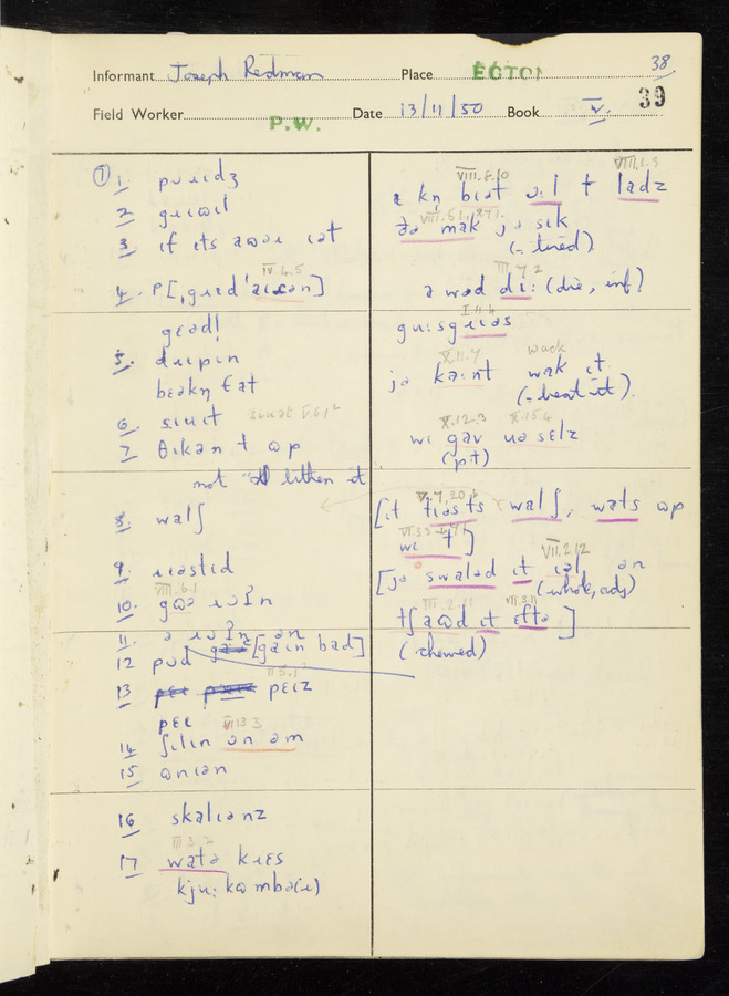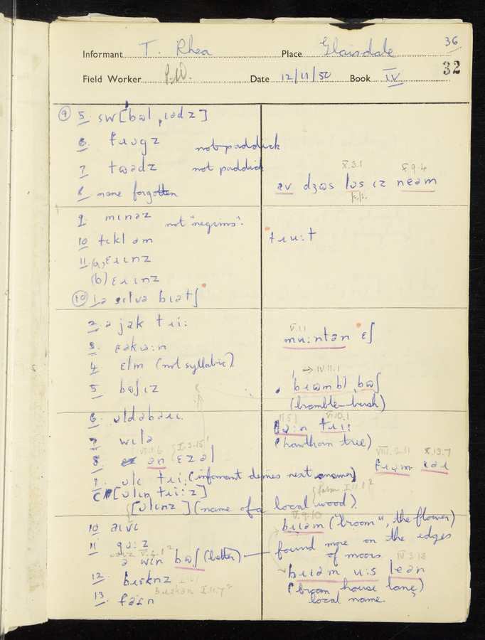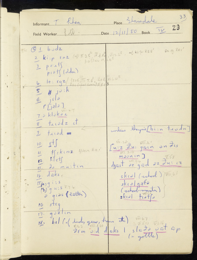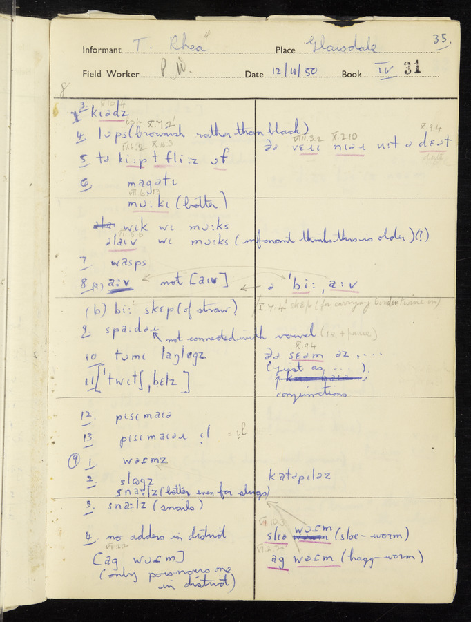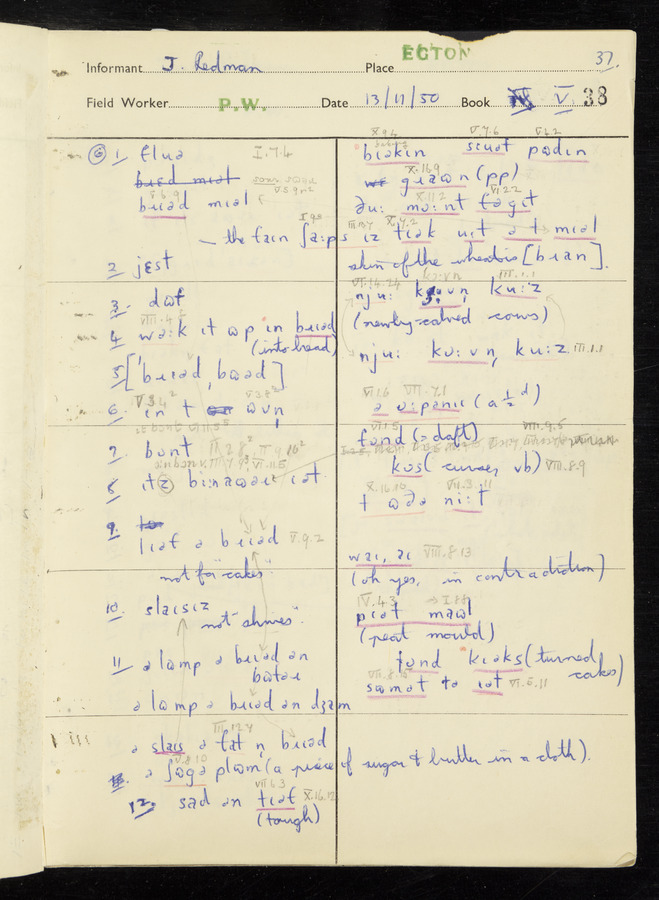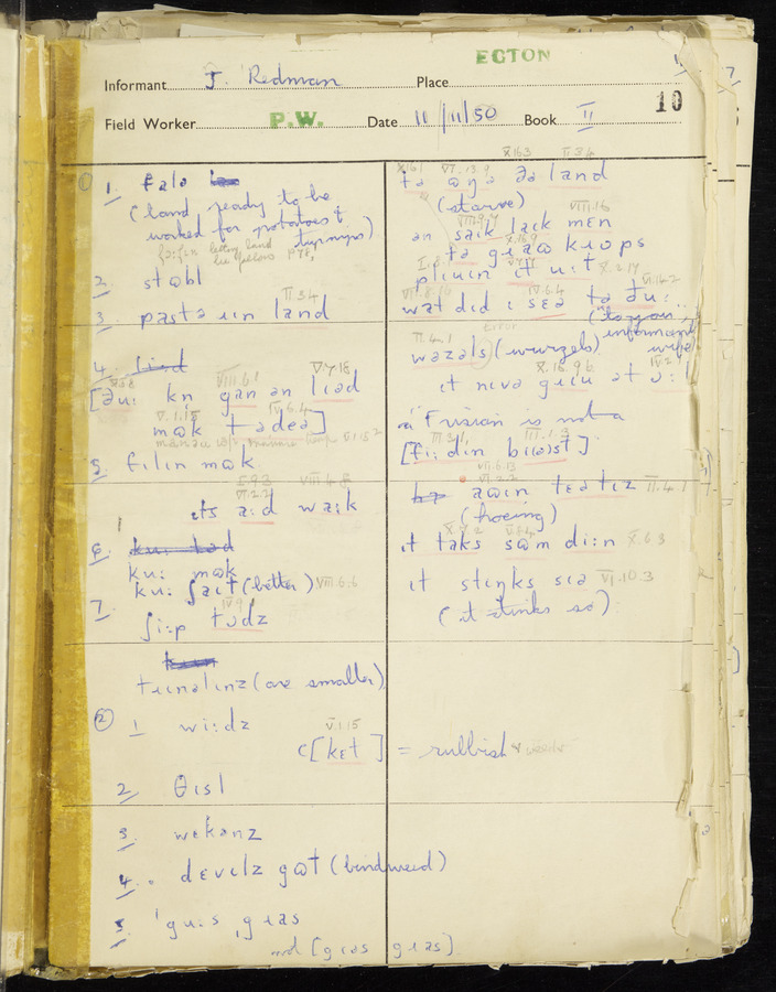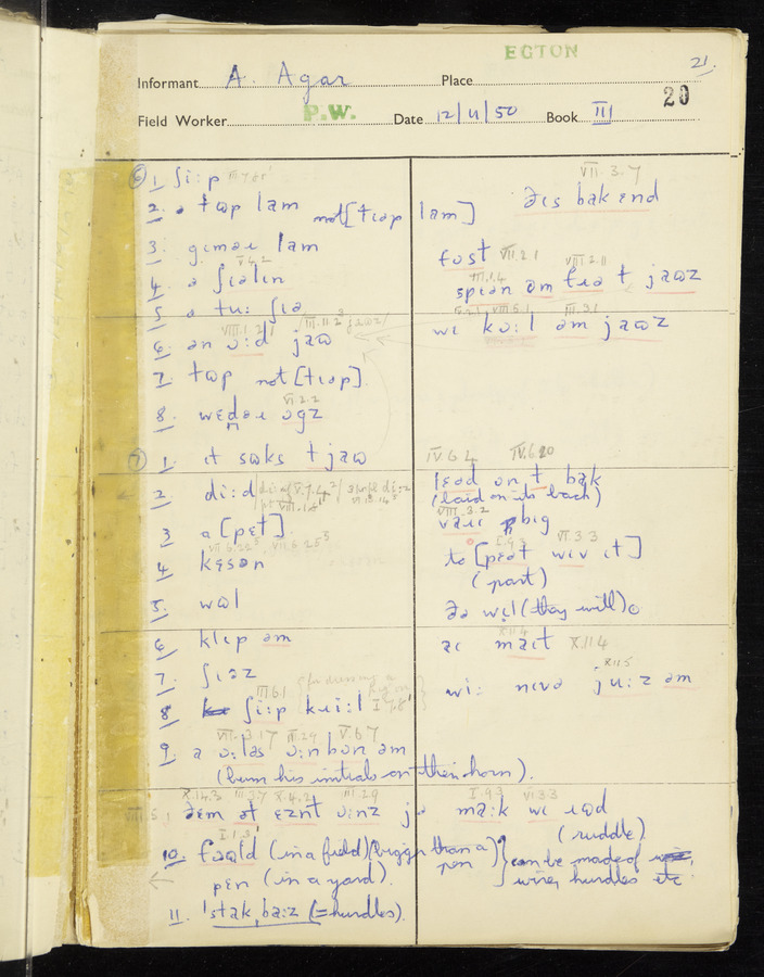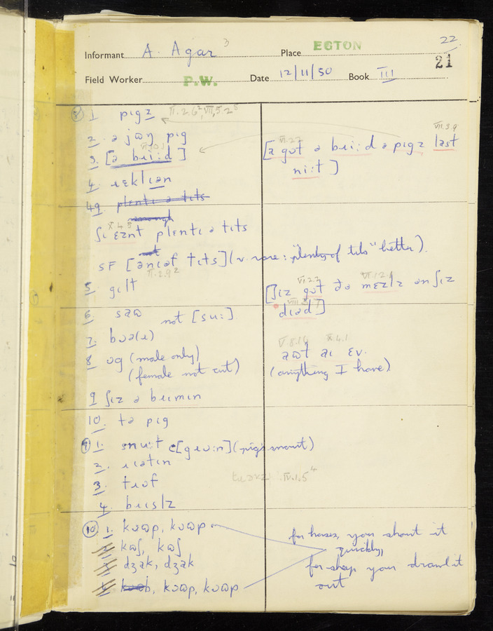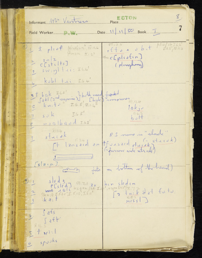Response book recording the answers given by informants during the Survey of English Dialect. It includes 9 sections that cover a range of topics relating to work, domestic and social life. Answers are recorded in the International Phonetic Alphabet.