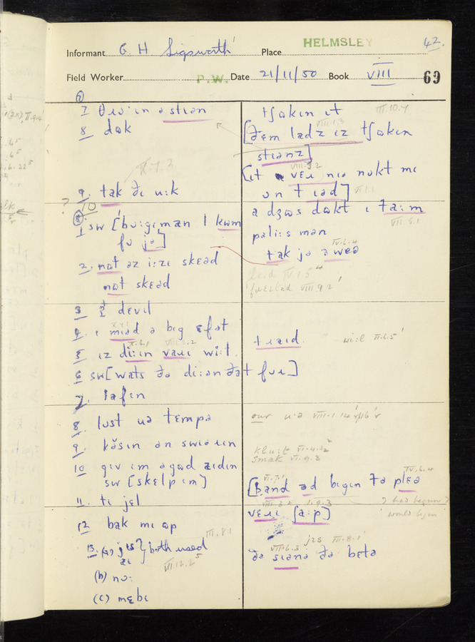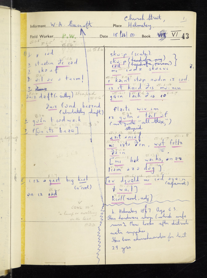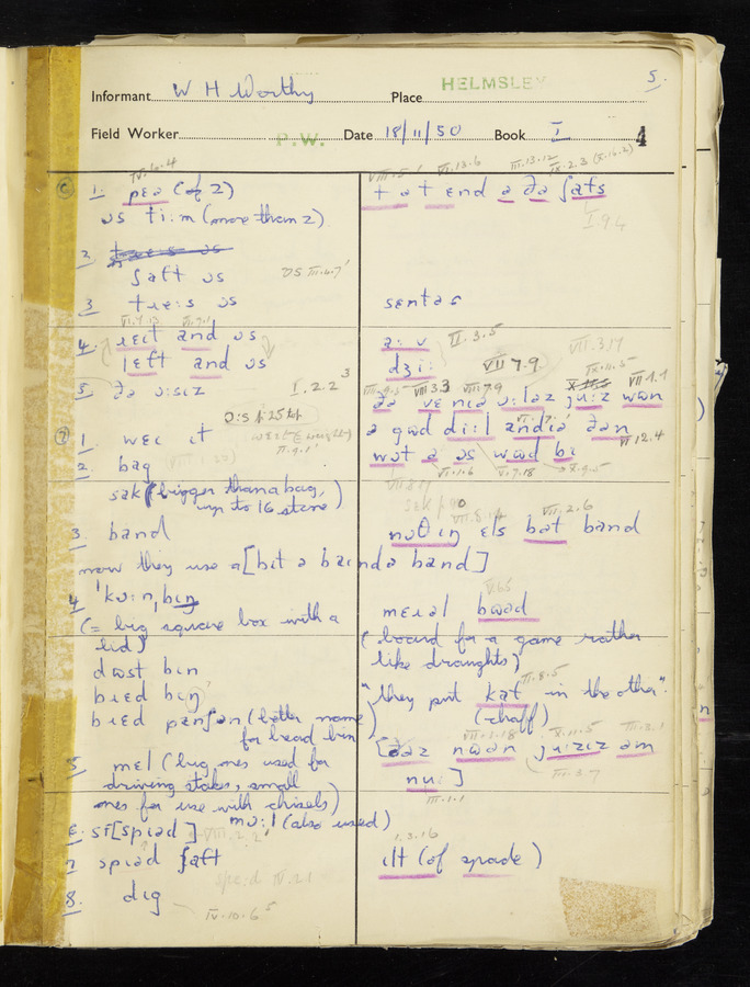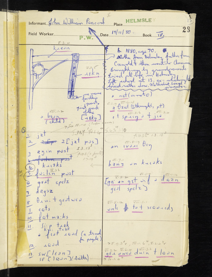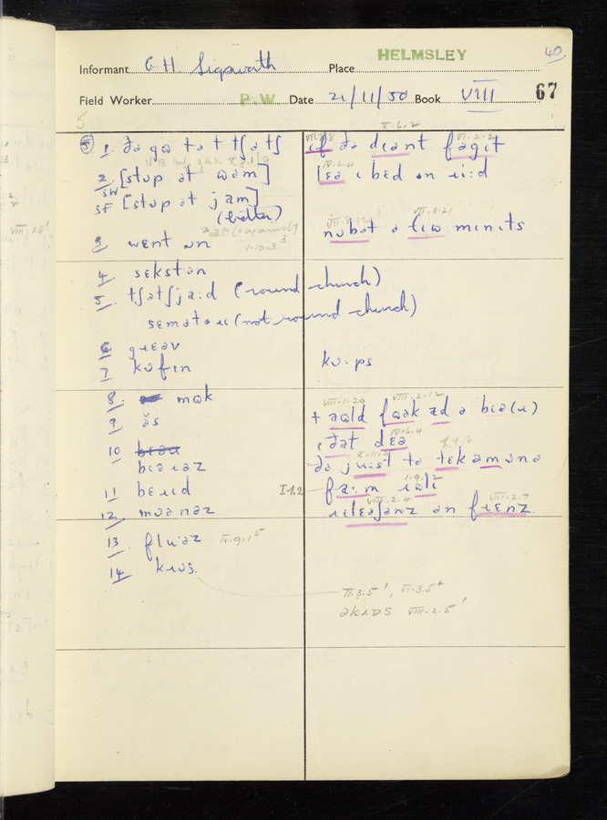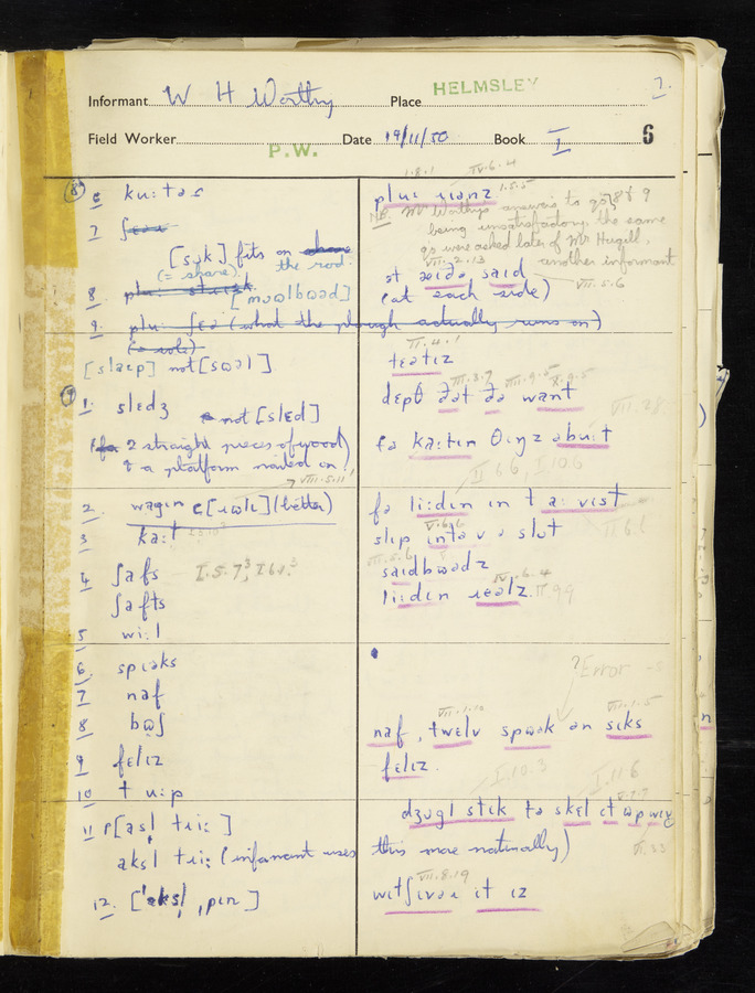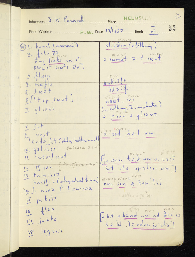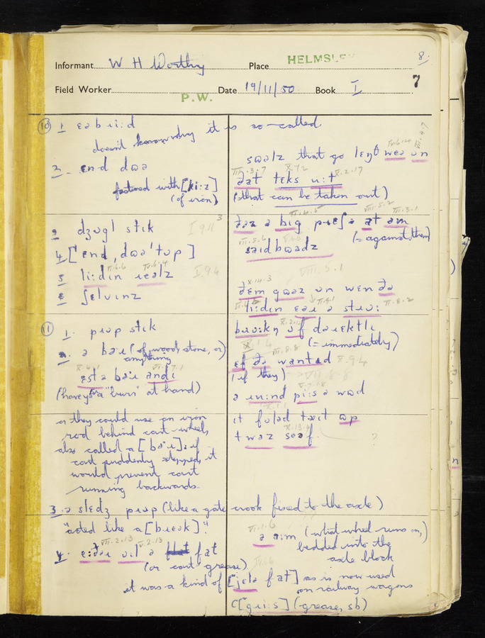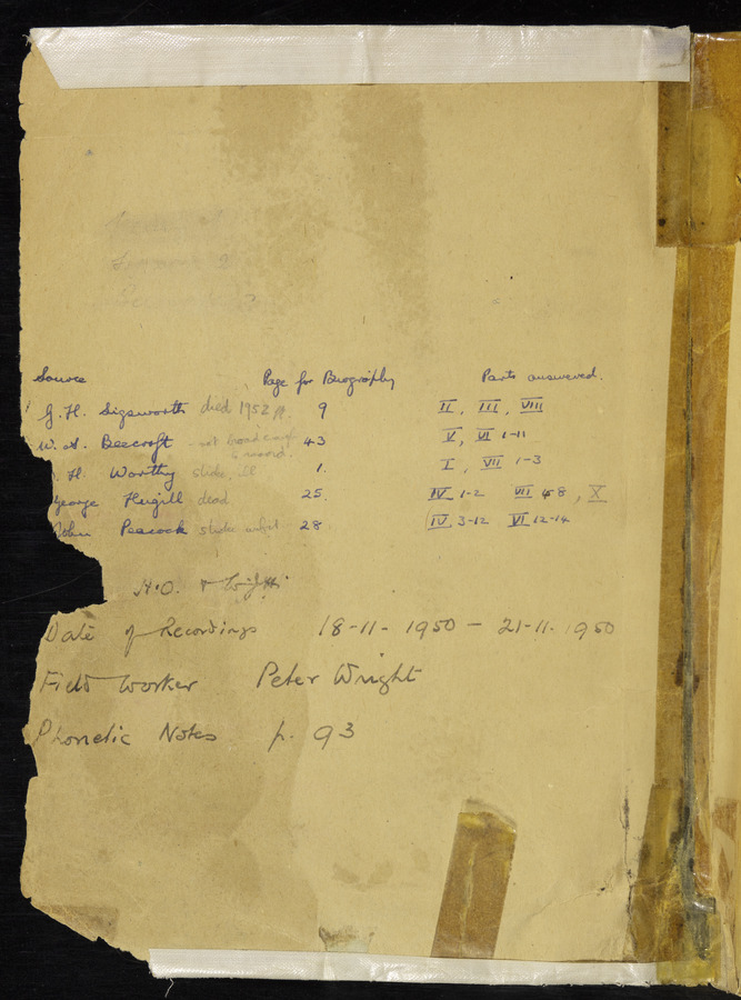 Interviews have been carried out by fieldworker Peter Wright. There are five informants for this response book - George Herbert Sigsworth, W. A. Beecroft, William H. Worthy, George S. Hugill and John William Peacock. Their responses can be found in the following books: George Herbert Sigsworth - II, III, VIII W. A. Beecroft - V, VI William H. Worthy - I, VII George S. Hugill - IV, VII John William Peacock - IV, VI