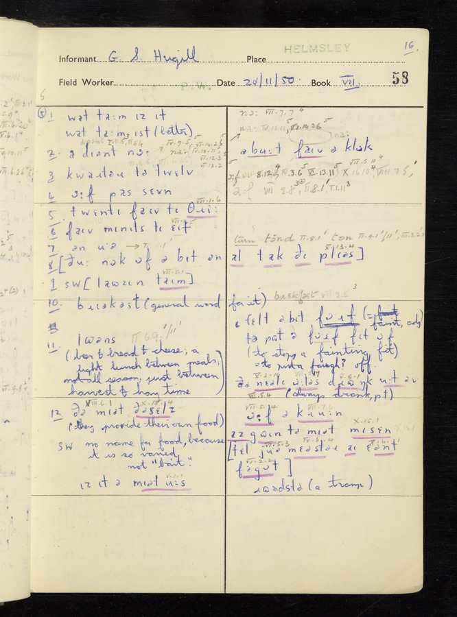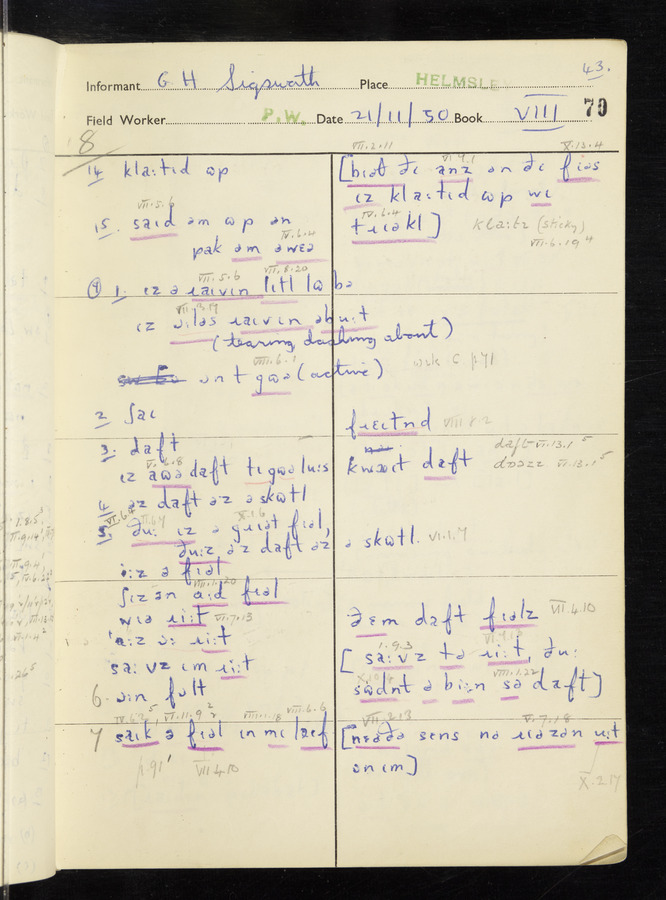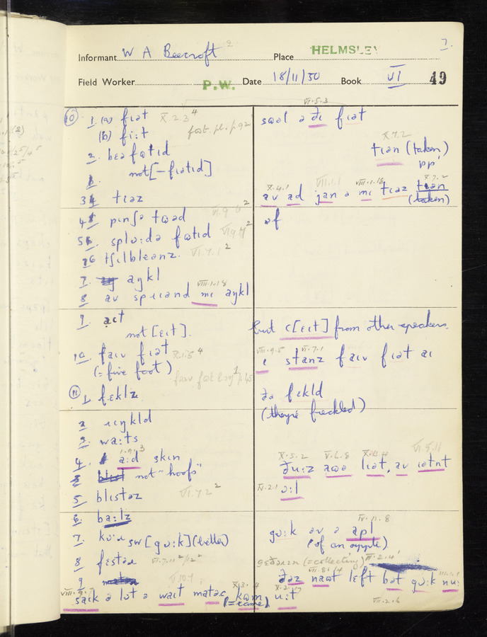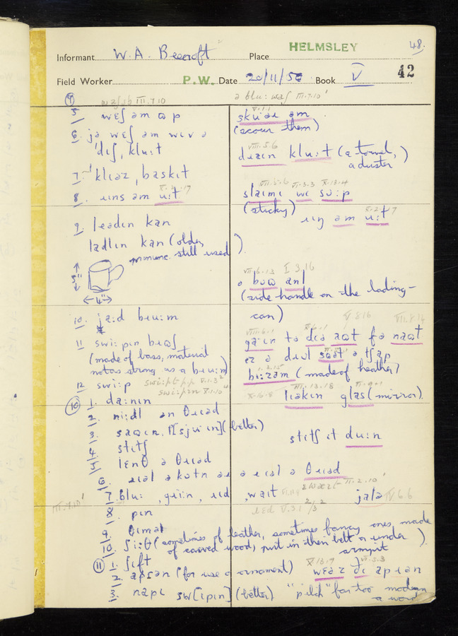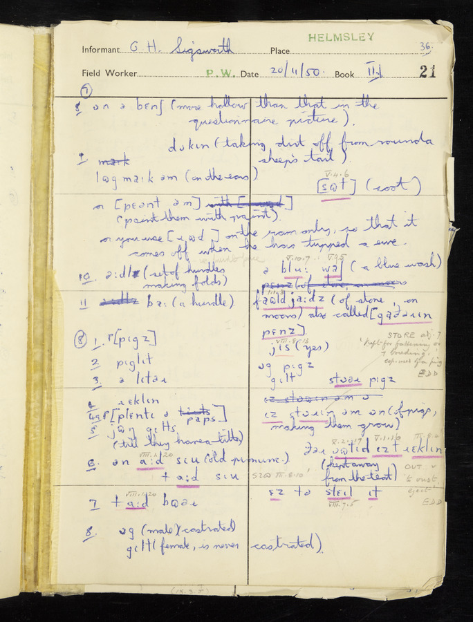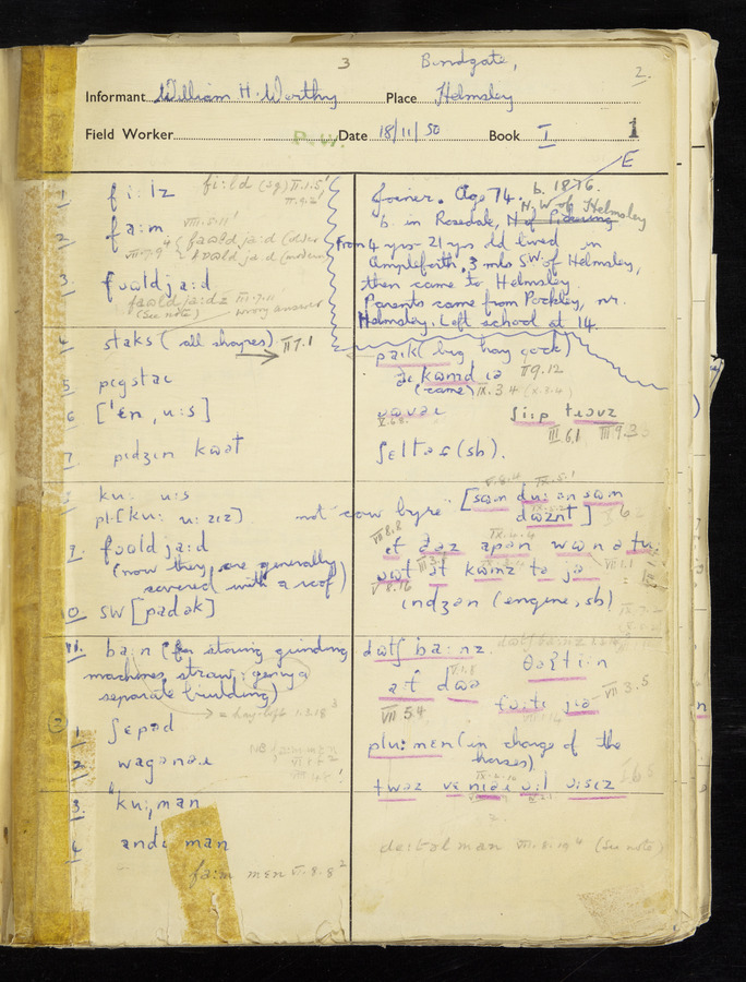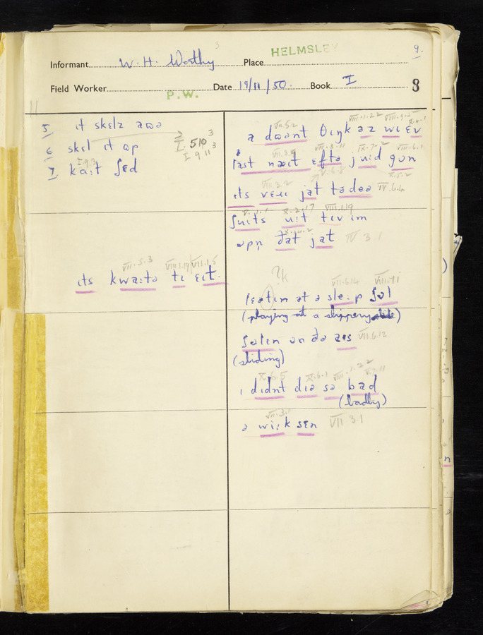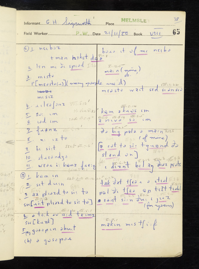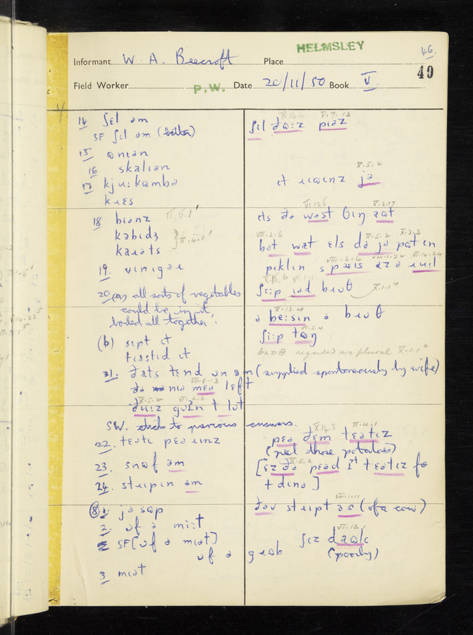 Interviews have been carried out by fieldworker Peter Wright. There are five informants for this response book - George Herbert Sigsworth, W. A. Beecroft, William H. Worthy, George S. Hugill and John William Peacock. Their responses can be found in the following books: George Herbert Sigsworth - II, III, VIII W. A. Beecroft - V, VI William H. Worthy - I, VII George S. Hugill - IV, VII John William Peacock - IV, VI