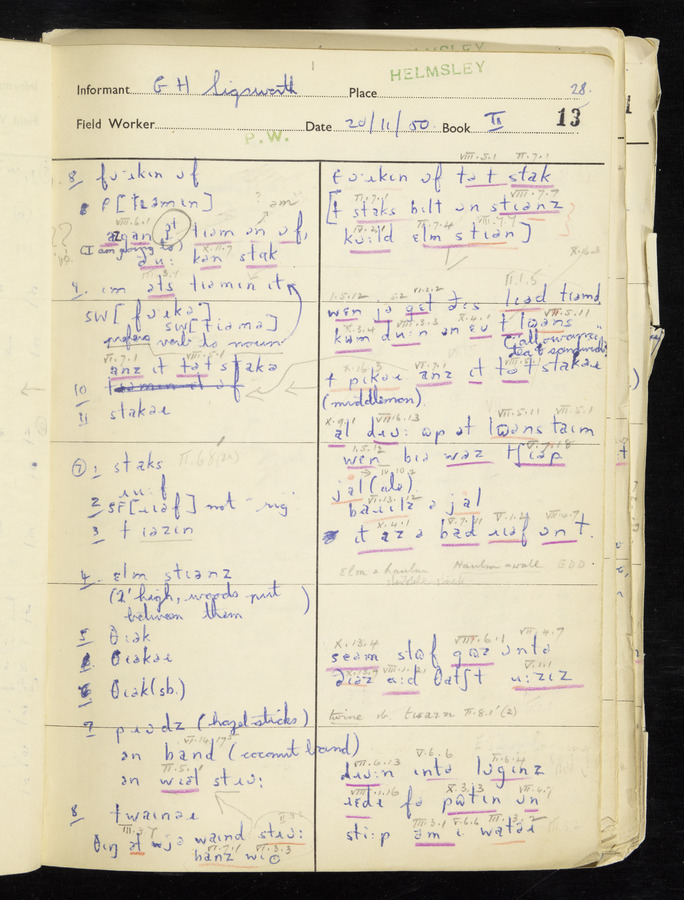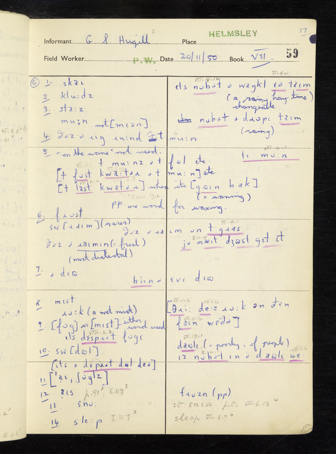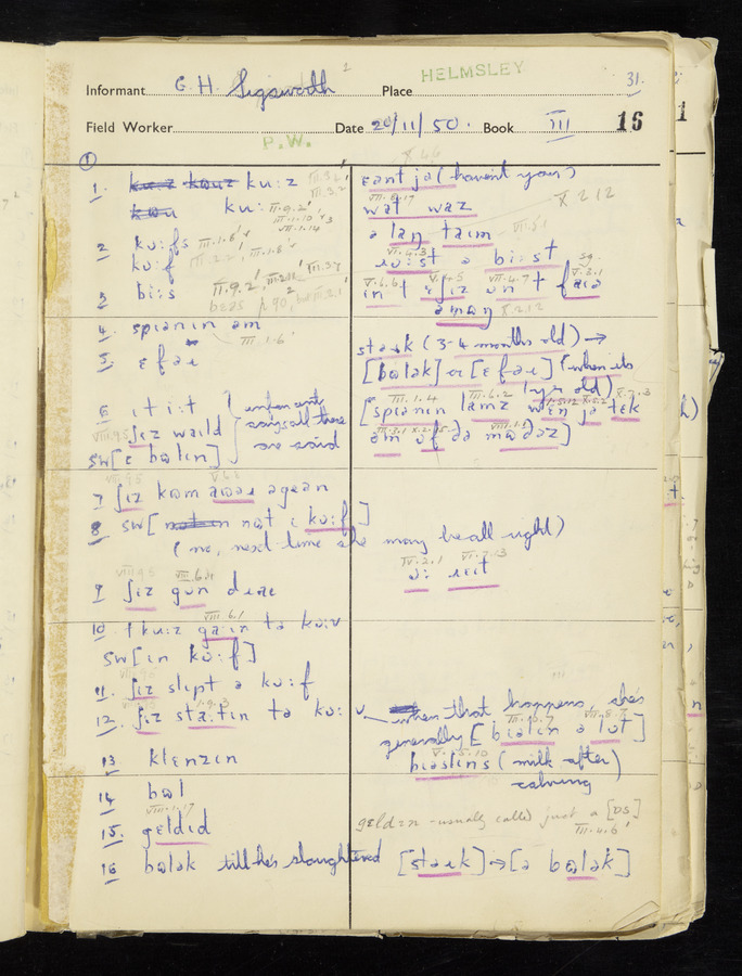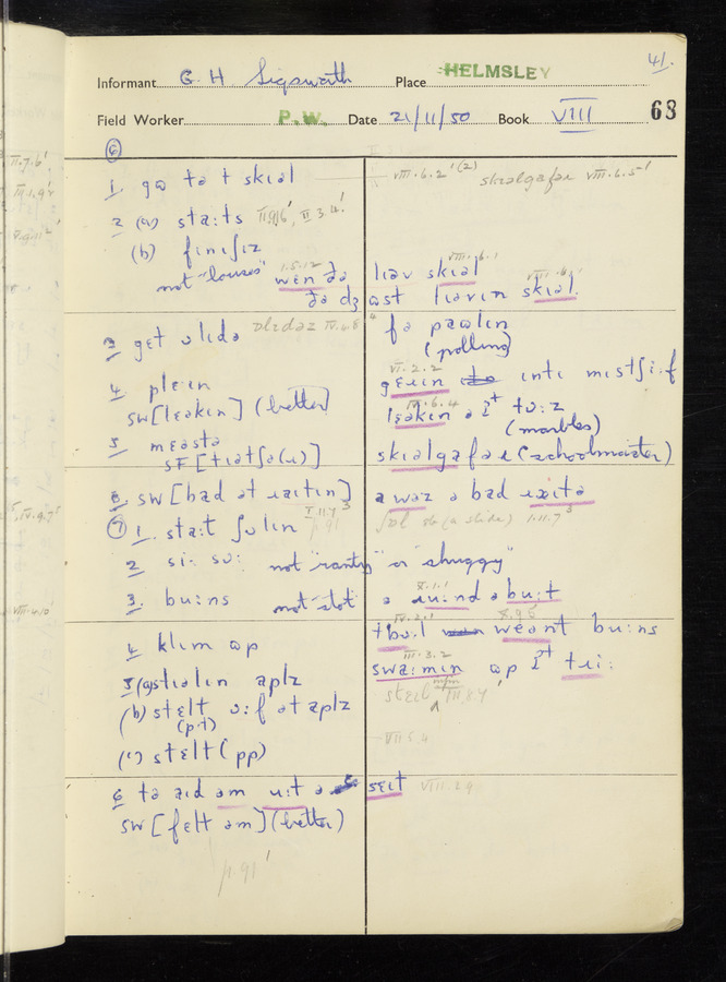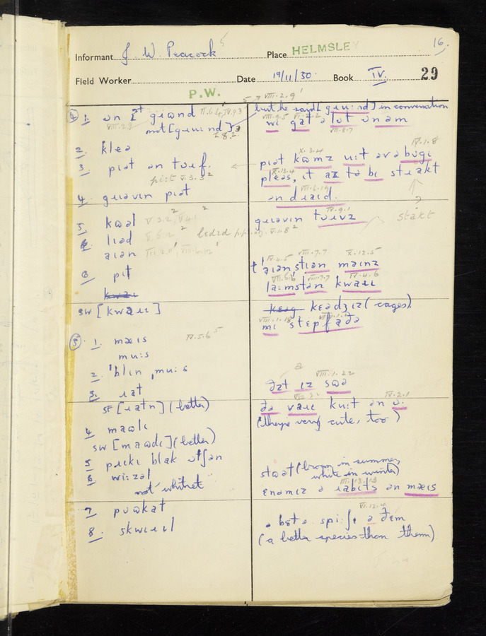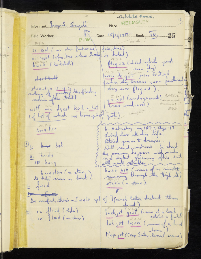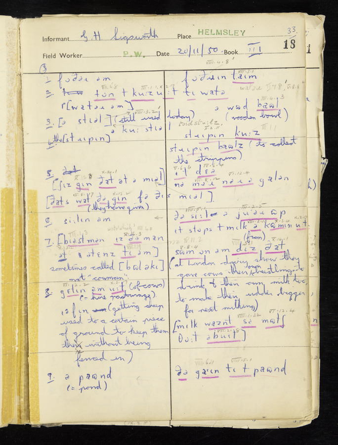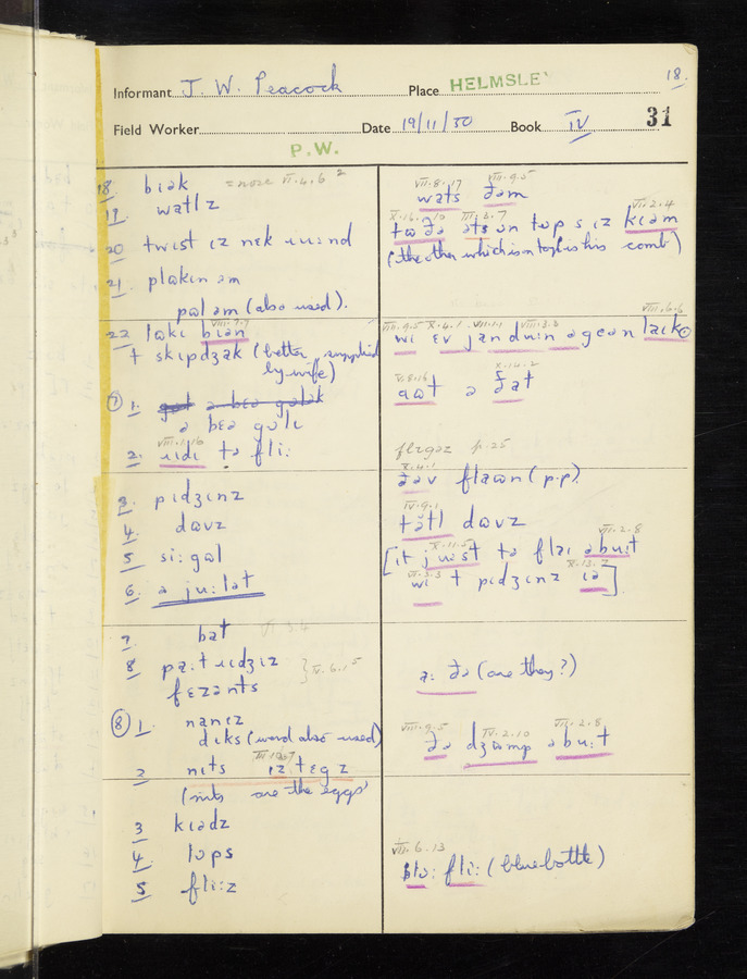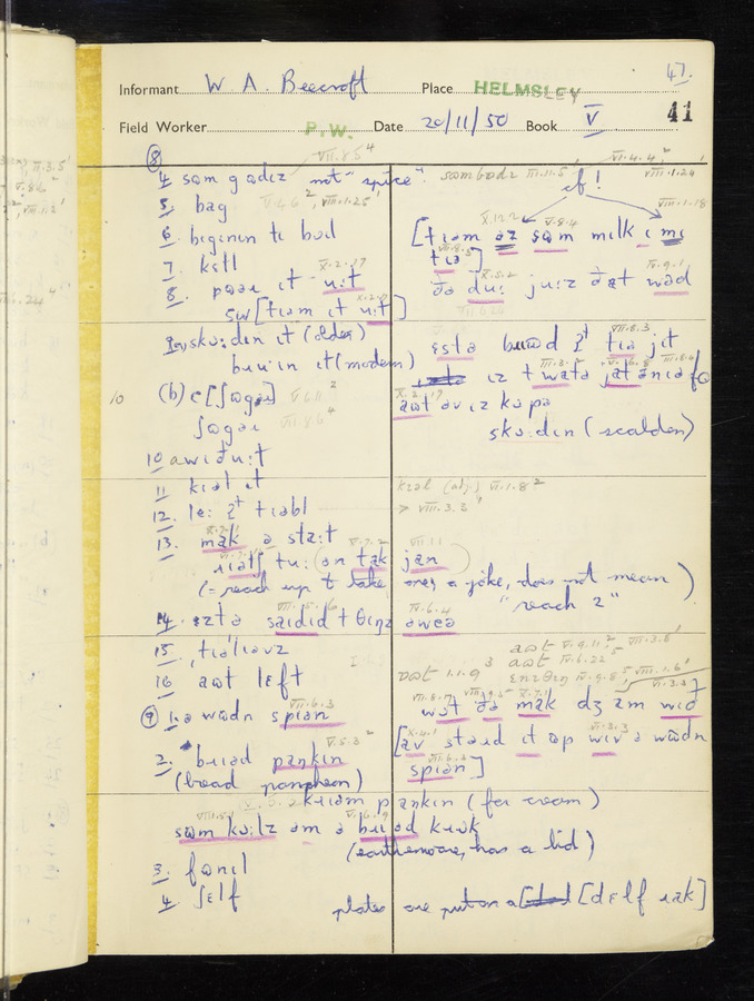 Interviews have been carried out by fieldworker Peter Wright. There are five informants for this response book - George Herbert Sigsworth, W. A. Beecroft, William H. Worthy, George S. Hugill and John William Peacock. Their responses can be found in the following books: George Herbert Sigsworth - II, III, VIII W. A. Beecroft - V, VI William H. Worthy - I, VII George S. Hugill - IV, VII John William Peacock - IV, VI